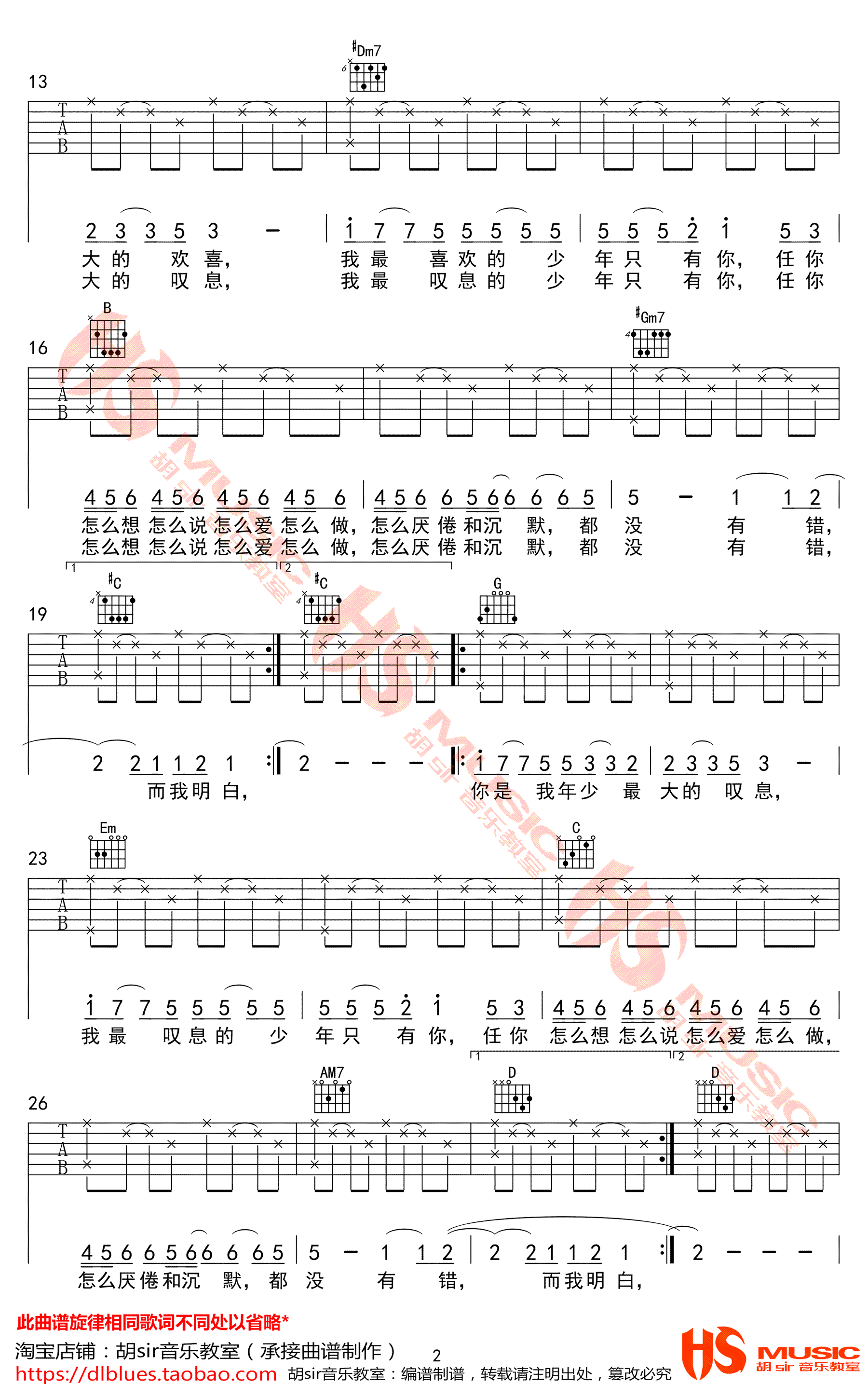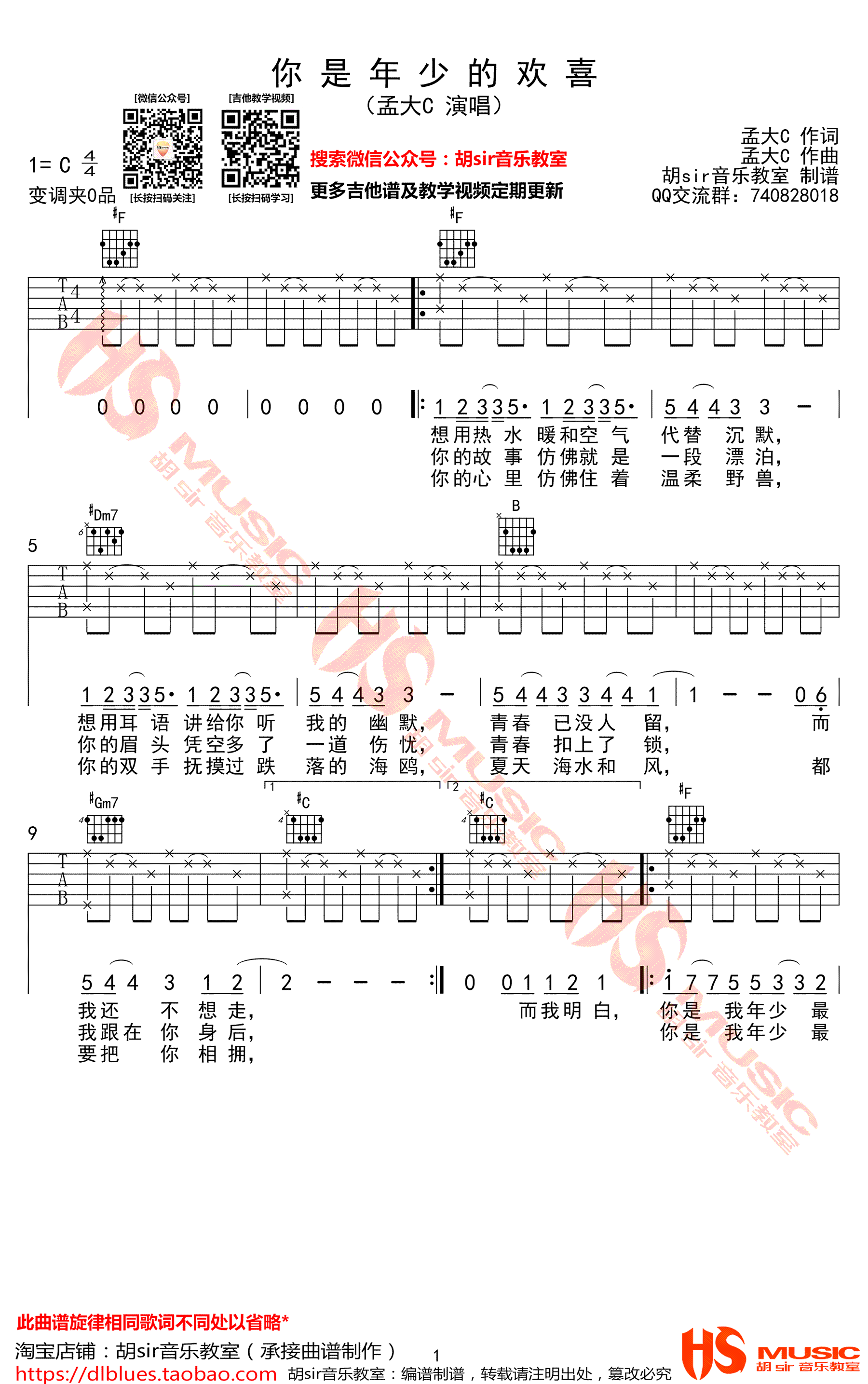 曲谱介绍: 孟大C《你是年少的欢喜》吉他谱,#F转G调,高清弹唱六线谱,胡SIR音乐教室编配出品,老师编配教学辛苦,欢迎琴友们关注支持,一起学习91吉他谱。