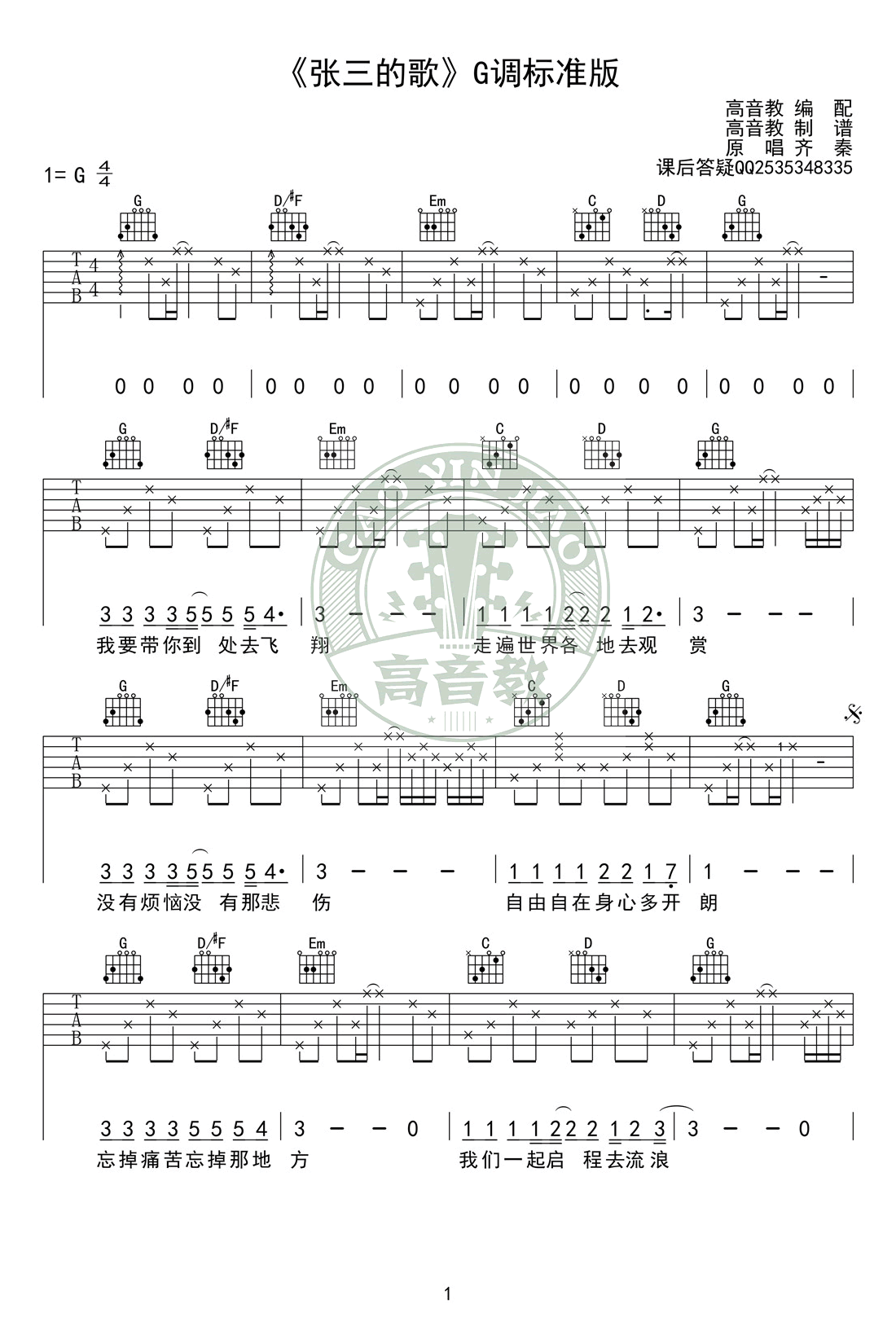 张三的歌吉他谱 - 齐秦 - G调吉他弹唱谱
