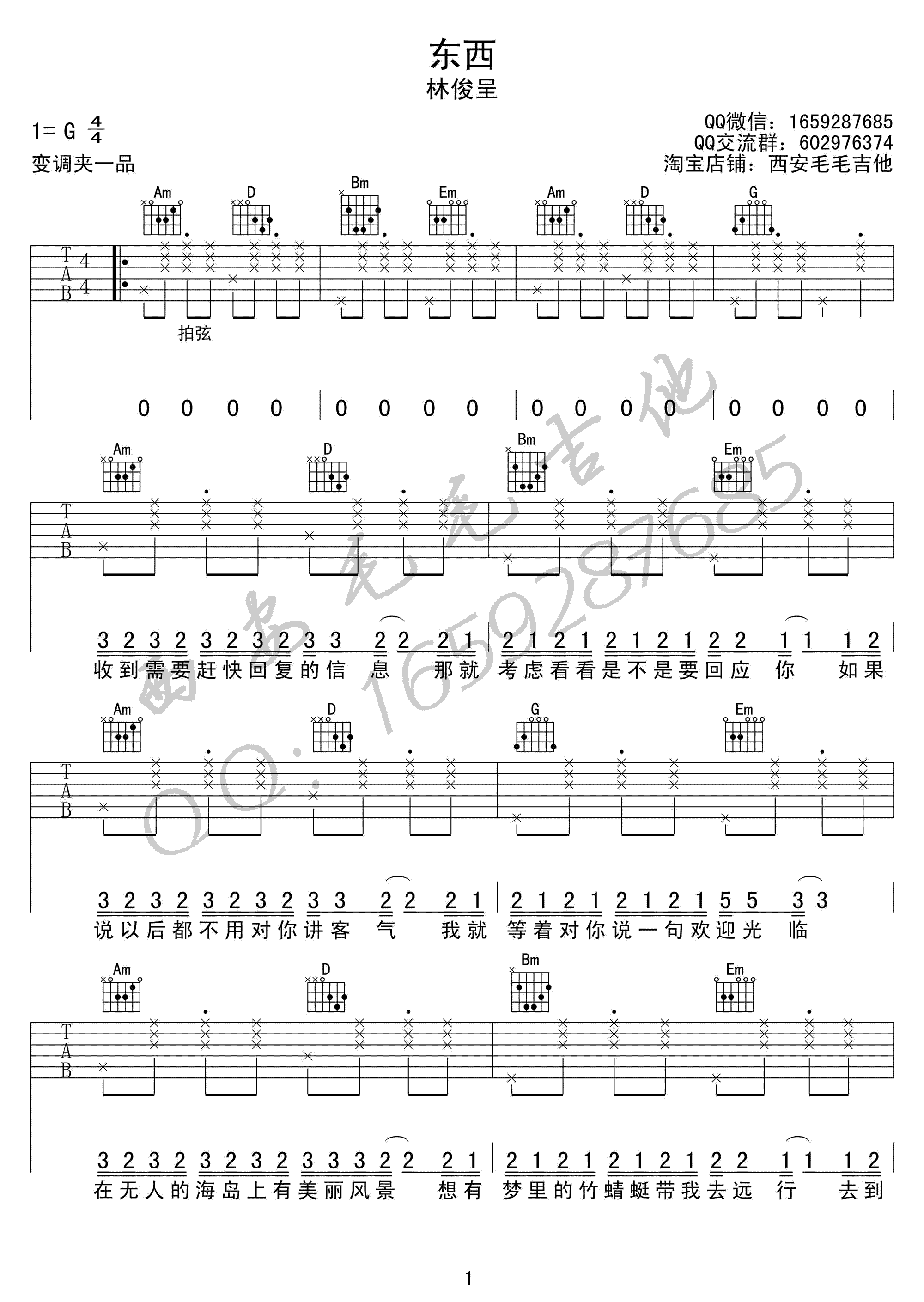 曲谱介绍: 林俊呈 东西吉他谱,G调弹唱谱,变调夹夹一品,一首好听的甜蜜情歌,东西六线谱,高清图片谱,毛毛吉他编配出品。 很少听到这种甜甜的歌颂美好爱情的歌曲了,温暖的嗓音,清新浪漫的旋律,每句话都有浓浓的爱意啊,东或西都有你。
