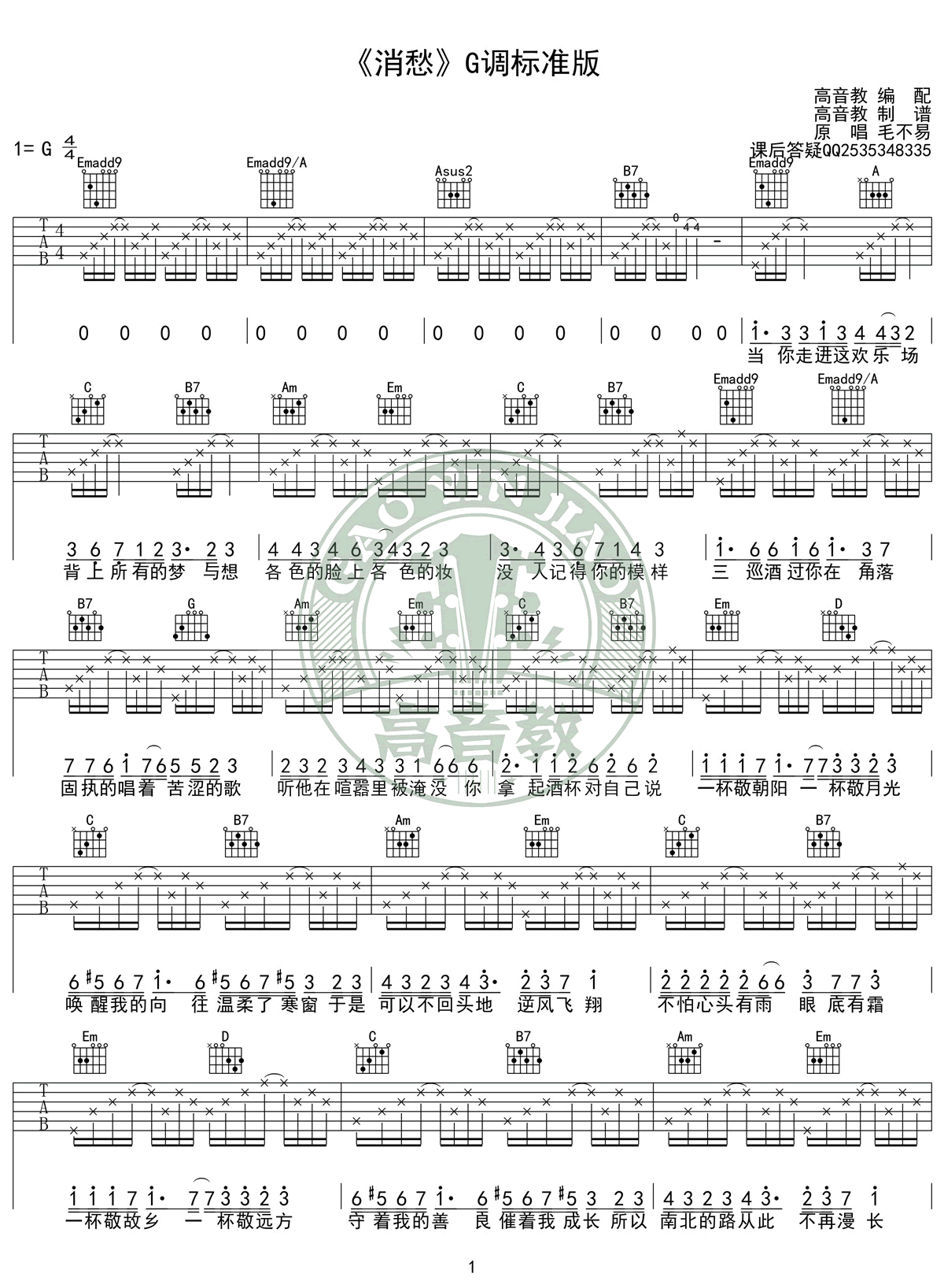 曲谱介绍: 消愁吉他谱,毛不易的代表作品,一首感人扎心的原创歌曲,消愁六线谱,G调吉他弹唱谱,标准版编配,高音教出品,91吉他谱网站上传分享。 这首歌在《明日之子》第一季首唱,歌词尤其能打动我们,八杯酒仿佛道尽了人的一生。歌声把把无奈感伤压在低处,隐在暗里,唱出举杯痛饮的释怀,也有自斟自饮的洒脱。