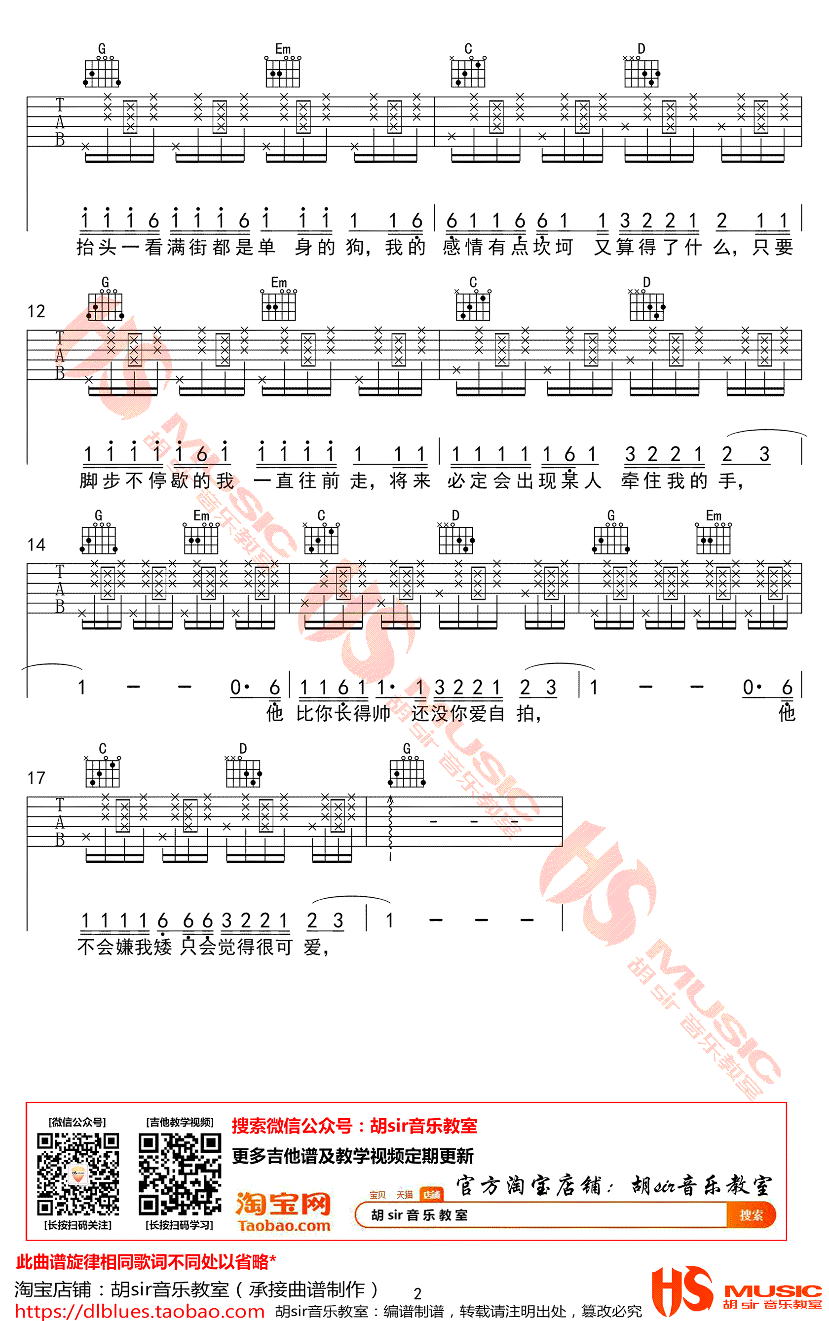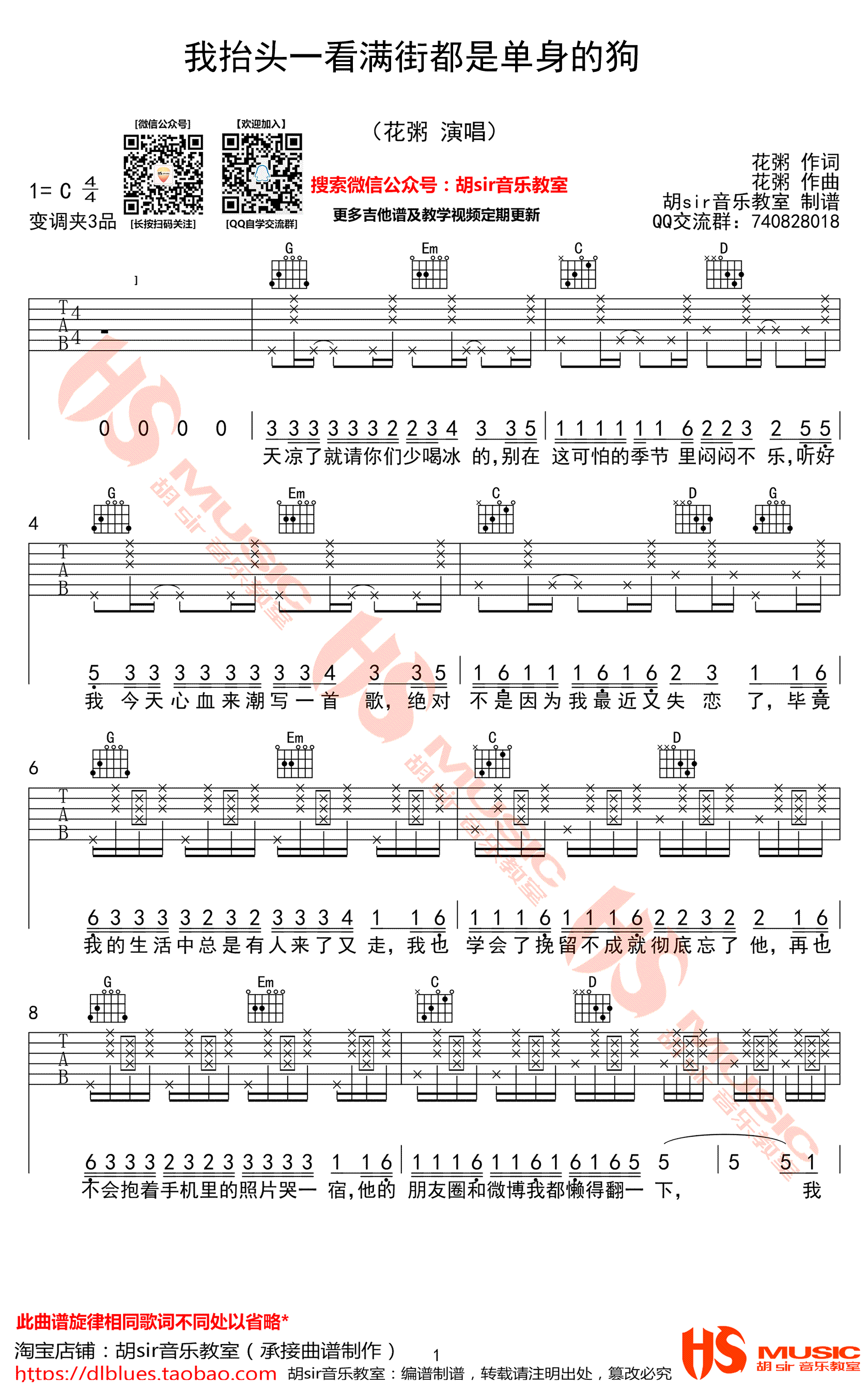 曲谱介绍: 我抬头一看满街都是单身的狗吉他谱,花粥的一首民谣歌曲,C调指法,变调夹夹第三品,我抬头一看满街都是单身狗六线谱,高清图片谱,感谢胡sir音乐教室出品,91吉他谱首发推荐。 花粥小姐姐的歌很高产也一直很好听,这首词曲创作的新歌叫做《我抬头一看满街都是单身的狗》,还真是随性呢,每一首歌都是一段生活状态,我低头一看自己也是单身的一只狗……刷的时候循环了好多遍。