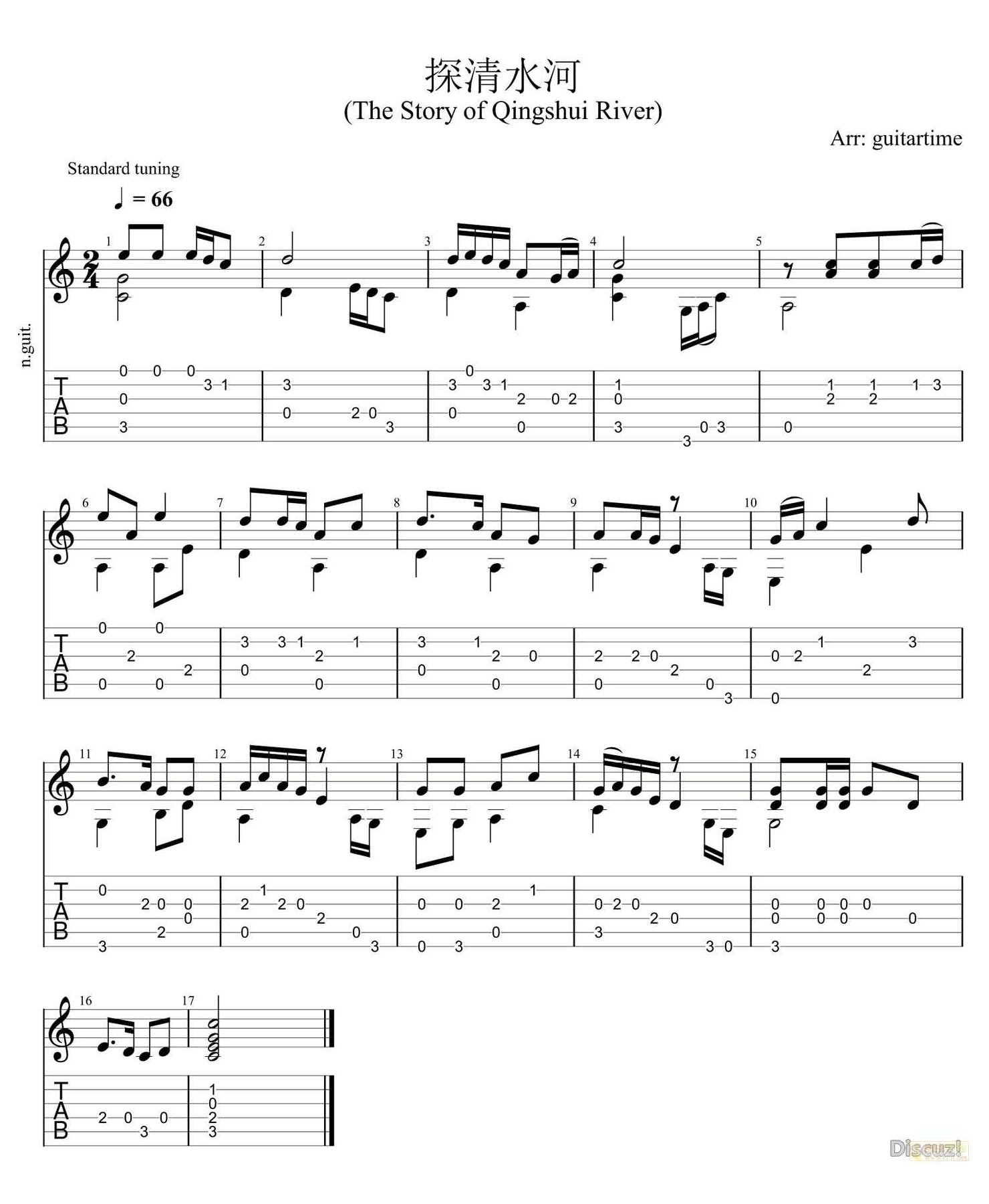 曲谱介绍: 探清水河指弹谱,根据张云雷演唱的《探清水河》改编,一首让人回味无穷的京城小曲,探清水河吉他指弹独奏谱,图片谱由Guitartime编配制谱,91吉他谱网站上传分享。 充满着浓浓京韵味儿的旋律,加之婉转悠扬演绎出背后那一段悲剧感伤的故事,让人对这小调充满了喜爱。