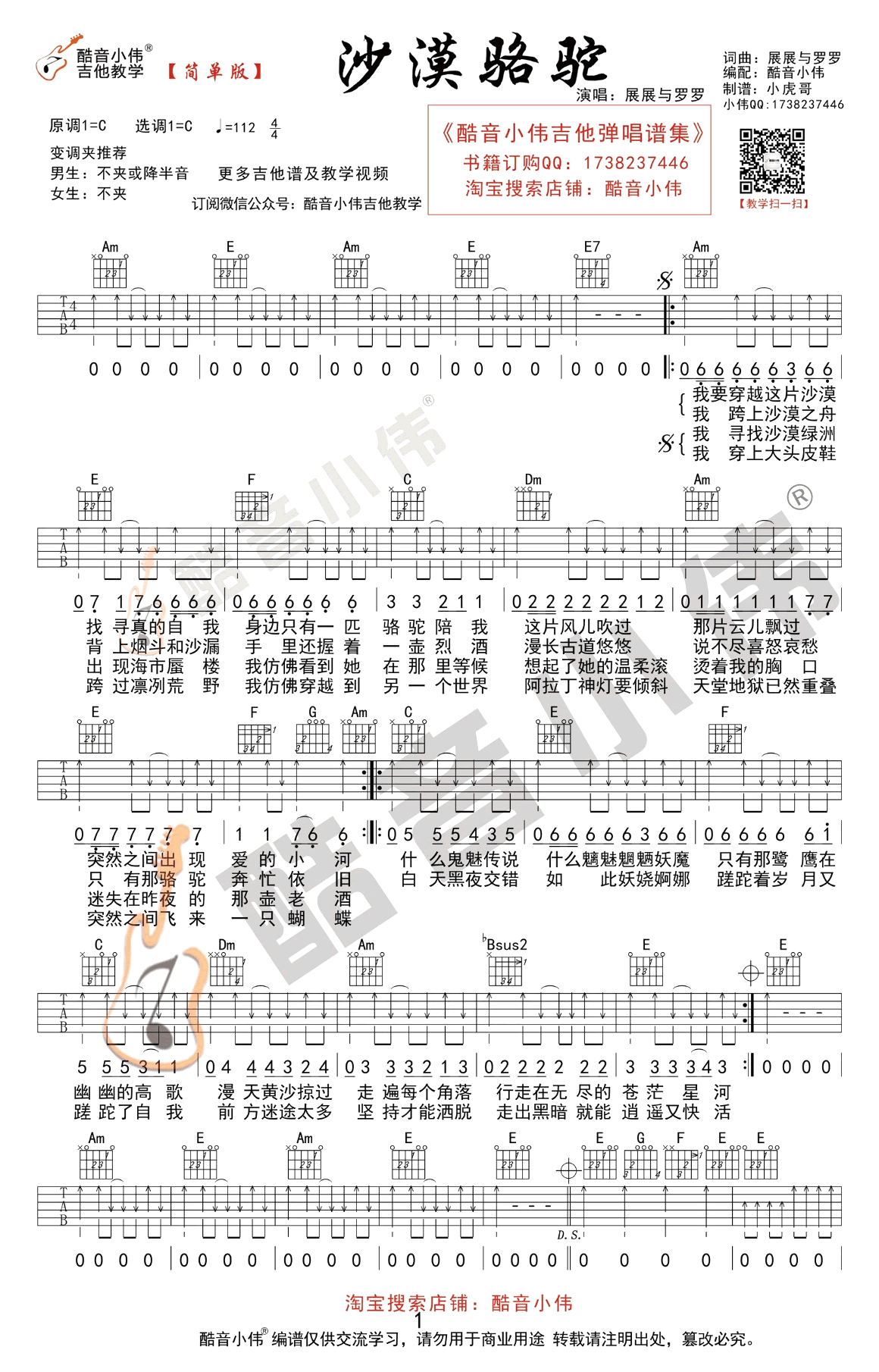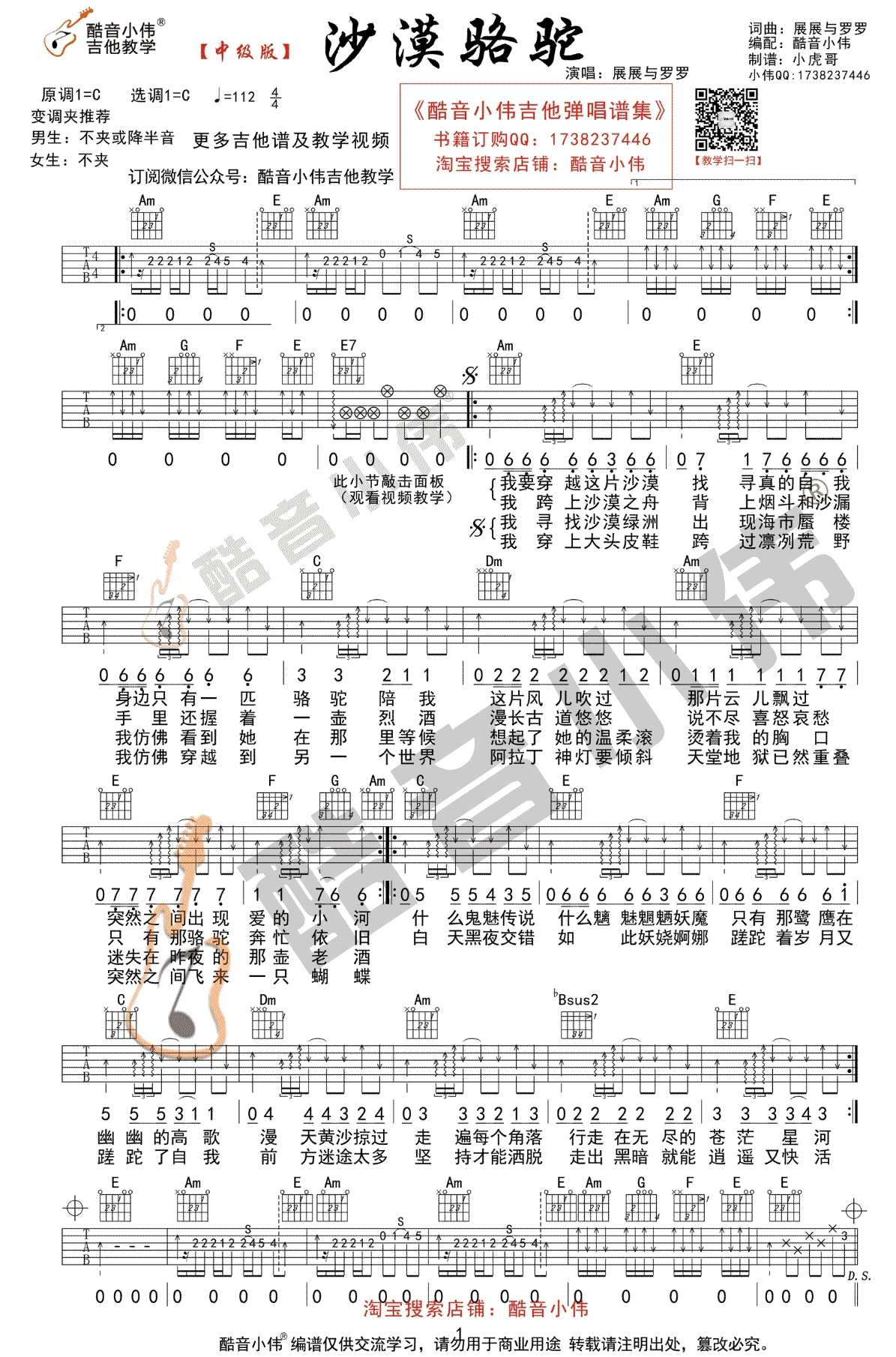 曲谱介绍: 沙漠骆驼吉他谱,C调指法编配,展展与罗罗演唱的一首网络热门歌曲,沙漠骆驼六线谱,本曲谱分为简单版和中级版,方便琴友们选择练习。酷音小伟出品,91吉他谱网站推荐分享。随谱附上吉他弹唱演示及视频教学,喜欢这首歌曲的琴友们跟随老师的讲解示范学习。