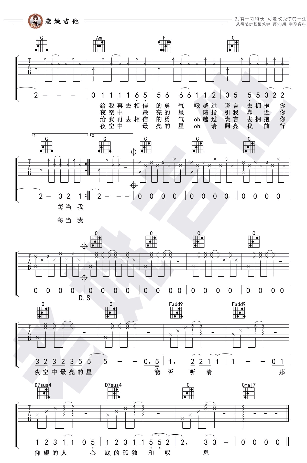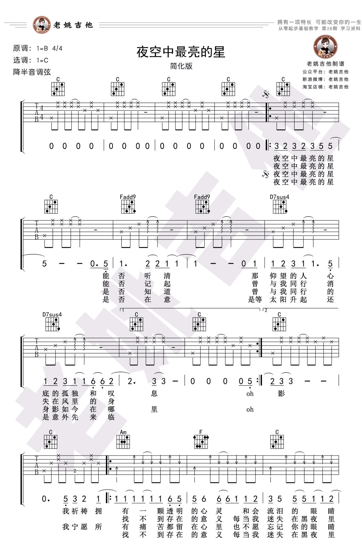 曲谱介绍: 夜空中最亮的星吉他谱,C调简化版,降半音调弦,逃跑计划的代表歌曲,夜空中最亮的星六线谱,图片谱高清版,老姚吉他编配出品,本期基础教学课堂配套教学视频,主要讲解手指扫弦练习,琴友们跟随老师的示范视频学习。夜空中最亮的星——温暖、明亮、指引着你前行,在茫茫未知前行的路上,找到奋斗的意义。