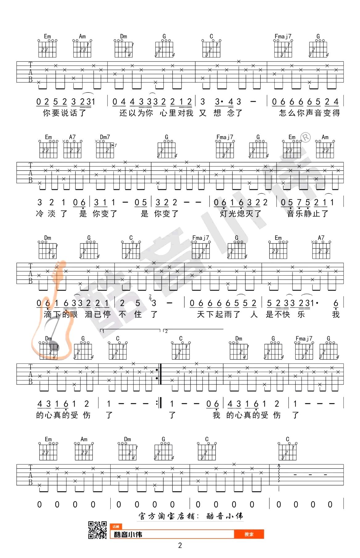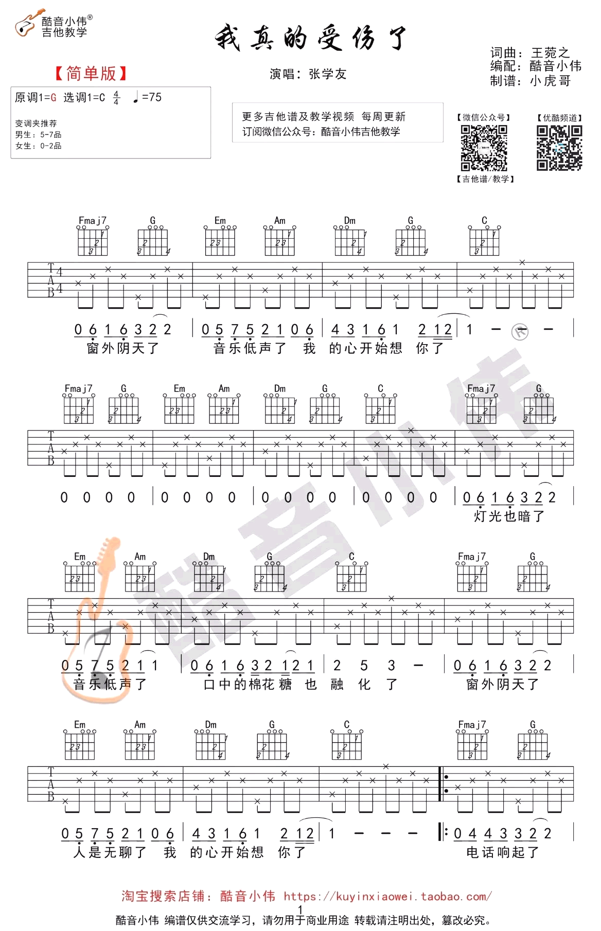 曲谱介绍: 我真的受伤了吉他谱,张学友经典情歌弹唱谱,田馥甄的翻唱女生版也让听者心痛。我真的受伤了六线谱,原调G选调C,简单版编配,变调夹推荐男生5-7品,女生0-2品,两张图片谱,感谢酷音小伟出品,91吉他谱网站上传。