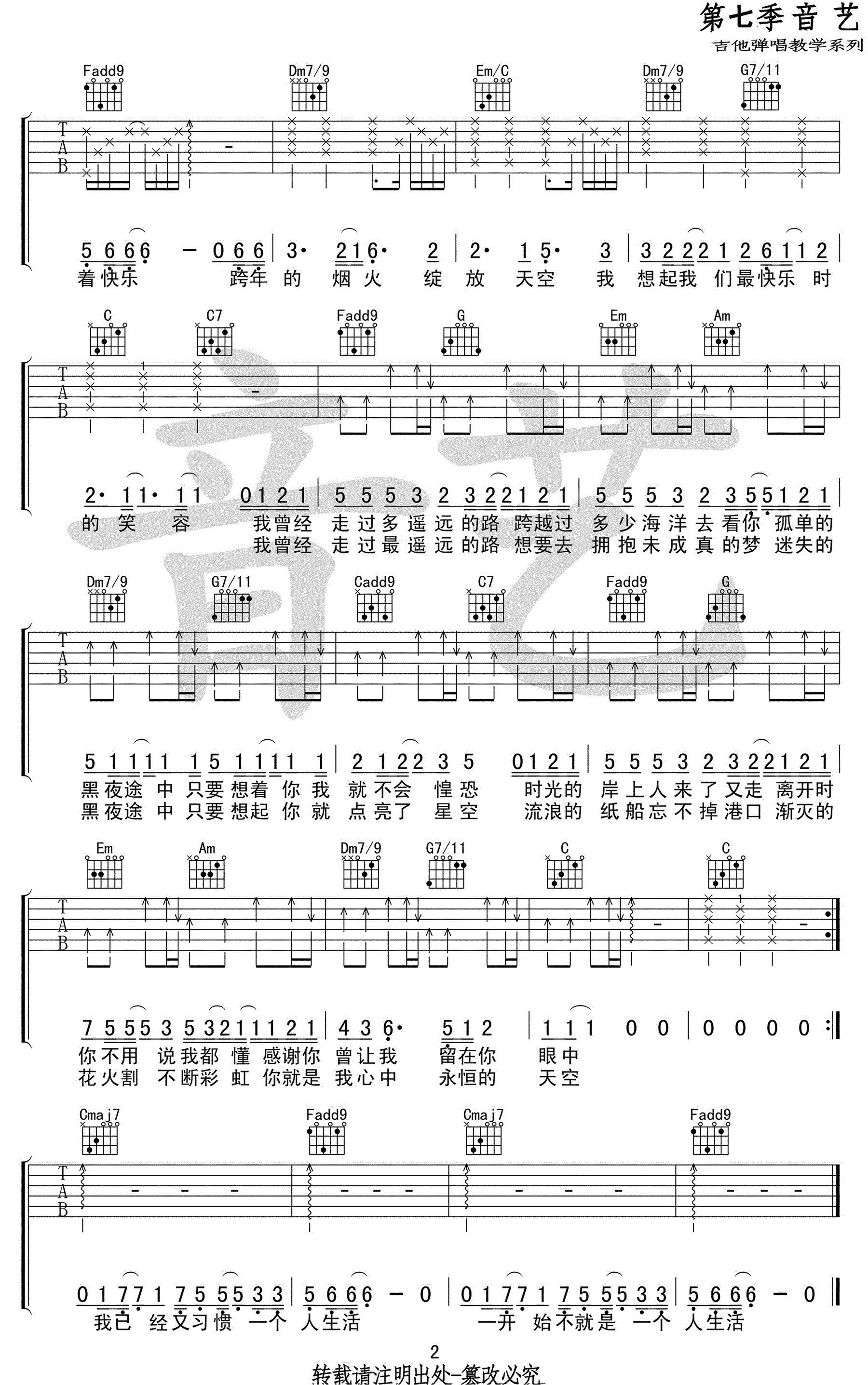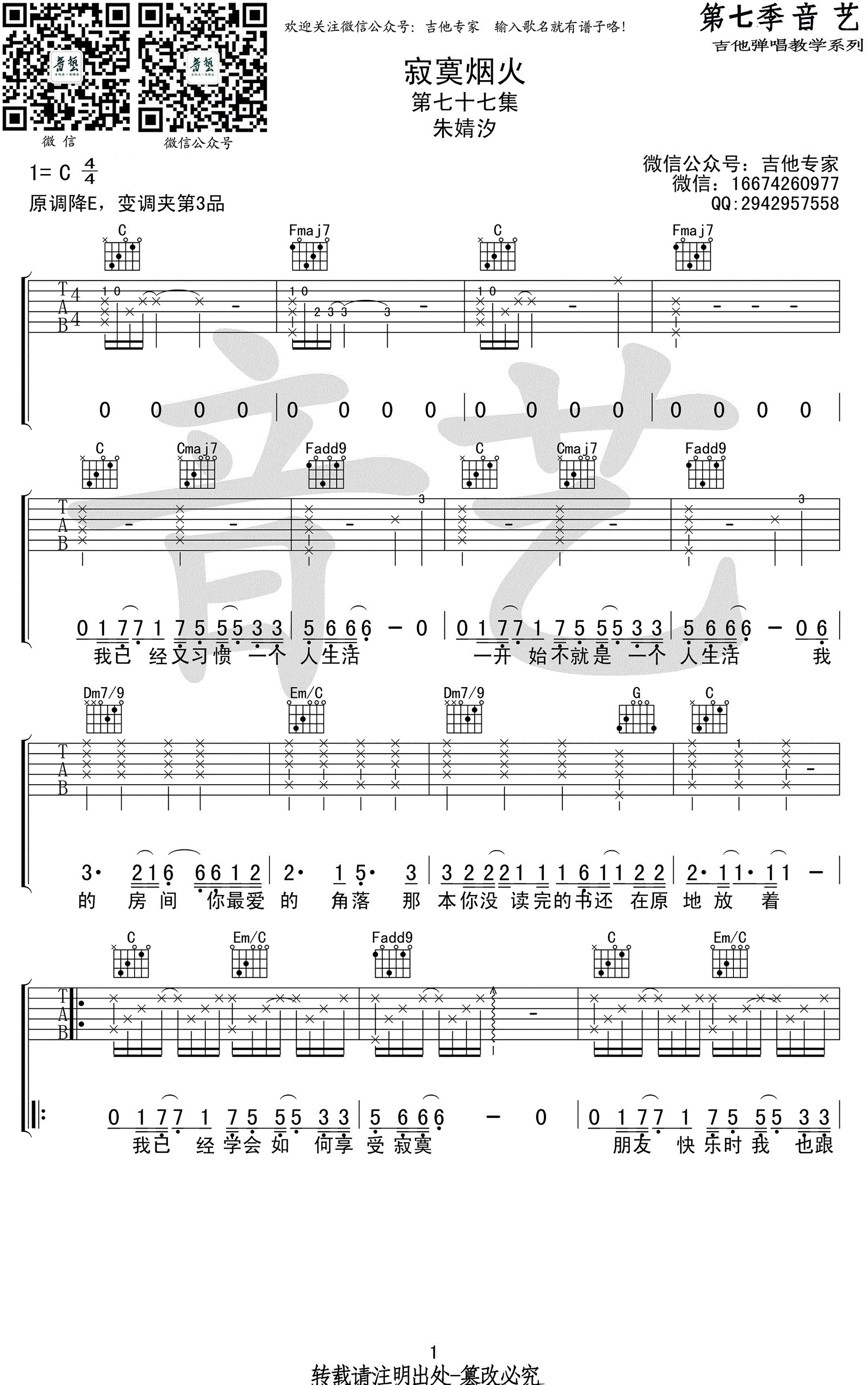 曲谱介绍: 寂寞烟火吉他谱,朱婧汐演唱的一首词曲原创作品,原调降E,变调夹夹第三品,选用C调指法编配,寂寞烟火六线谱,高清弹唱图片谱,音艺出品,91吉他谱网站上传分享。 这首情歌是献给熙攘世界里的孤单男女最温暖的慰藉,失恋后的一个人安静的生活,倔强和想念,也有感谢与豁达。