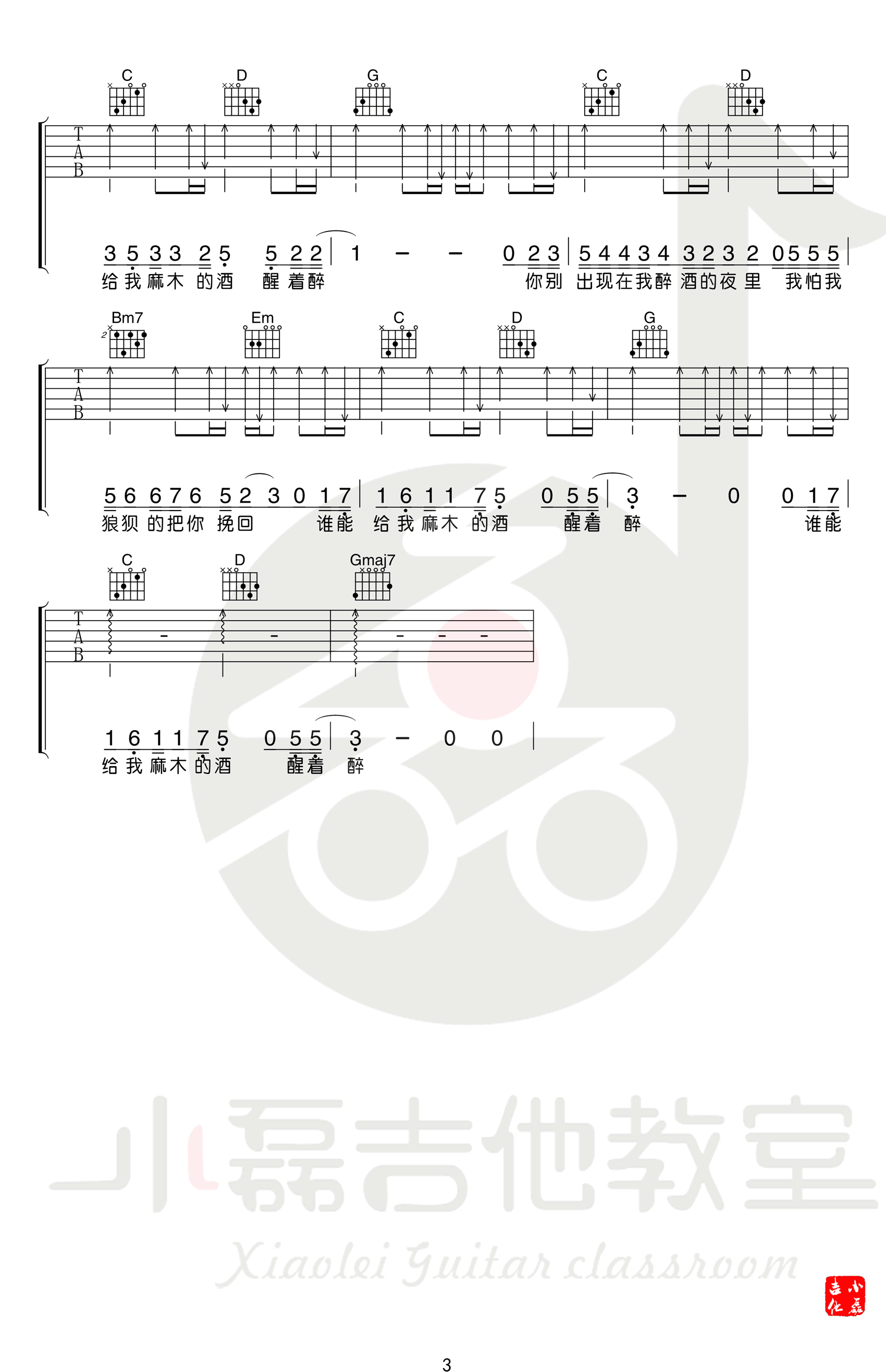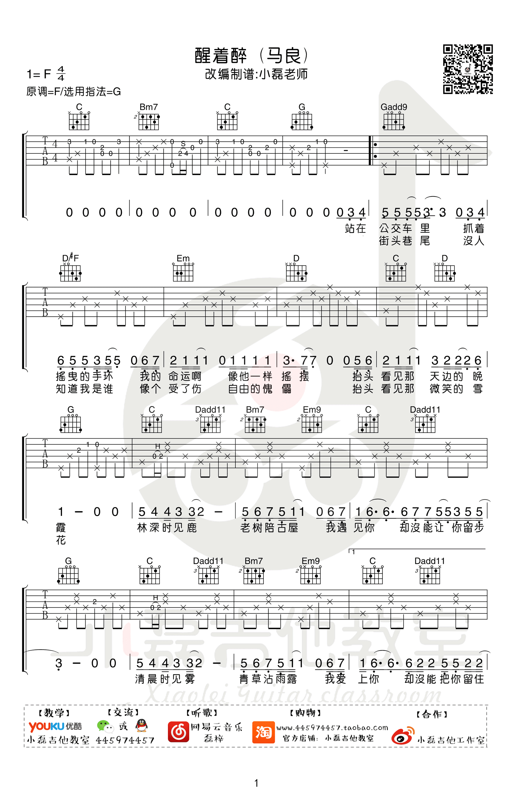 曲谱介绍: 马良《醒着醉》吉他谱,原调F,选用C调指法,小磊吉他编配出品。关于乐谱与教学! 这首歌原版是F调的,所以大家可以在网上看到大量的乐谱是C调指法,变调夹夹在5品的乐谱! 这也是目前做乐谱的常态,大家都太固守规则了! 老师制作的这个乐谱是G调指法,相比原版的F调属于升了一个整调,但是实际演唱发现,并没有觉得唱不上去,因为原版也不高! 我们如果用C调指法,变调夹在5品的话,吉他的声音由于变调夹品位太高,声音注定会很尖锐,所以这里我们用到G调指法,比较合适! 乐谱定调直接可以影响一首歌的指法以及和弦编排!不代表原调就是合适的,而要为弹唱服务,只要唱着舒服,其次才要考虑指法调式! 这首歌的学习重点在于前奏与间奏,还有一些过门的小细节,整体难度不是很高,歌曲也偏慢速,所以很适合民谣范儿的同学作为小众拿手曲目收藏起来! 难度:4级