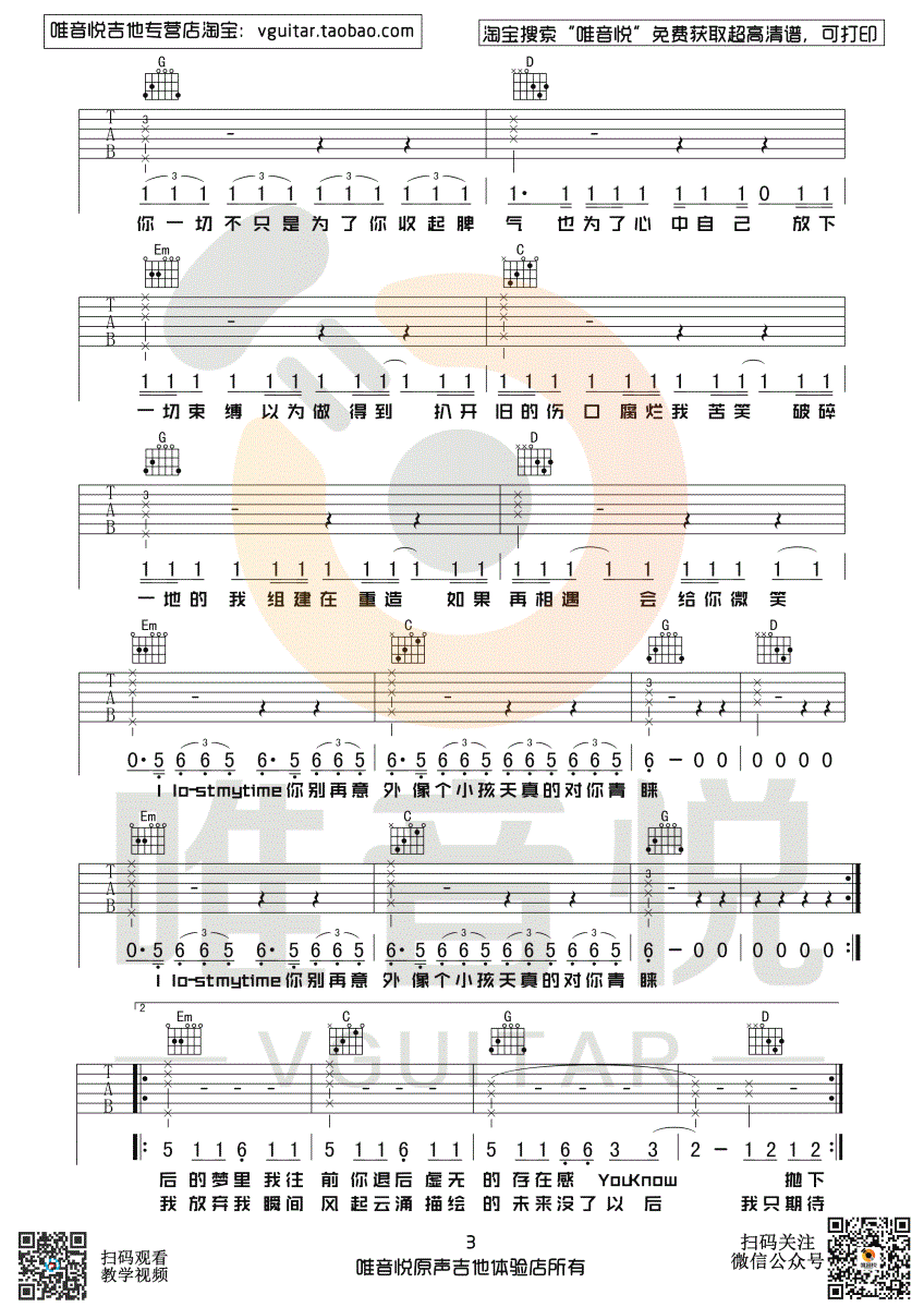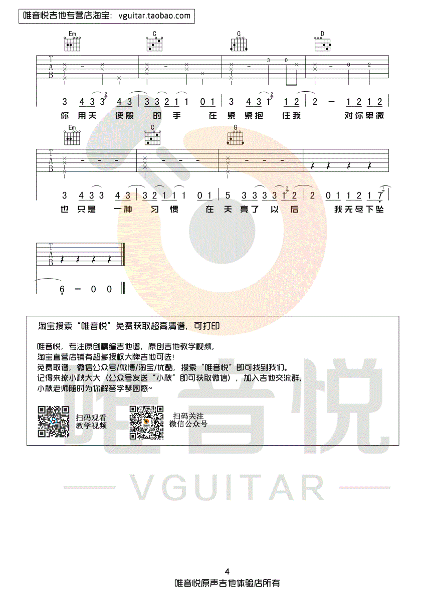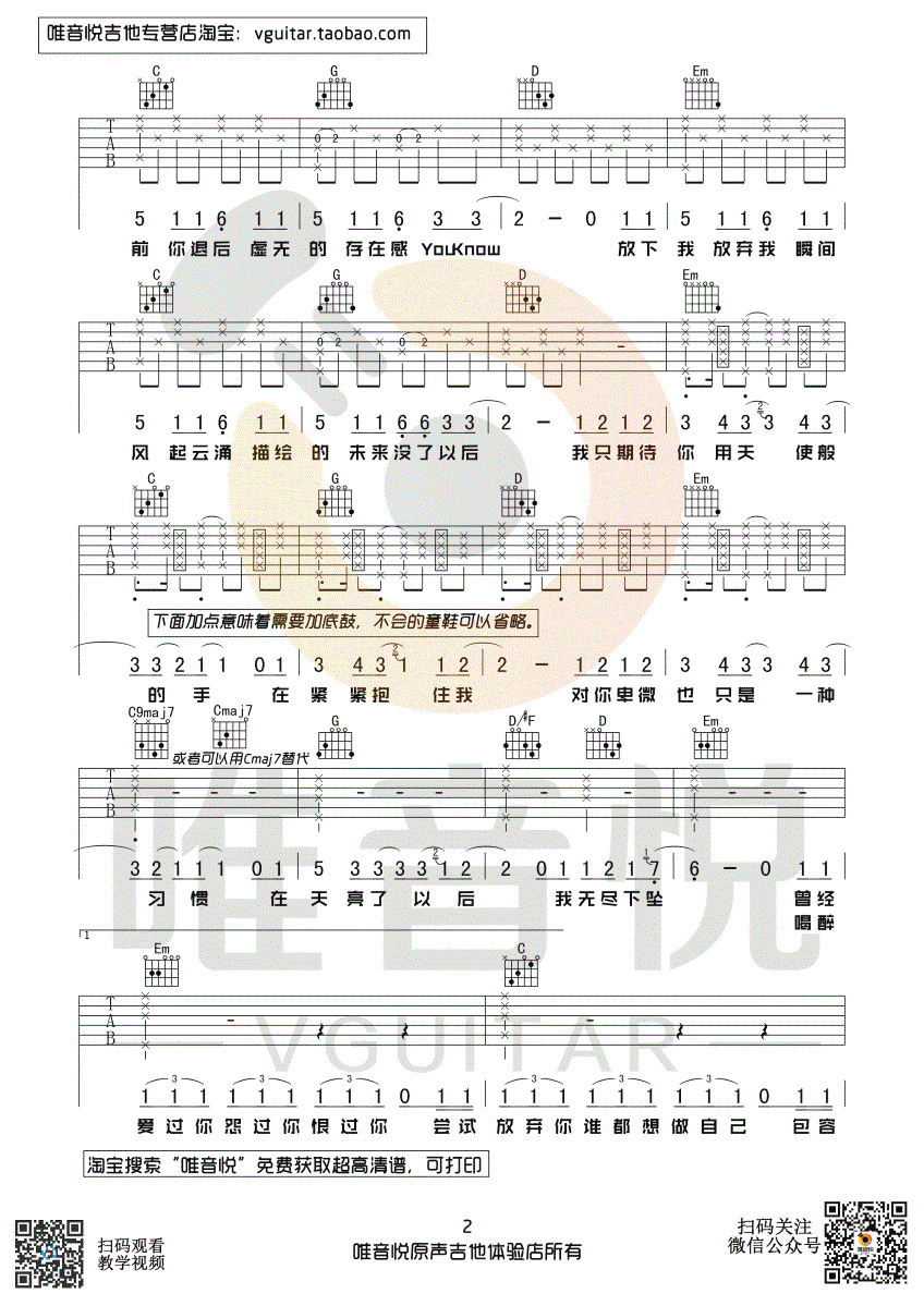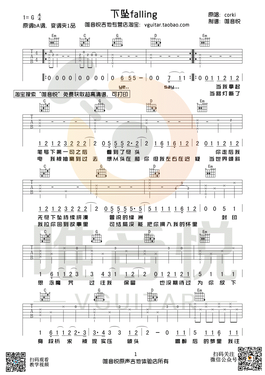 曲谱介绍: 下坠falling吉他谱,CORKI演唱的一首抖音热门歌曲,下坠吉他六线谱,原调bA,变调夹夹一品,选用G调指法,四张图片谱,感谢唯音悦编配出品,91吉他谱网站分享。 歌曲分析:歌曲走向很简单,Em->C->G->D 循环。主歌、副歌和弦架构是一样的,节奏型做了一些变化,如果想立刻开始弹唱,也可直接用统一的节奏型~~主歌部分基本是柱式和弦走完一个小节即可,副歌部分节奏型是附点+拍弦的节奏型,附点的节奏型相对来说会比较难~