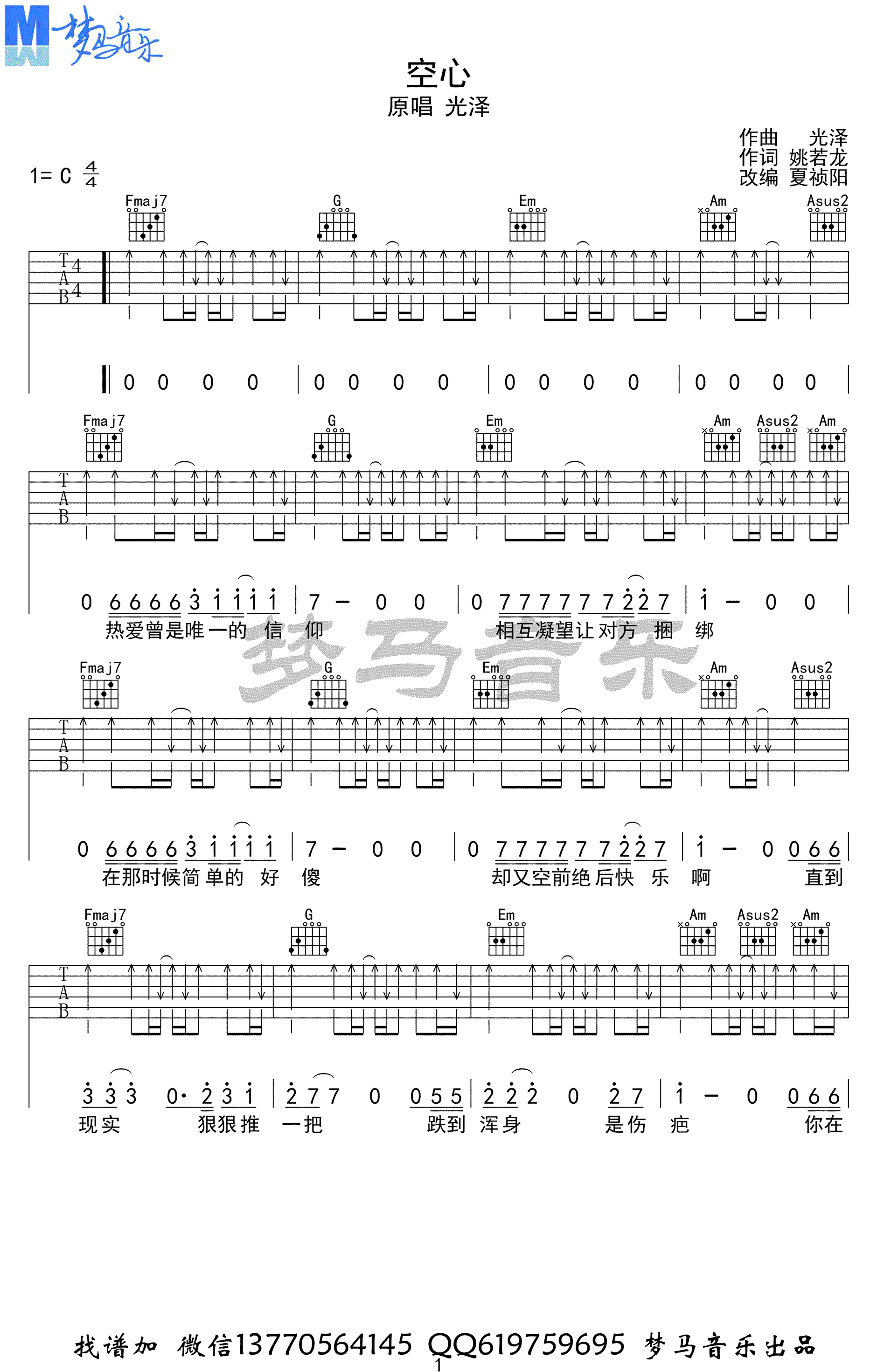 曲谱介绍: 空心吉他谱,光泽的一首歌曲,C调指法,高清弹唱谱,空心六线谱,完整版共五张图片谱例。感谢梦马音乐出品,91吉他谱网站更新分享。夏祯阳老师要点讲解:这首歌曲整首歌都是四个和弦在不断的循环重复,很简单。节奏都是差不多的扫弦,略有变化。结尾部分因为我怕太单调,就扒了一下原曲的结尾旋律。开头部分的旋律是我自己加的,也是为了让歌曲更丰富一点。开头和结尾在谱子里没有写出来,就当我的一点保留吧。