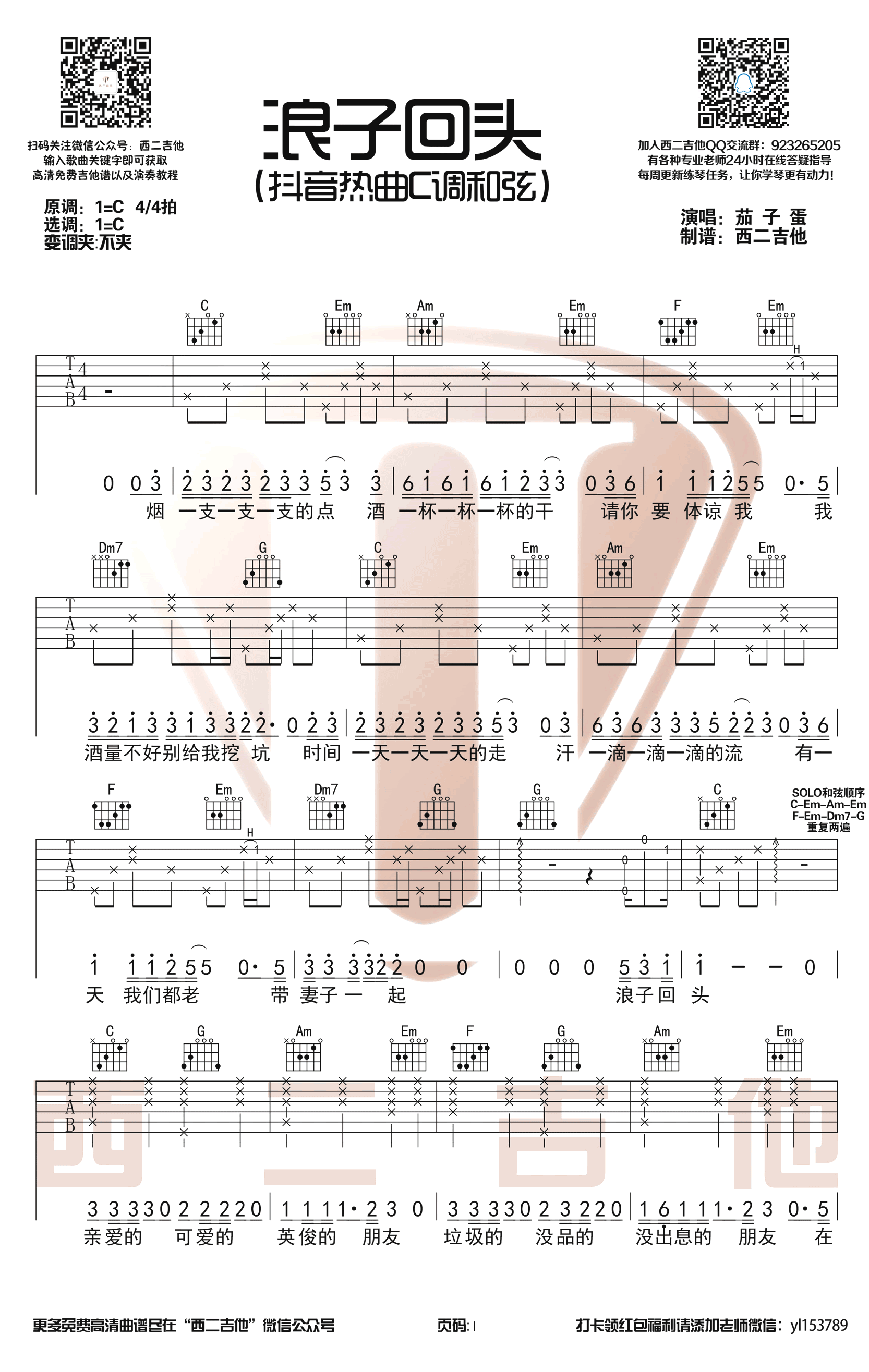 曲谱介绍: 浪子回头吉他谱,C调弹唱谱,茄子蛋一首最近超火的闽南语歌曲。浪子回头吉他六线谱,高清图片谱,感谢西二吉他出品,91吉他谱网站上传。 曲谱编配的比较简单,男生唱比较适合,女生弹唱可以选择变调夹5-7品。对于闽南语不会的琴友来说,这首歌的歌词可以说是相当有难度了,在页面下方附上音译歌词,方便大家参照练习。