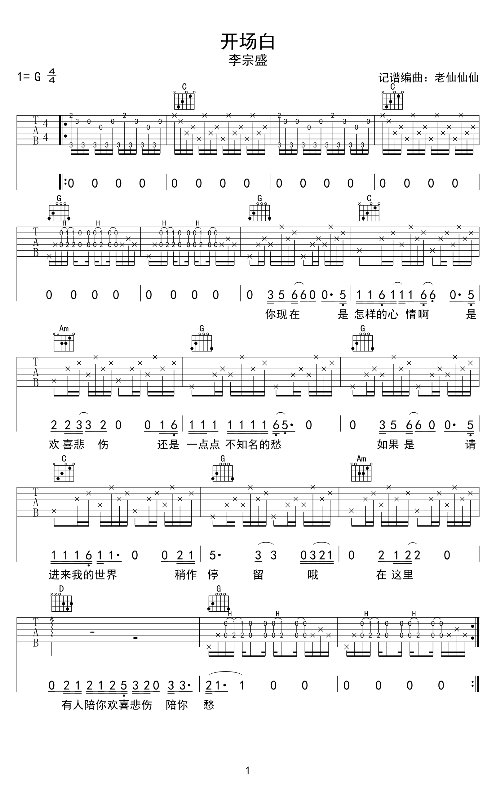开场白吉他谱 - 李宗盛 - G调吉他弹唱谱