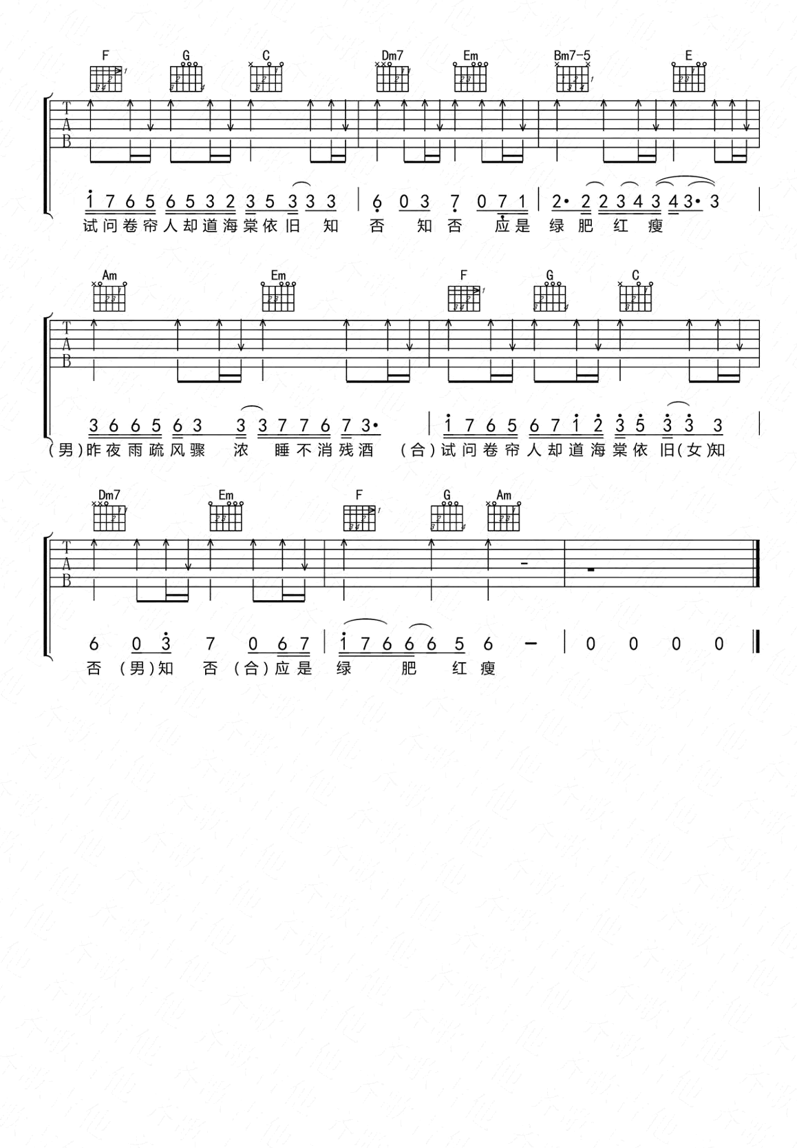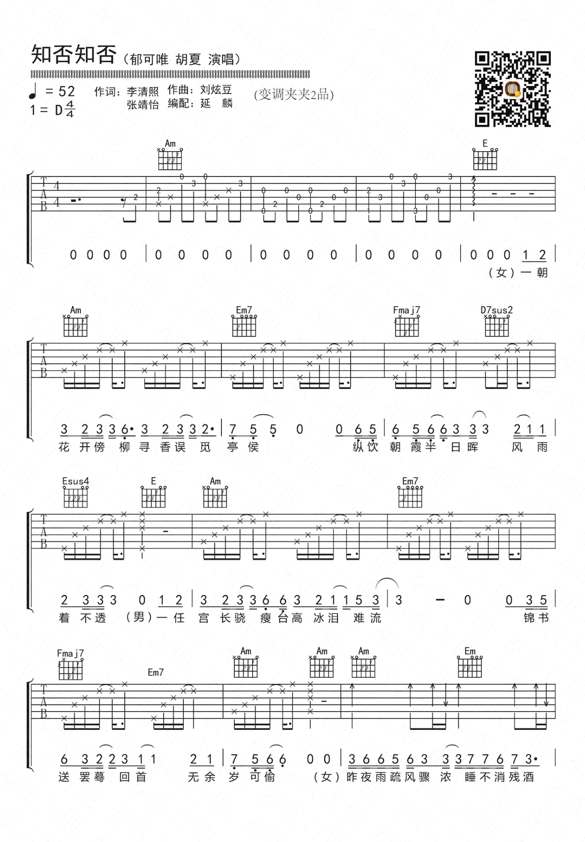 曲谱介绍: 知否知否吉他谱,郁可唯和胡夏演唱,原调D调,变调夹夹二品,电视剧《知否知否应是绿肥红瘦》主题曲,知否知否六线谱,简单和弦弹唱谱,感谢延麟编配,91吉他谱网站上传分享。 采用李清照《如梦令》诗词创作的古风歌曲,男女唱和的歌声极具温柔,悠长婉转的旋律,几分伤感中又带着一丝丝的不屈。海棠依旧,应是绿肥红瘦。不知景何美,却闻声依旧。