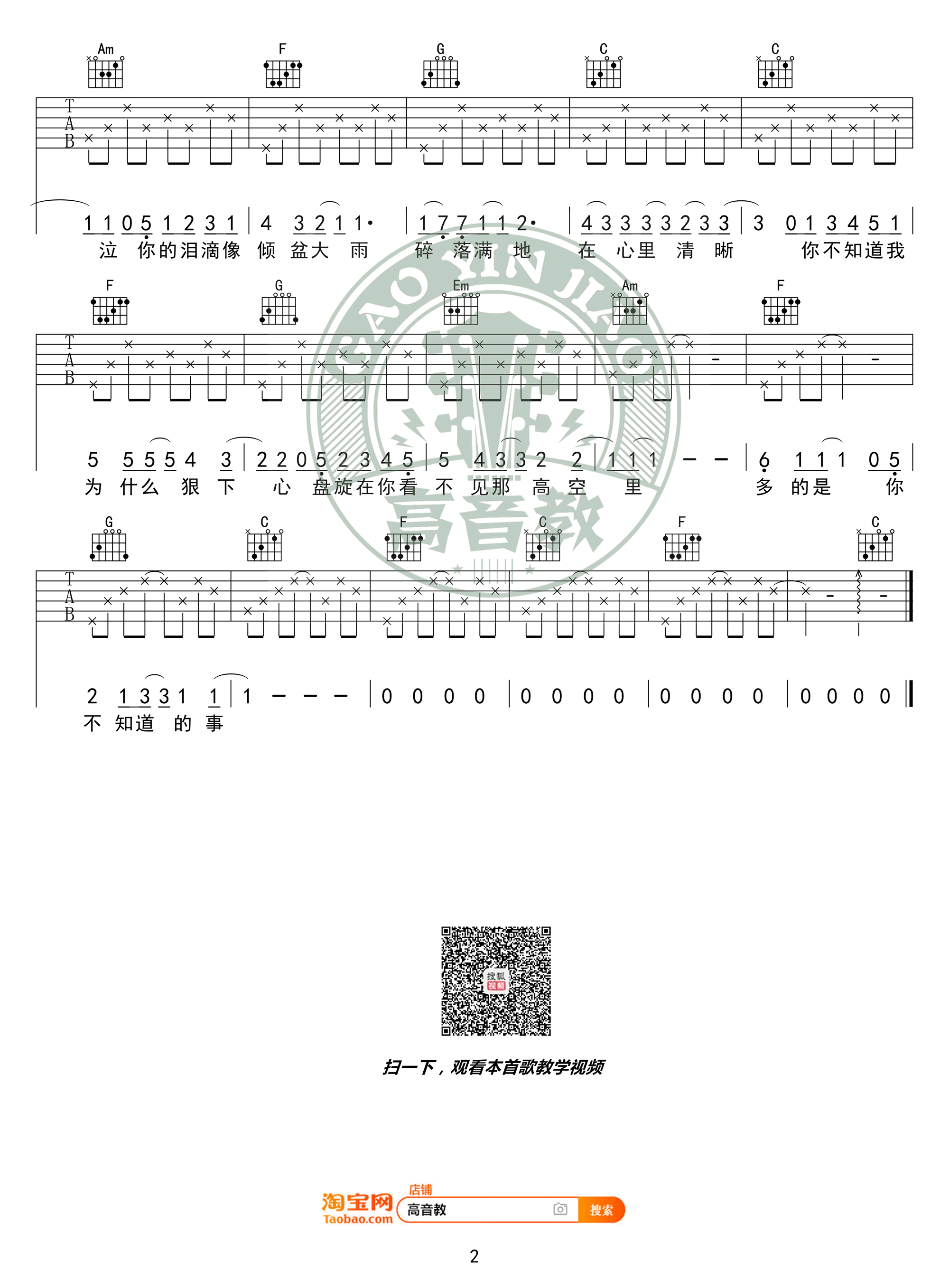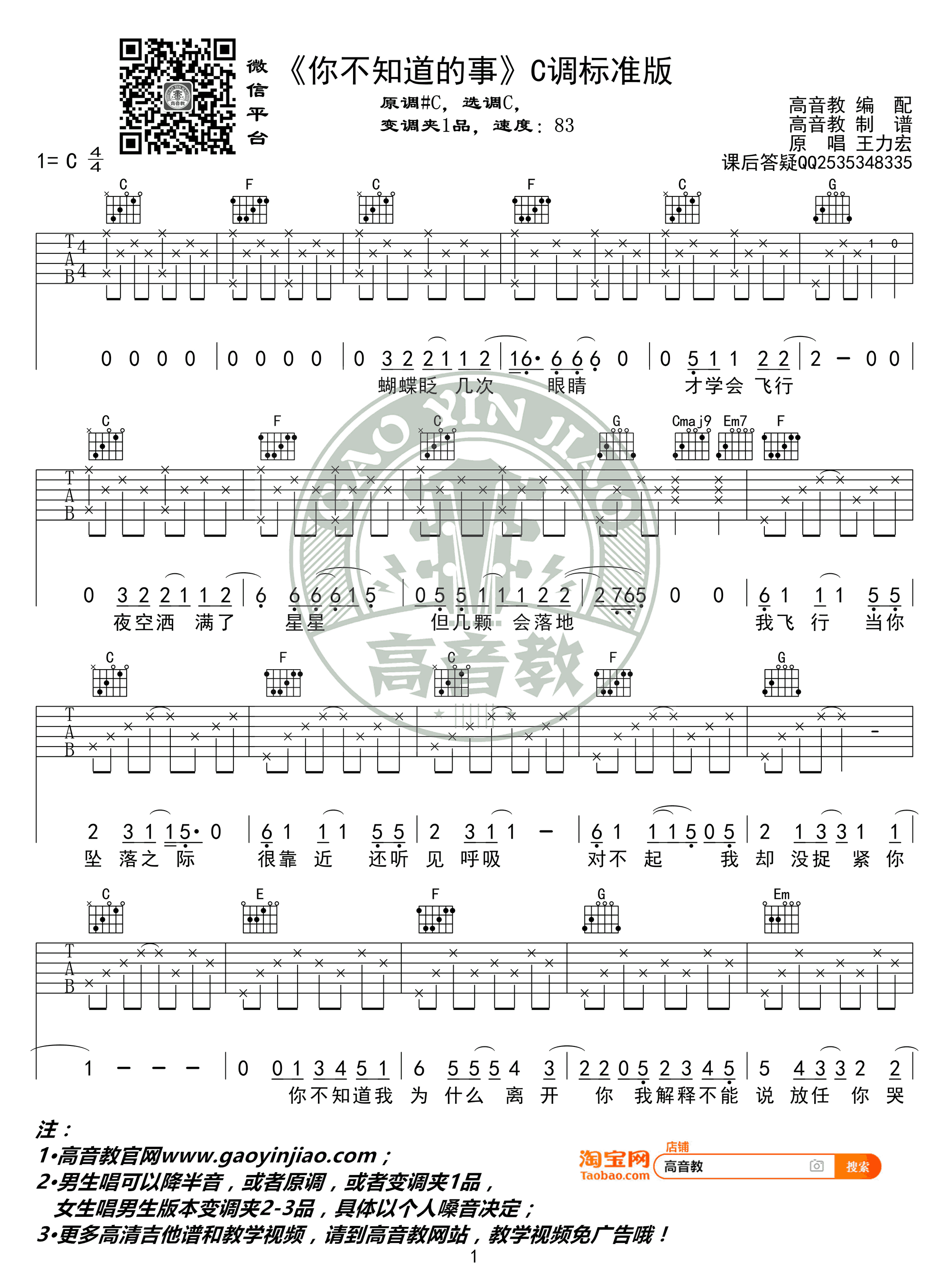 曲谱介绍: 你不知道的事吉他谱,王力宏的一首经典代表歌曲,C调标准版编配,男生Capo夹一品,女生可以根据自己嗓音选择变调夹夹2-3品。你不知道的事六线谱,高清弹唱图片谱,感谢高音教出品,91吉他谱网站上传分享。随谱附上曲谱配套吉他弹唱教学视频,琴友们跟随老师的讲解示范练习。