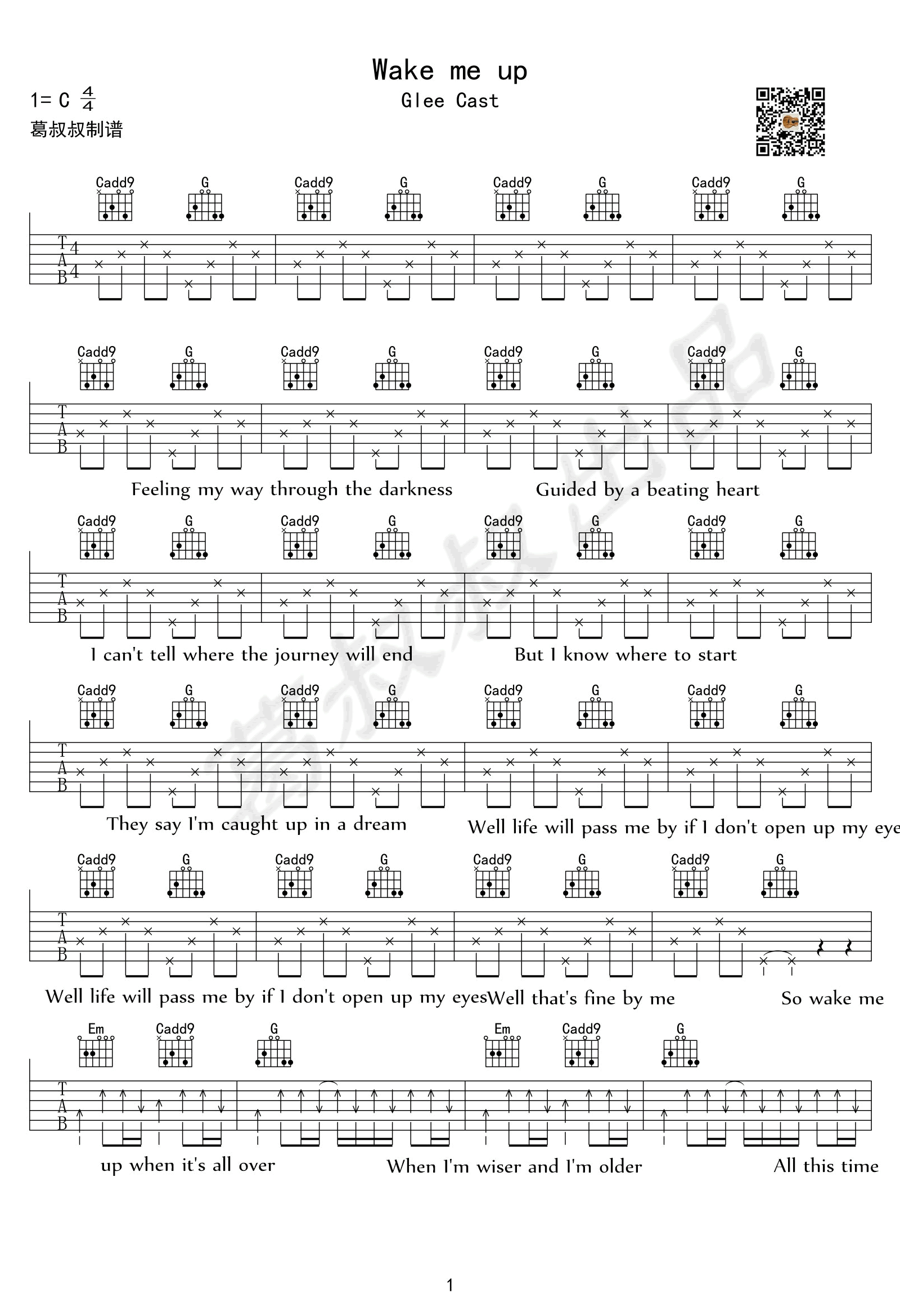 曲谱介绍: Wake me up吉他谱,Glee Cast翻唱版本,一首经典英文歌曲。Wake me up六线谱,C调弹唱谱,完整版共四张图片谱例。感谢葛叔叔编配制谱,91吉他谱上传分享。 这首歌出自欢乐合唱团的专辑 Glee: The Music, the Back Up Plan ,原唱是Avicii,原作是节奏很快的一首歌,这个版本的改编,更励志了,也是很好听的。这个歌前奏很像晴天,后面和平凡之路和弦是一样的。