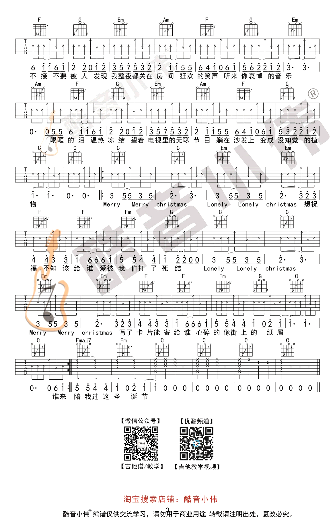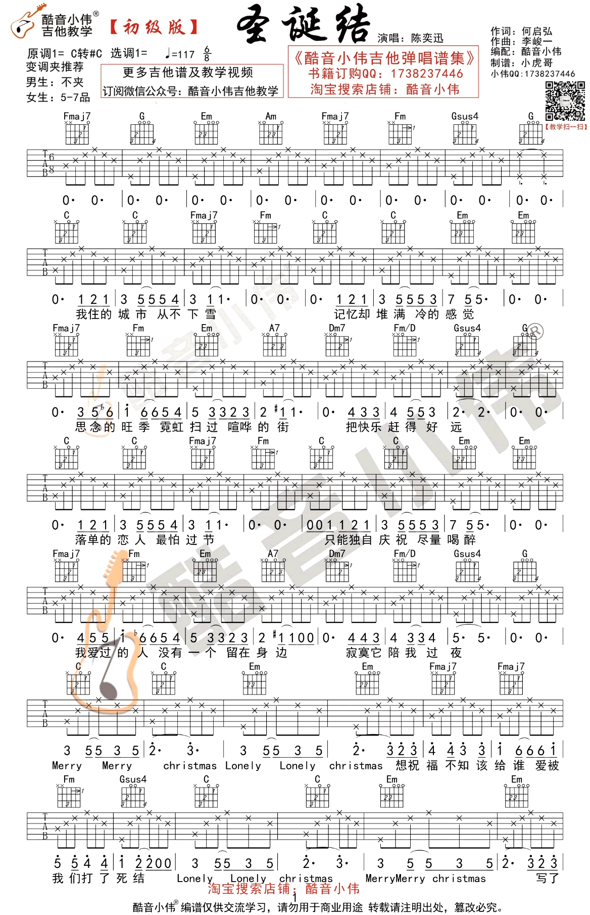 曲谱介绍: 陈奕迅《圣诞结》吉他谱,初级版编配,原调C转#C,变调夹推荐,男生不夹,女生5-7品,圣诞夜的一首寂寞弹唱,Lonely Christmas,圣诞结六线谱,酷音小伟出品,91吉他谱网站上传分享。 善良美丽可爱又大方的单身狗们的经典保留曲目,我住的城市从不下雪,记忆却堆满冷的感觉。每年的圣诞节,熟悉的旋律都会响起,提醒着那些害怕过节的落单情人,又一年圣诞已至。