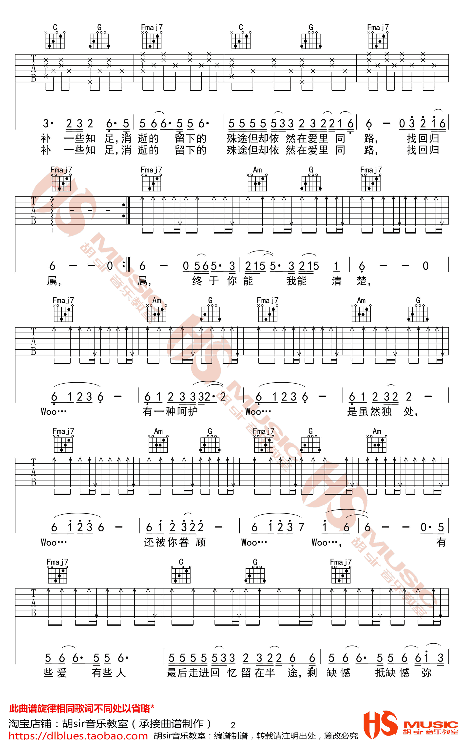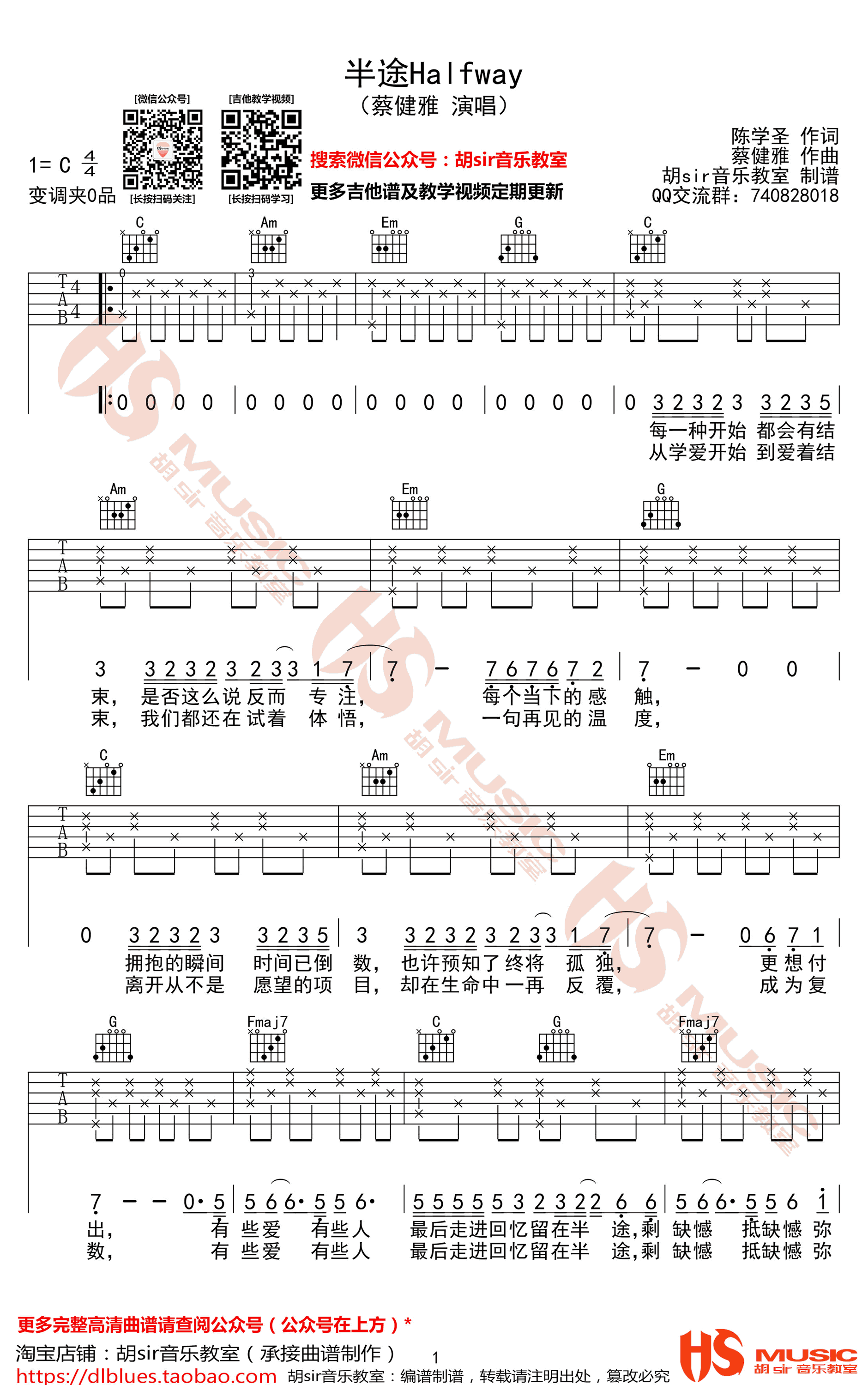 曲谱介绍: 半途吉他谱,蔡健雅的一首新歌,半途Halfway,C调指法编配,半途六线谱,高清弹唱图片谱,感谢胡SIR音乐教室出品,91吉他谱推荐分享。