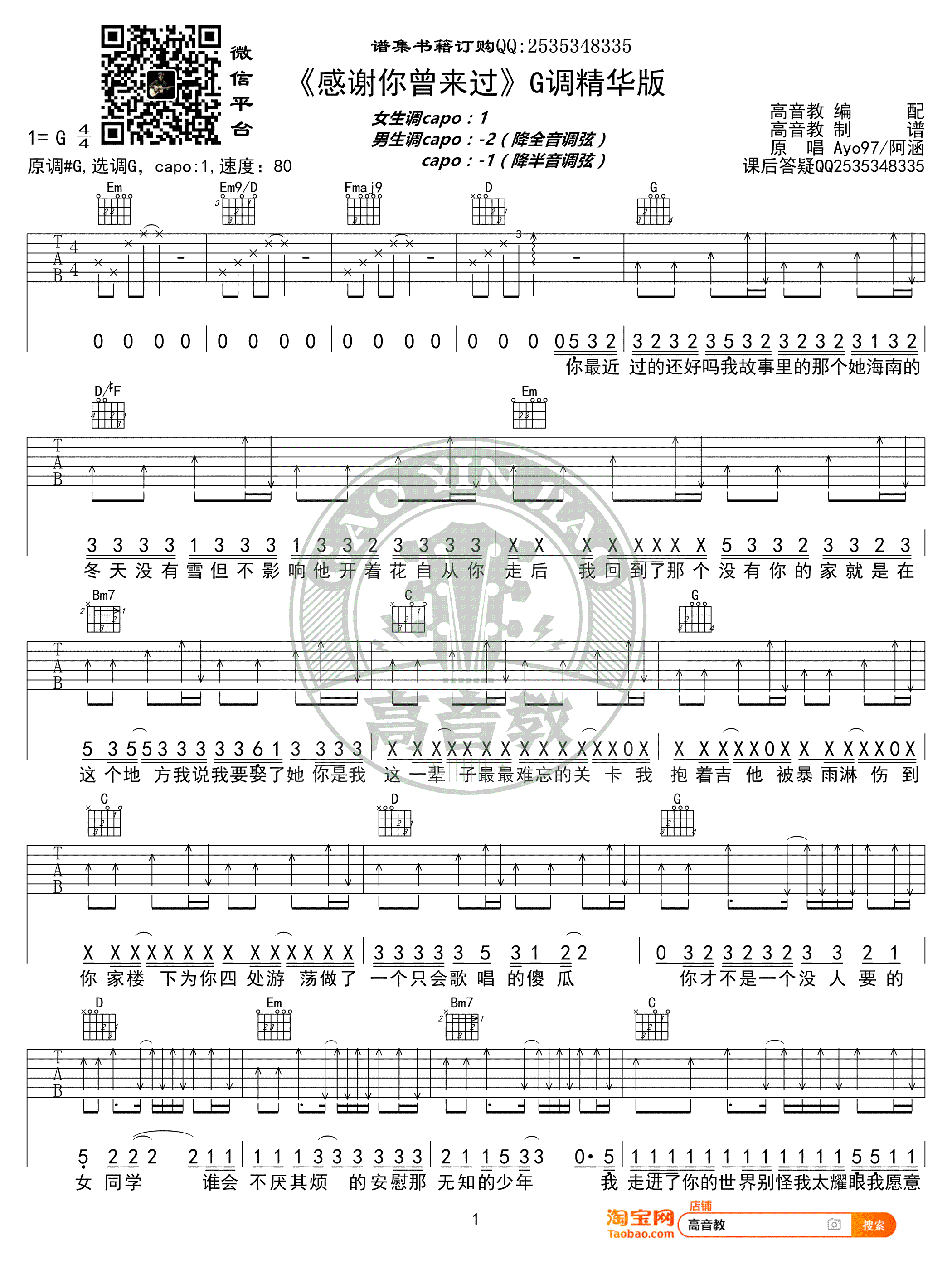 曲谱介绍: 感谢你曾来过吉他谱,Ayo97阿涵演唱,G调指法精华版编配,女生变调夹夹一品,男生调降半音或降全音。感谢你曾来过六线谱,高清图片谱,感谢高音教编配,91吉他谱网站推荐分享。