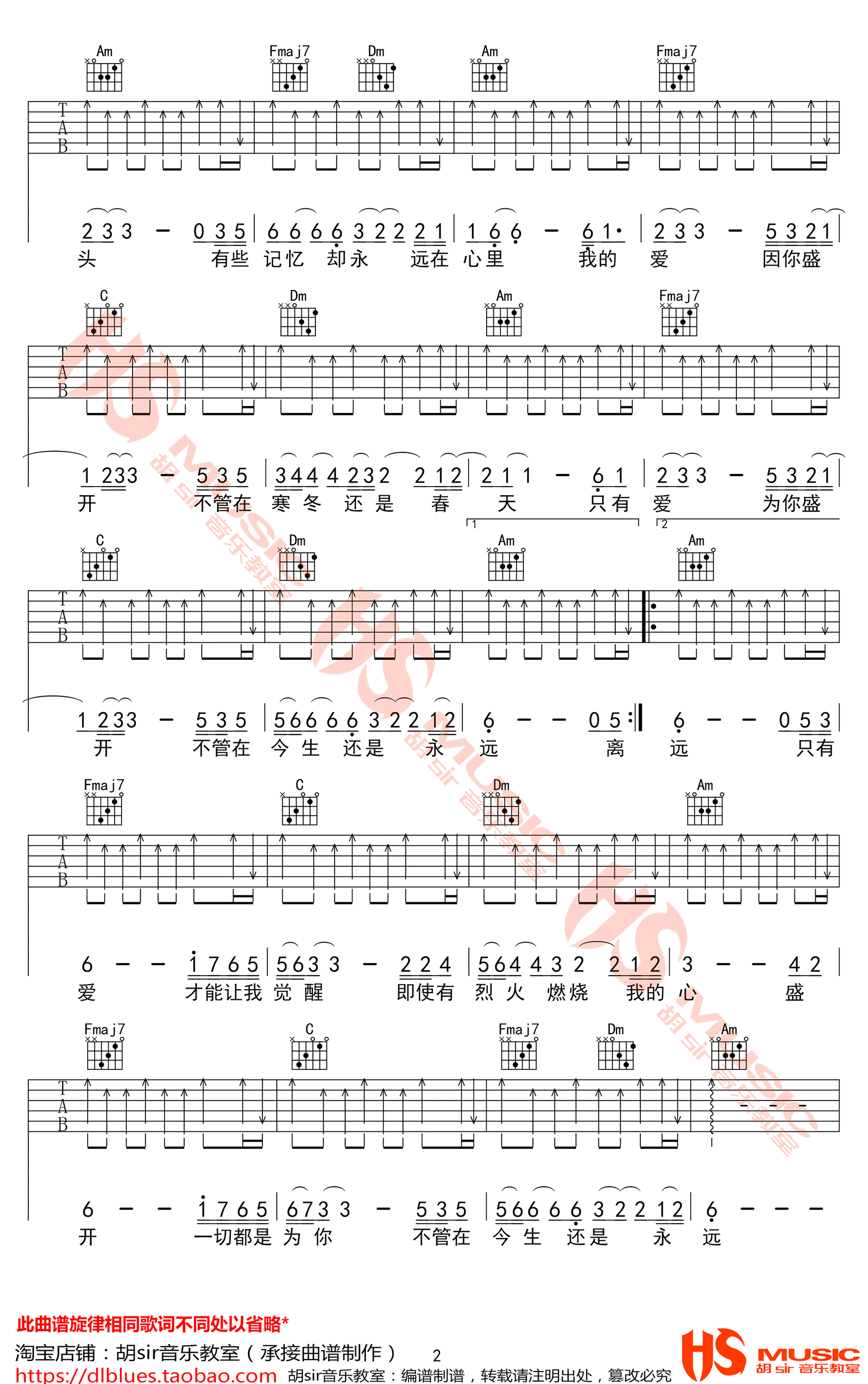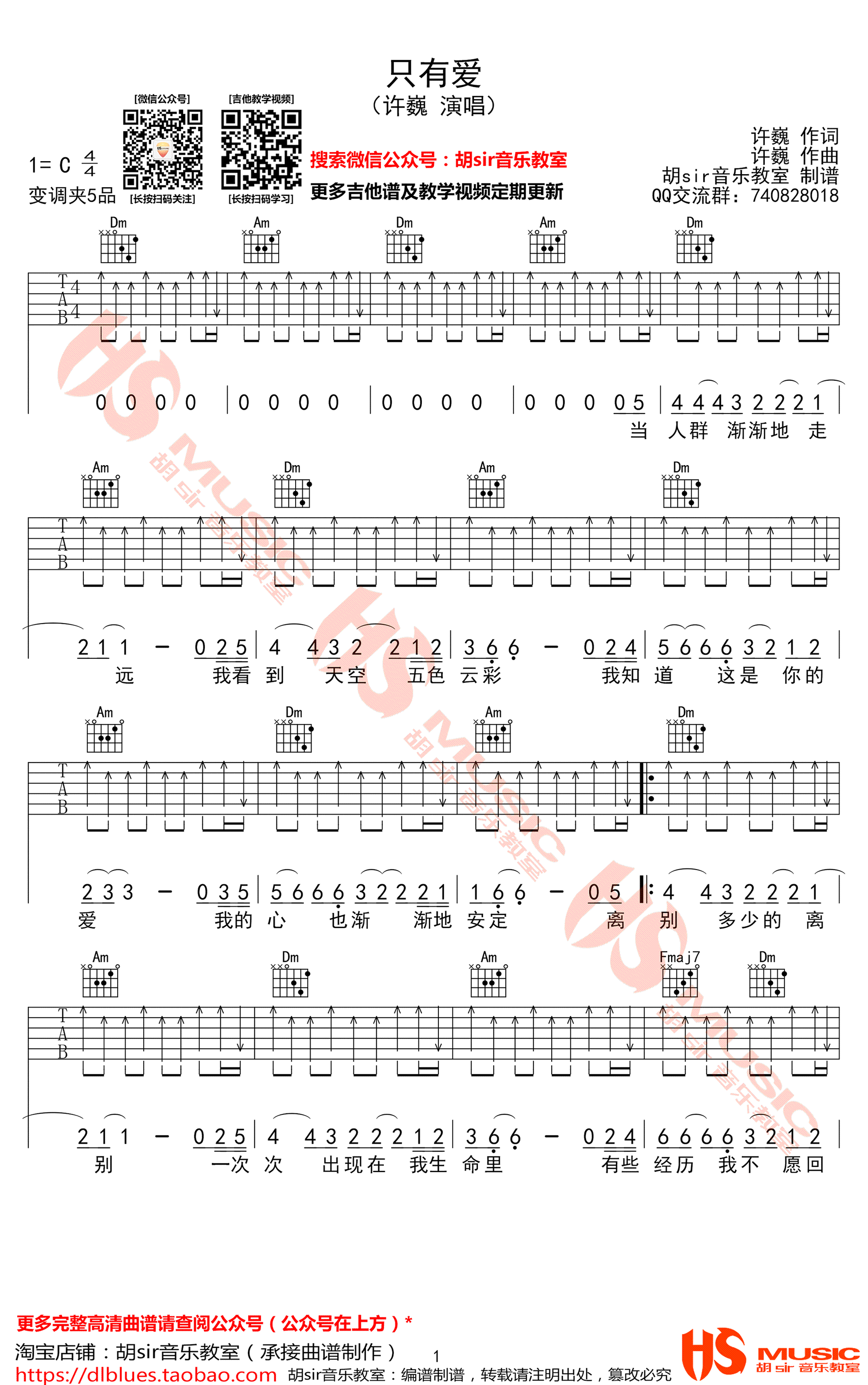 曲谱介绍: 只有爱吉他谱,许巍新专辑《无尽光芒》中的一首新歌,C调指法编配,变调夹夹五品。只有爱六线谱,高清弹唱图片谱,胡sir音乐教室出品,91吉他谱网站上传收藏。