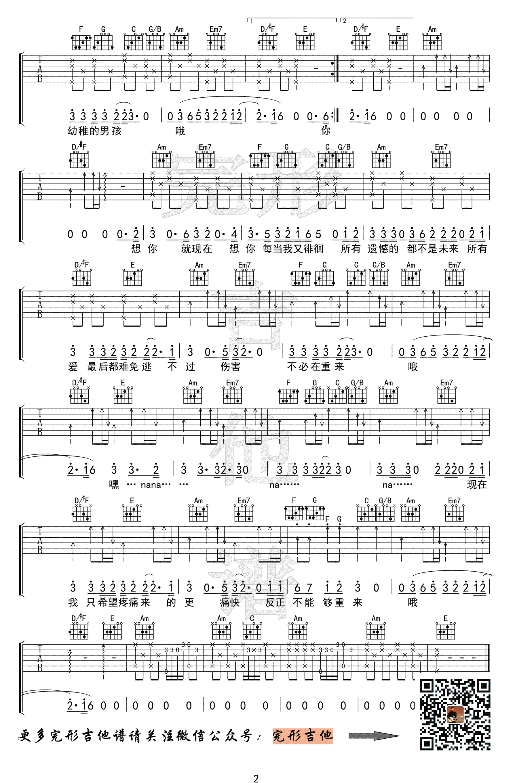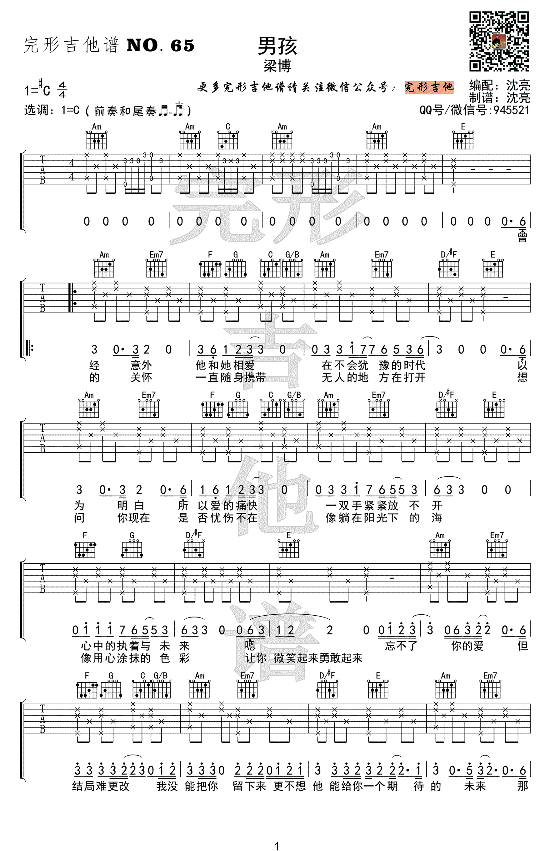 曲谱介绍: 男孩吉他谱,梁博演唱的一首原创歌曲,唱出了男孩内心的成长体验。男孩六线谱,选调C,高清图片谱,随谱附上配套吉他弹唱示范视频。感谢完形吉他出品,沈亮老师编配演奏说明:全篇基本是以一套和弦推进,个别地方稍加变化。作曲的初衷应如此,这也是我们原创时的一种借鉴。和弦方面,值得注意的是:D/#F和弦过渡到E和弦,在A小调里这是一种惯用手法,需记住。前奏和尾奏的16分音符注意是swing节奏,仔细品味原版中的跳跃感觉。