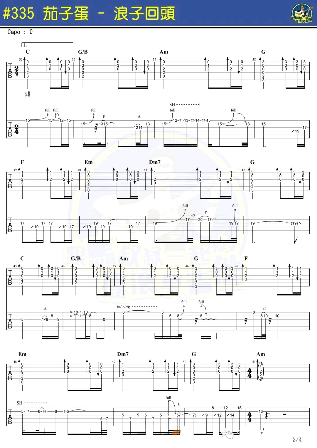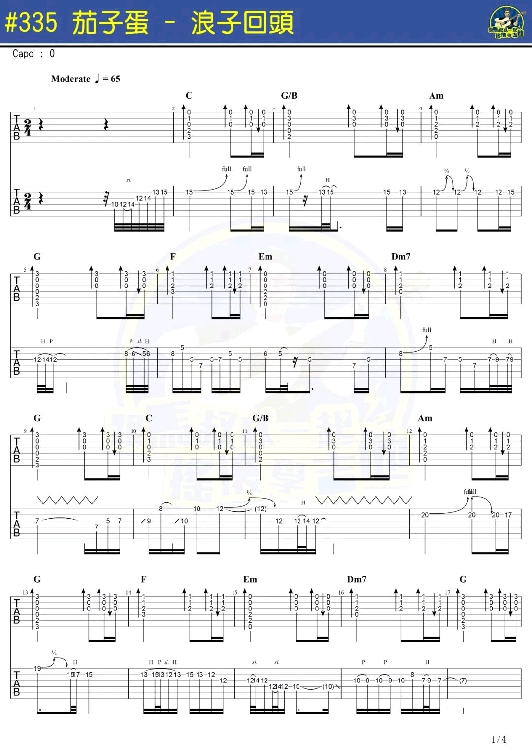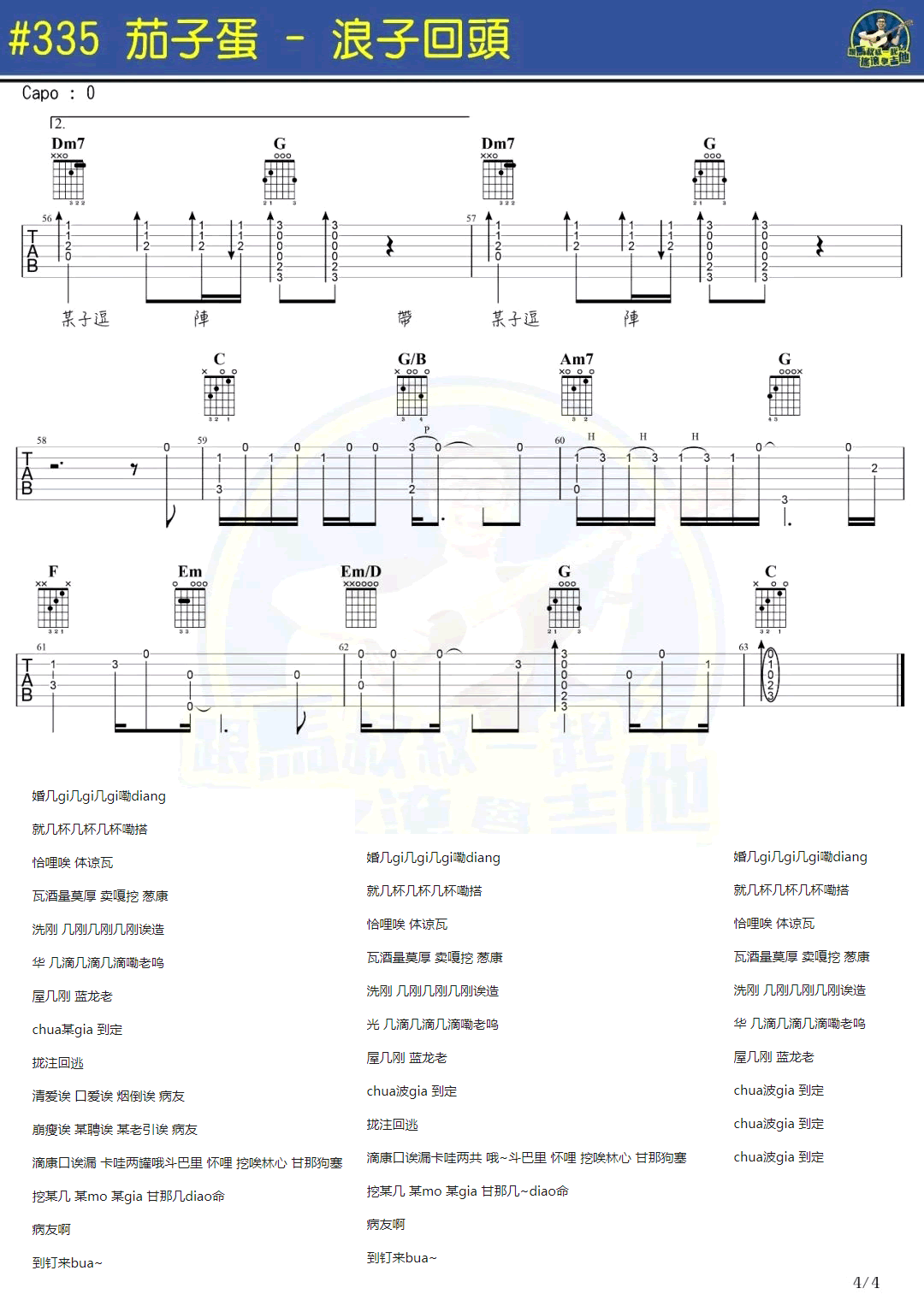 曲谱介绍: 浪子回头吉他谱,台湾茄子蛋乐队演唱的一首闽南语歌曲火遍抖音,浪子回头六线谱,带音译歌词,高清弹唱谱四张图片谱例,马叔叔摇滚吉他教室出品,随谱附上曲谱配套演示视频,91吉他谱网站上传分享。