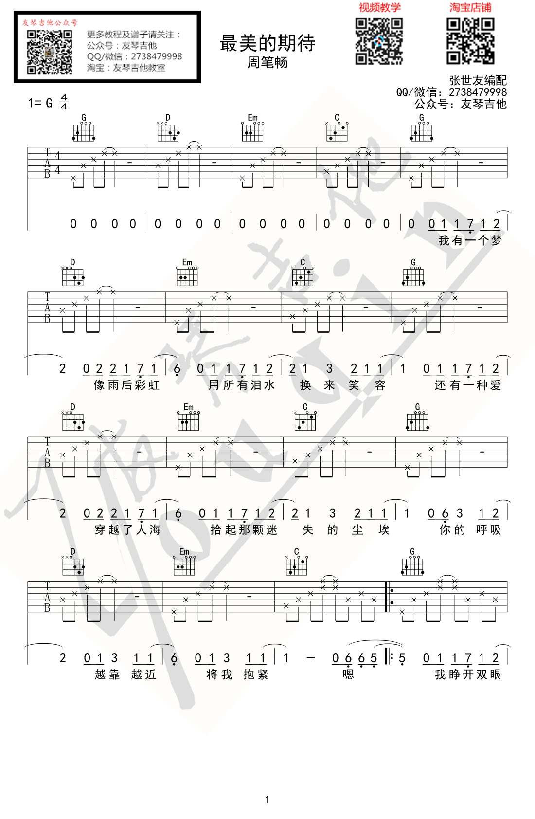 曲谱介绍: 最美的期待吉他谱,周笔畅演唱的一首火爆网络的励志情歌,最美的期待六线谱,G调指法,男生版弹唱谱简单版,感谢友琴吉他出品,91吉他谱网站推荐。随谱附上吉他弹唱和教学视频,琴友们参照阿友老师的讲解示范练习。