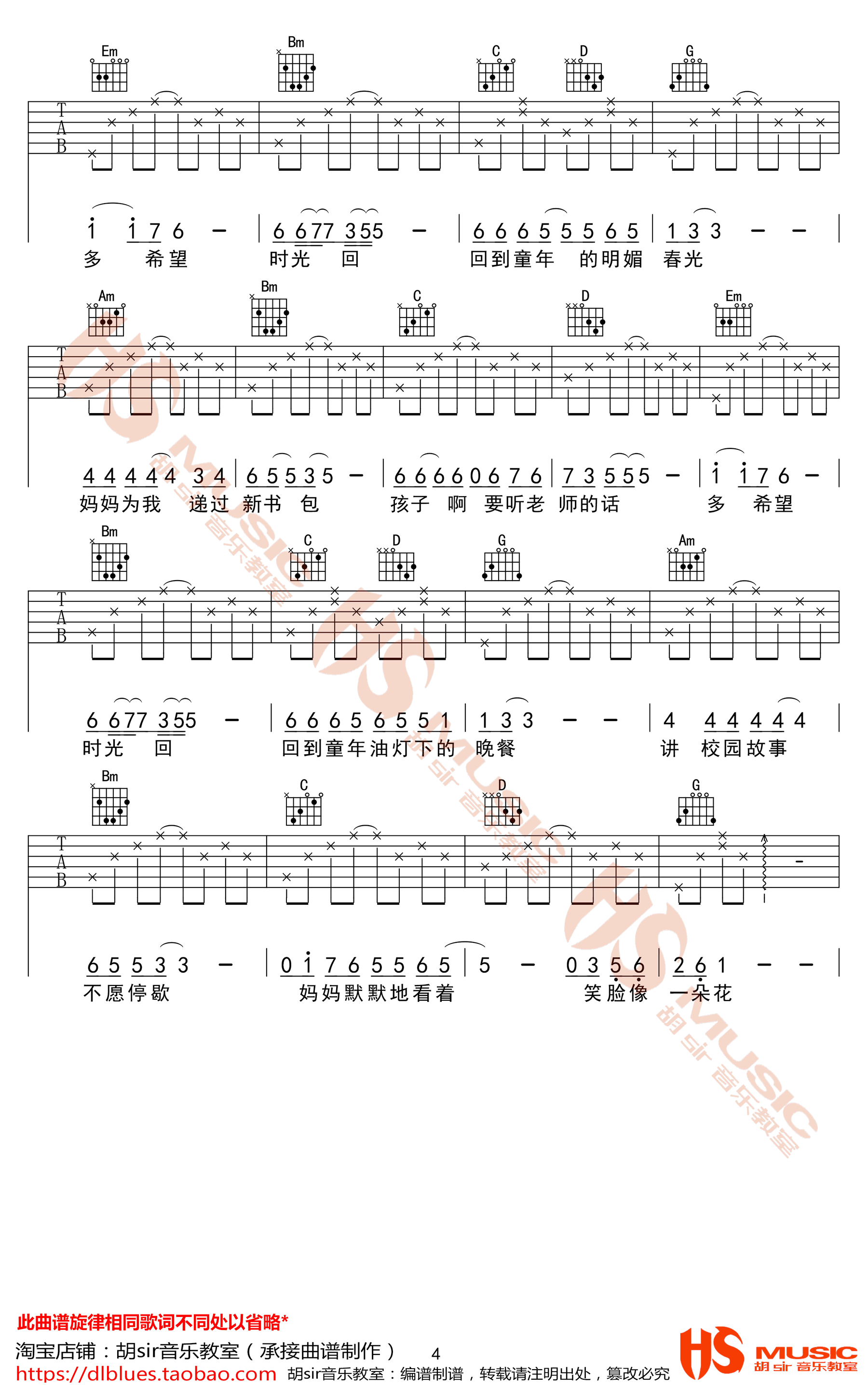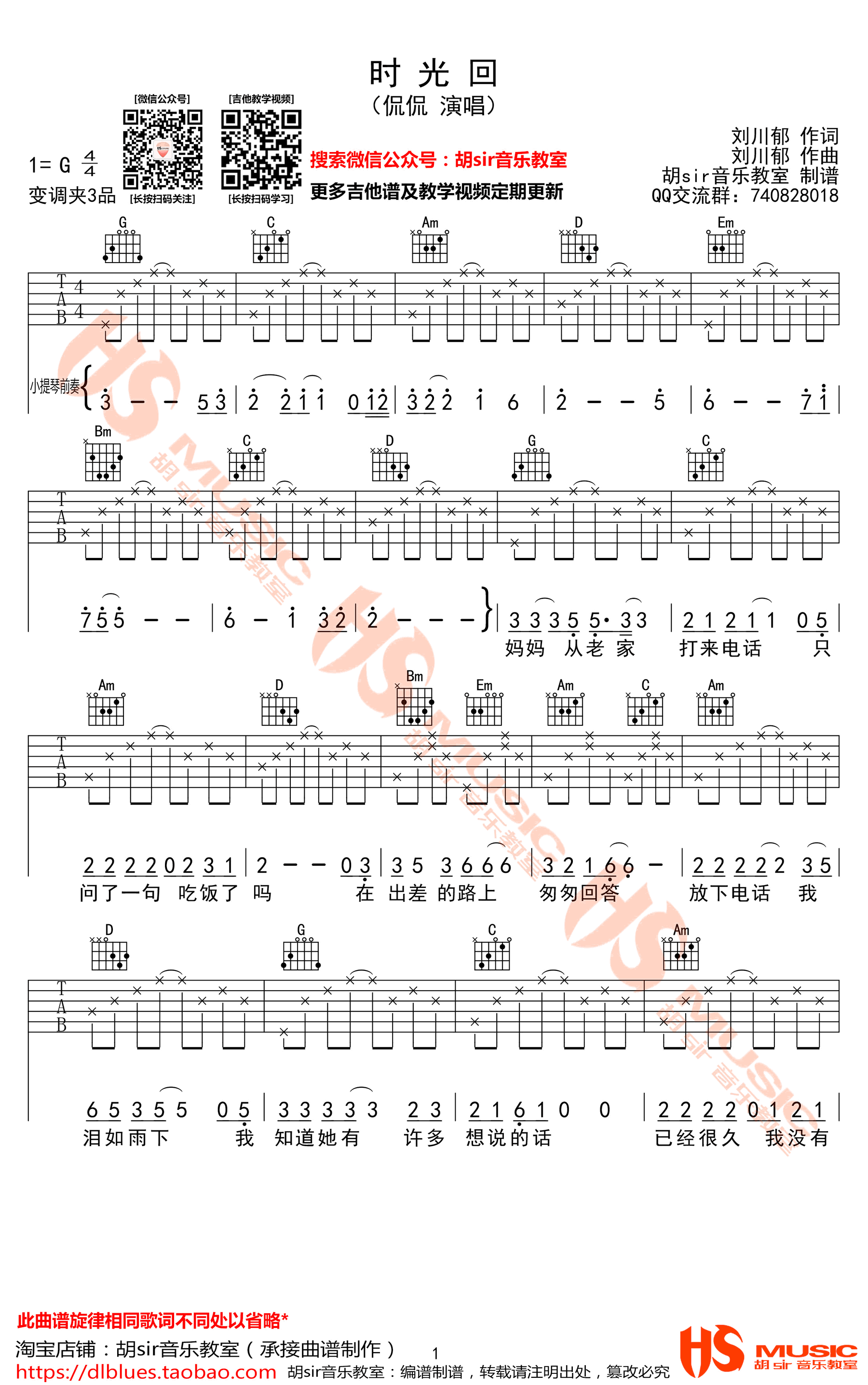 曲谱介绍: 时光回吉他谱,侃侃演唱,电影《生门》片尾曲,G调指法编配,变调夹夹三品。时光回六线谱,高清弹唱图片谱,感谢胡sir音乐教室出品,91吉他谱网站推荐分享。 一首满满温暖与感动的歌曲,多么希望自己能通过时光隧道,回到自己之前那段美好的时光中去。和家人扯扯家常,和基友侃侃天地,多看几眼自己暗恋的姑娘,多吃几回老妈做的饭。 ​