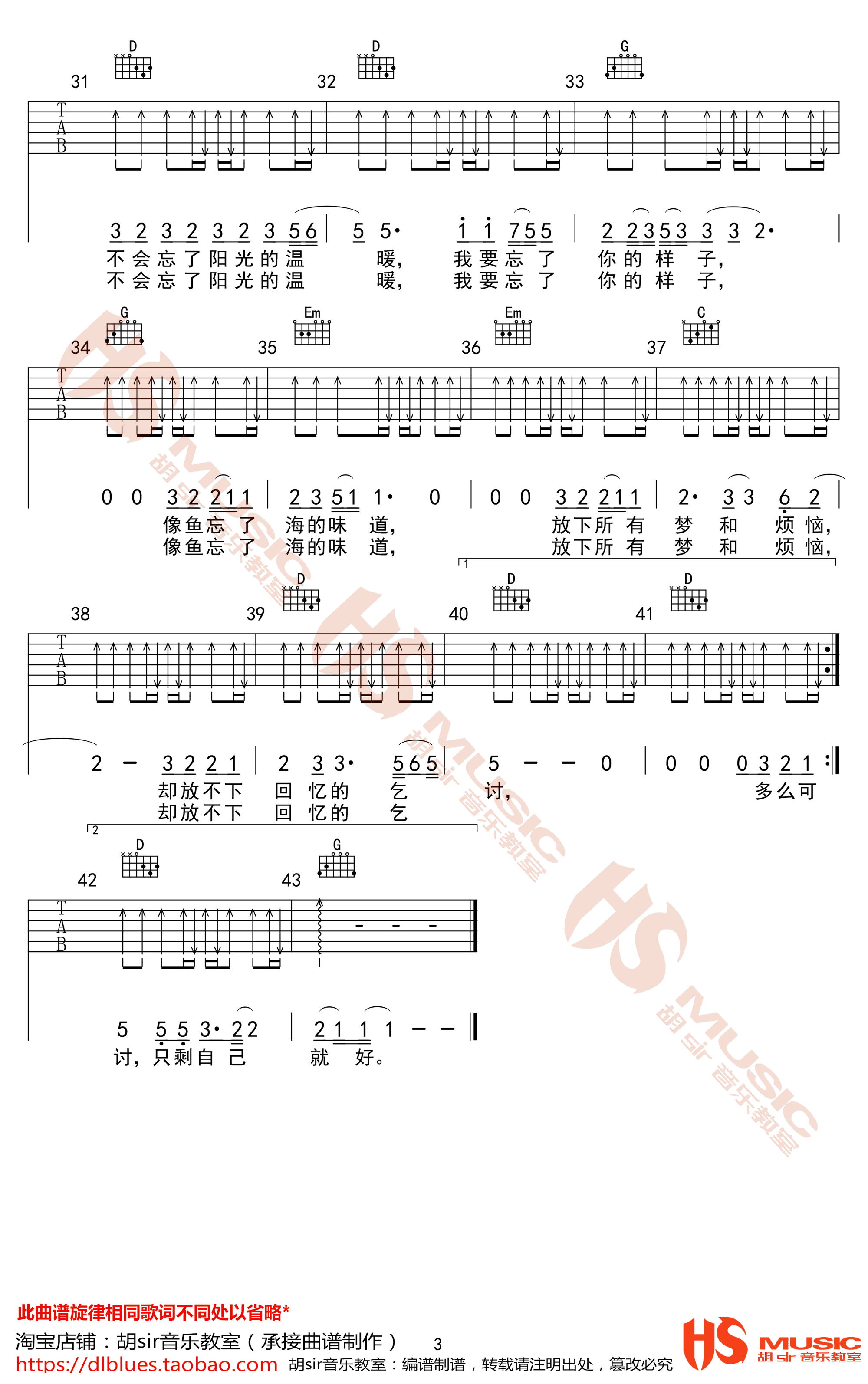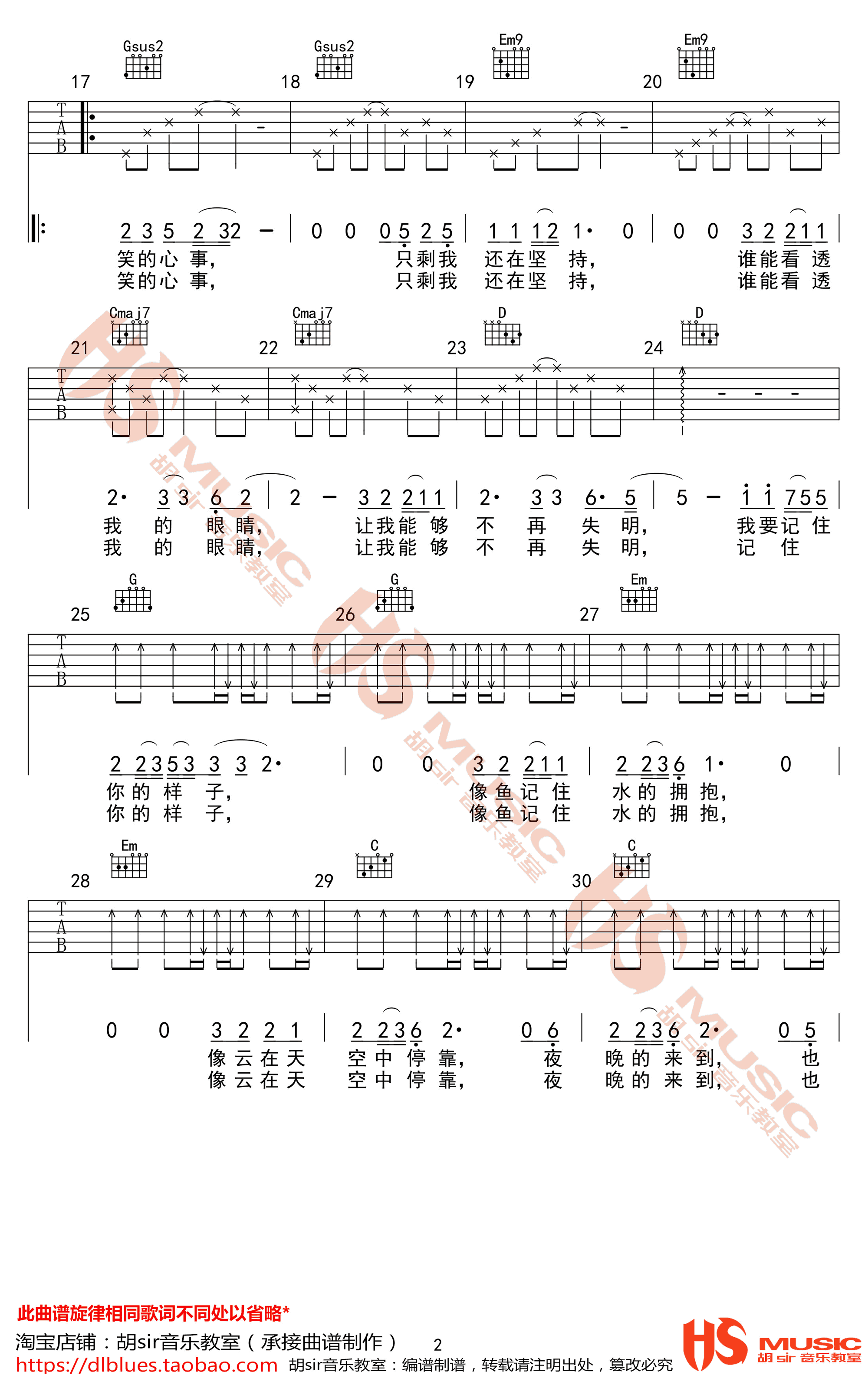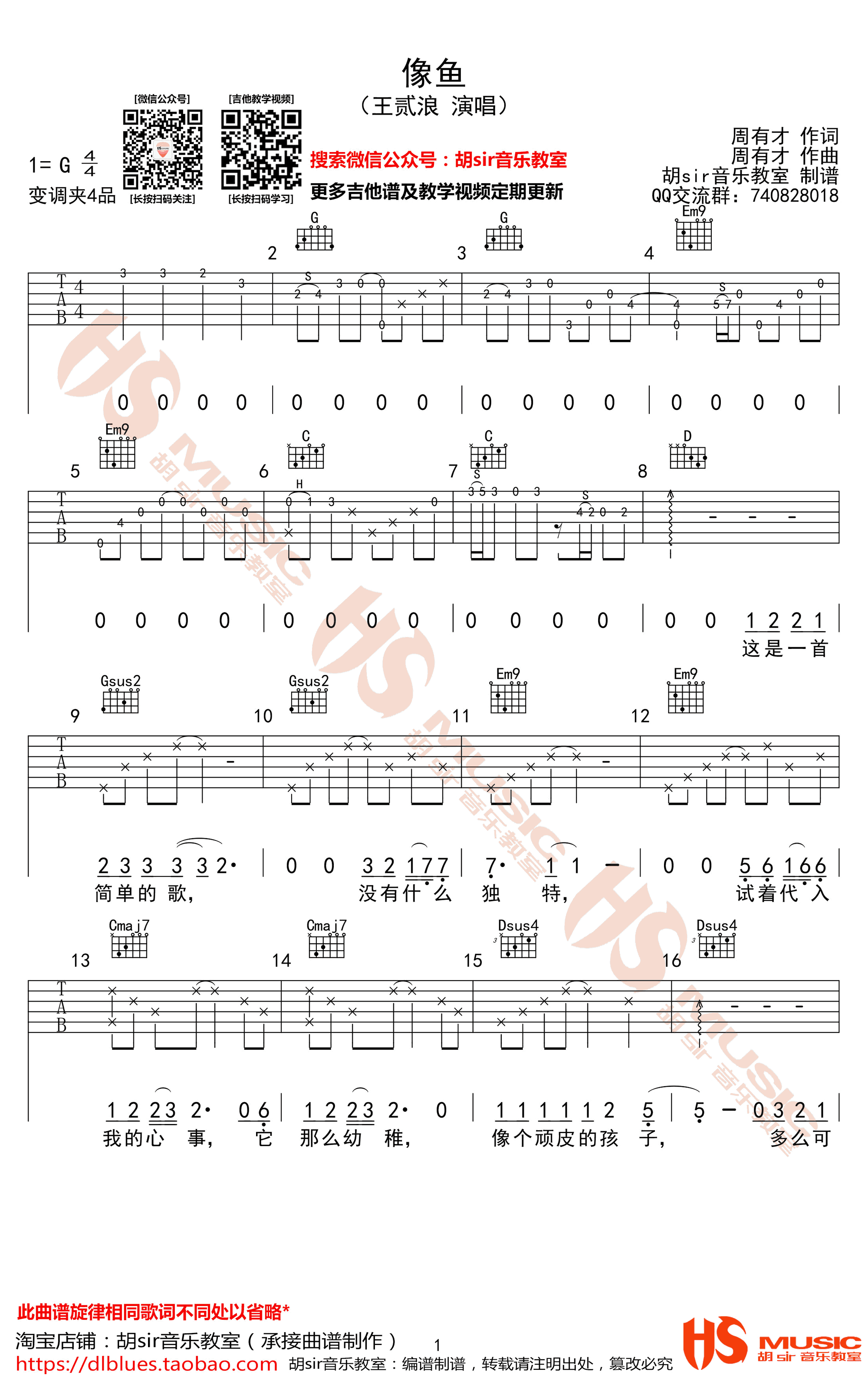 曲谱介绍: 像鱼吉他谱,王贰浪演唱,G调指法,变调夹夹四品。像鱼六线谱,高清弹唱图片谱。胡sir音乐教室编配出品,91吉他谱网站推荐分享。 简单的吉他伴奏,无法抗拒的魅力歌声,唱出对感情不舍却又抓不住的心情。,让我们一起经历体会这份淡淡浅浅的悲伤和挣扎吧。