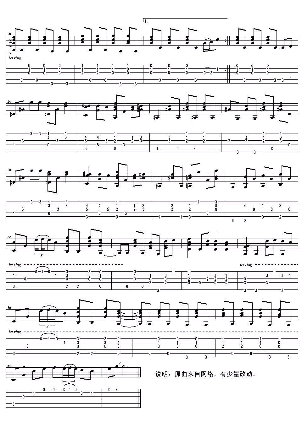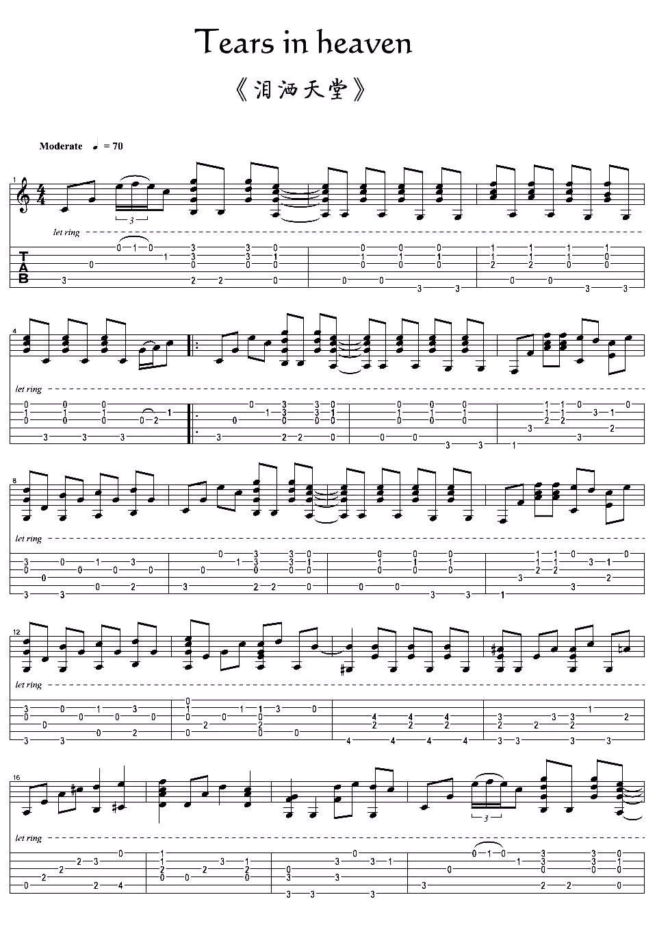 曲谱介绍: Tears in Heaven指弹谱,泪洒天堂吉他独奏谱,两张图片谱,原曲来自网络,有少量改动,91吉他谱网站上传分享。 这是艾里克·克莱普顿的经典代表作品,透着一种被悲伤滤过的安慰情殇,在悲哀奠定的大基调下,却诉说得恰是轻柔。
