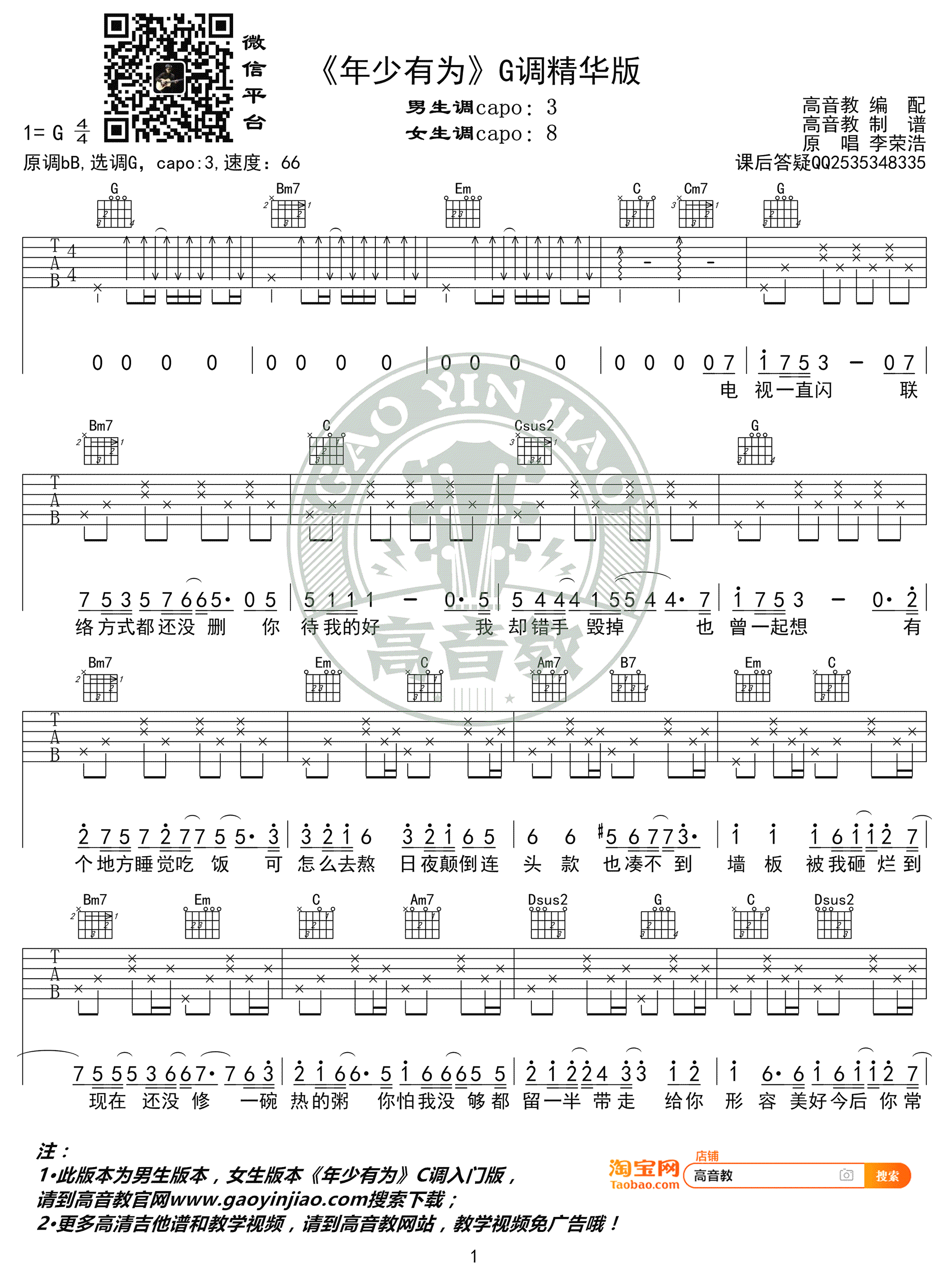 曲谱介绍: 年少有为吉他谱,李荣浩演唱,原调降B,选用G调指法,CAPO夹三品,女生可夹八品。年少有为六线谱,高音教出品,91吉他谱网站分享。