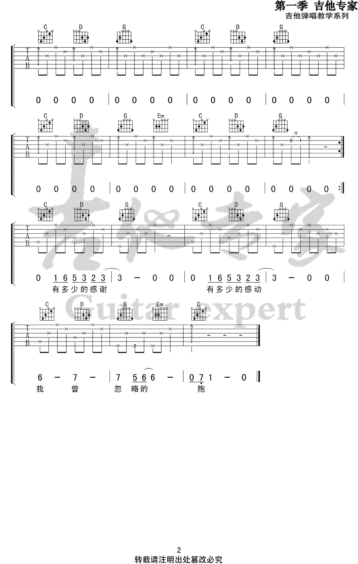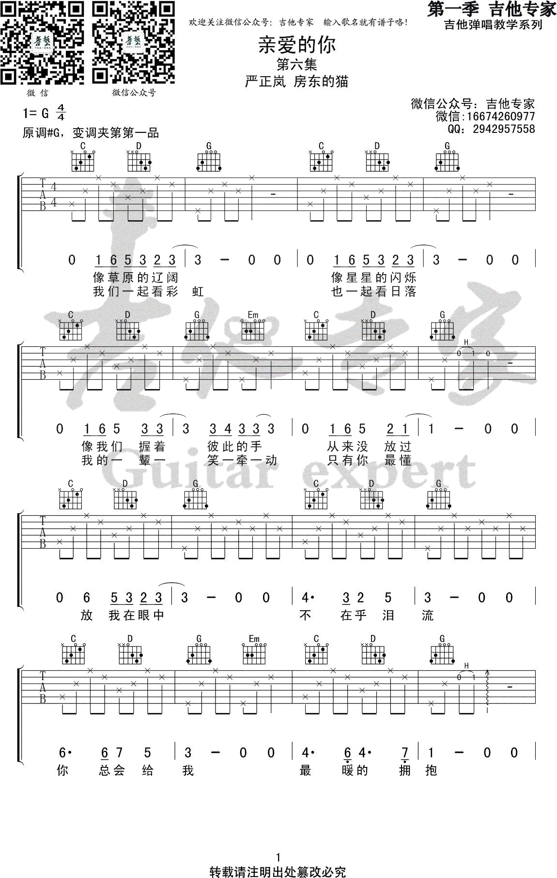 曲谱介绍: 亲爱的你吉他谱,严正岚和房东的猫演唱的一首歌曲,原调#G,变调夹夹第一品,选用G调指法编配。亲爱的你吉他六线谱,高清弹唱图片谱,感谢吉他专家出品。 摇滚猫老师:这首歌曲速度很慢,和弦也不难,很适合初学者弹唱!你能够听出房东的猫的嗓音吗?像草原的辽阔,像星星的闪烁,像我们握着彼此的手,从来没放过。一首友谊之歌,带给身边始终陪伴的你。