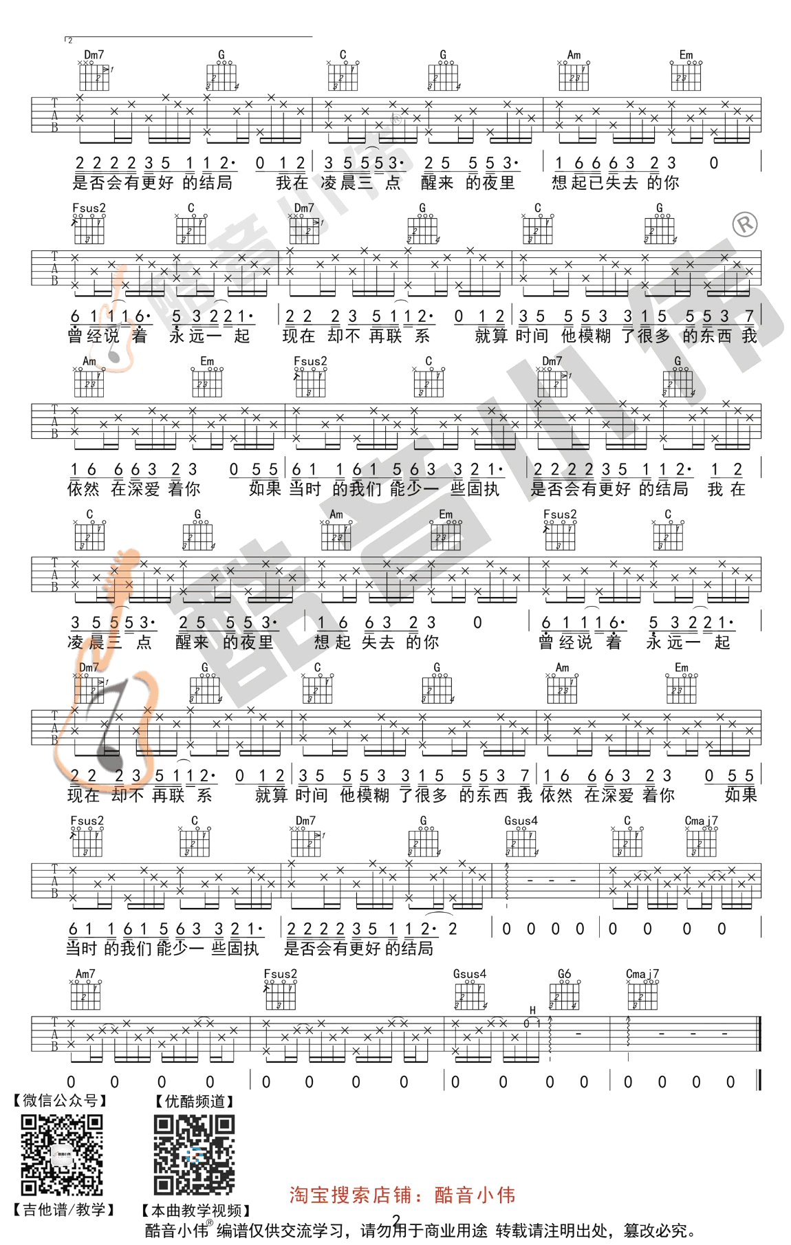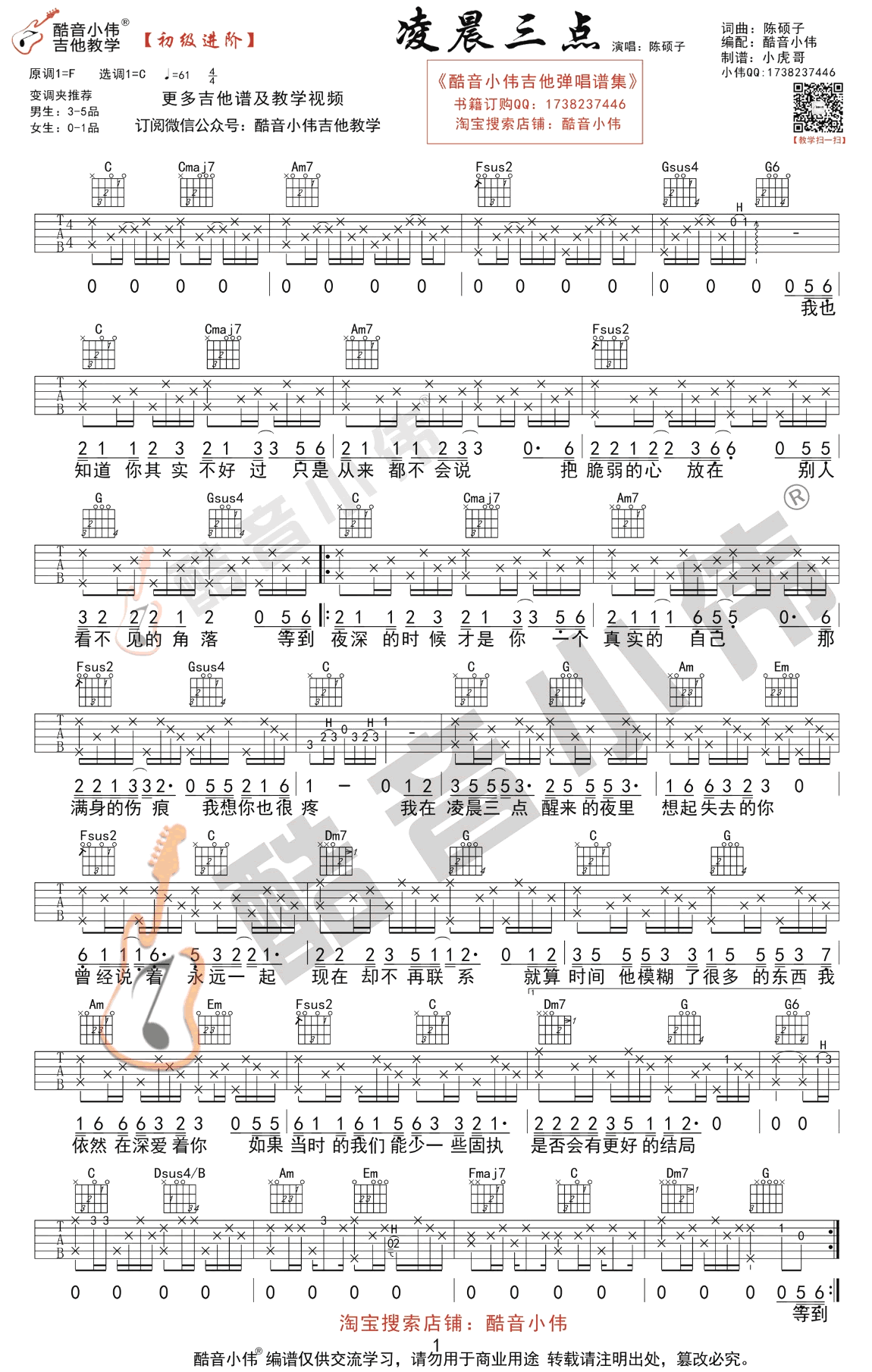 曲谱介绍: 凌晨三点吉他谱,陈硕子演唱,一首网络热门歌曲,凌晨三点六线谱,G调弹唱初级进阶版,变调夹推荐,男生夹5品为原调F,女生0-1品。感谢酷音小伟编配出品,91吉他谱网站推荐分享。随谱附上配套吉他弹唱教学视频,琴友们跟随老师的示范讲解学习起来。立过的誓言无关紧要, 在或不在,只关乎结果,放下悲欢,愿你不会再有凌晨三点醒来的夜!