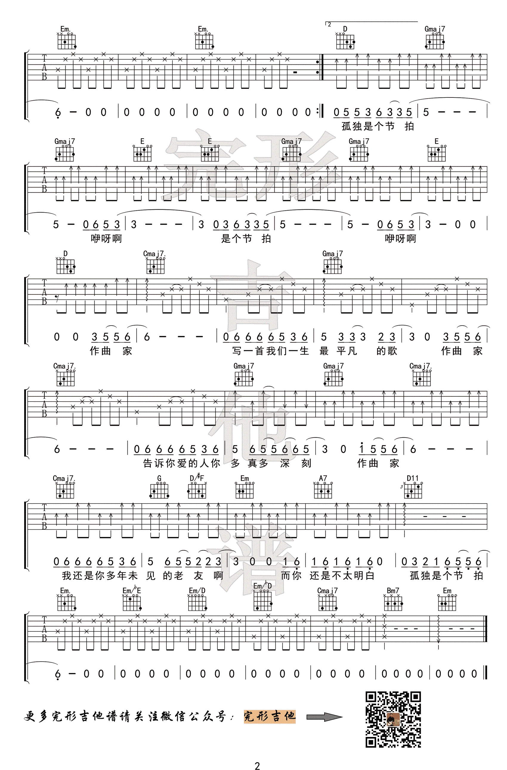 曲谱介绍: 李荣浩《作曲家》吉他谱,G调指法演奏,女声弹唱建议变调夹夹4-6品,作曲家六线谱,高清图片谱,完形吉他编配出品,91吉他谱网站上传分享。 沈亮老师编配演奏说明,根据原曲中的编曲改编,要特别注意主歌的低音链下行的手法,编配中还原了这种感觉,在练习的同时,大家可以体会这种作曲手法的应用,可不要单纯迷信4536251的不变法则了。同时可多积累乐理知识。整体指法不难,也没有复杂的和弦,右手节奏平稳简单,歌曲本身朗朗上口,是一首很适合弹唱的歌曲,若是同时配合卡宏箱鼓,效果更佳。