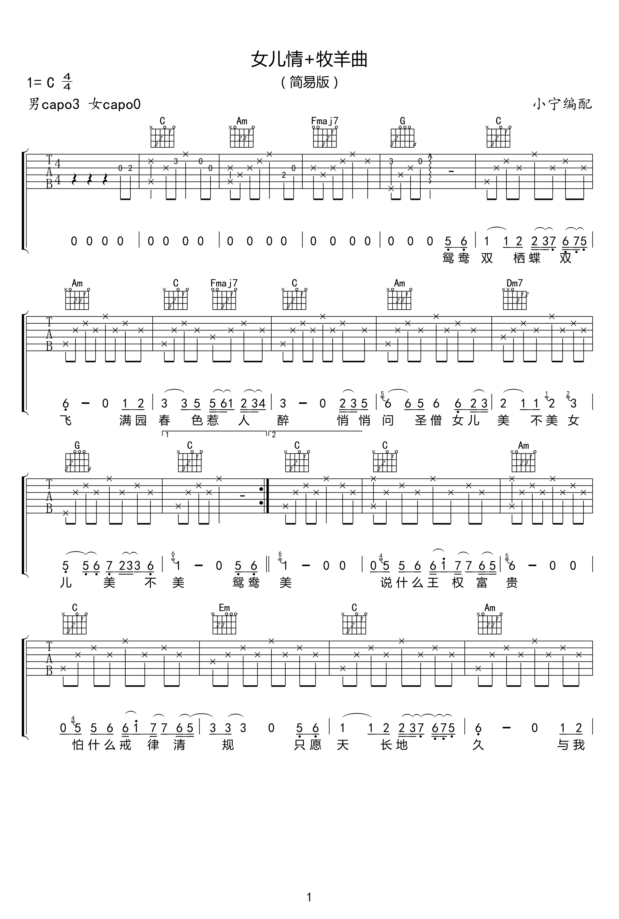 曲谱介绍: 女儿情+牧羊曲吉他谱,好妹妹乐队演唱,C调简易版,变调夹男生夹三品,女生不夹。影视歌曲《西游记》和《少林寺》插曲,感谢小宁编配出品,91吉他谱网站上传分享。 原来世间有些爱,不是不爱,而是不能爱。好妹妹乐队秦昊、张小厚吉他弹唱民谣版《女儿情》,深情简单,轻轻柔柔,亮点是与《牧羊曲》的无缝衔接,两首经典歌曲在好妹妹的诠释下变得更加富有情味。
