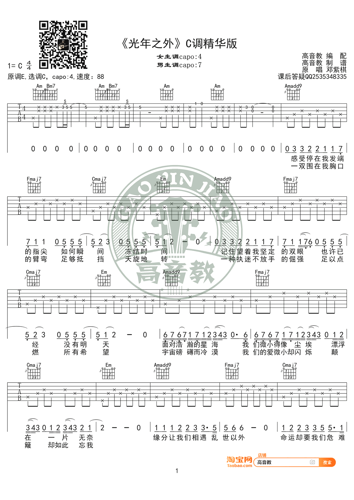 曲谱介绍: 光年之外吉他谱,邓紫棋演唱,电影《太空旅客》主题曲,原调E,选调C,capo夹四品。光年之外六线谱,此版本为女生版编配,高清弹唱图片谱,高音教出品,91吉他谱网站上传分享。 邓紫棋极具辨识度的歌声,天生自带的电音声卡,穿透力和感染力极强,来感受一下已经疯狂的心跳, 激情已经在澎湃了!