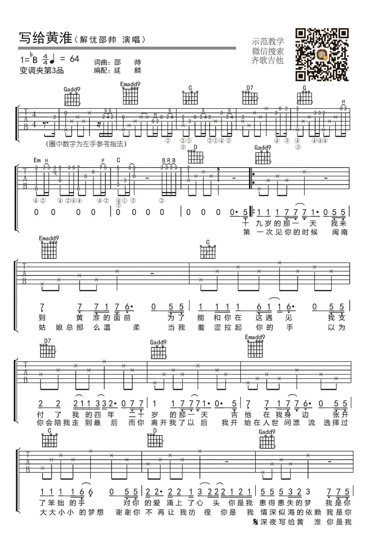 曲谱介绍: 写给黄淮吉他谱,解忧邵帅演唱,原调bB,变调夹夹第三品,一首热门民谣弹唱歌曲,写给黄淮六线谱,感谢齐歌吉他出品,91吉他谱网站上传分享。为了方便吉他新手,延麟老师将独奏式的前奏和间奏参考指法标注在了谱子下面。