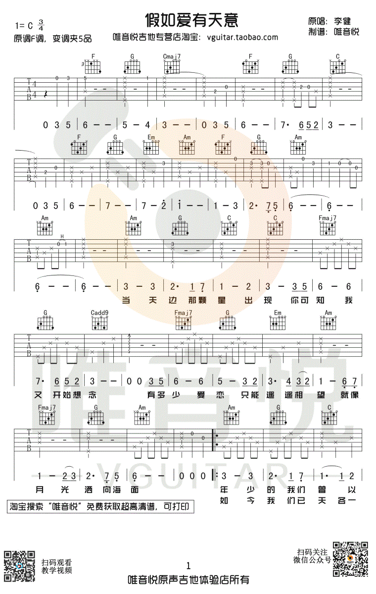 曲谱介绍: 假如爱有天意吉他谱,李健演唱,原调F调,变调夹夹五品,选用C调指法编配,韩国电影《假如爱有天意》主题歌改编,《太平轮. 彼岸》推广单曲,吉他六线谱,图片谱完整版,唯音悦出品,91吉他谱网站上传。 一首歌曲唱出人生爱情的无奈,唯美得让人念念不忘。诗一般的歌词,搭配纯净的声线,不觉间,往事如流水涓涓而来。假如爱有天意,多希望,合适的人,是你。