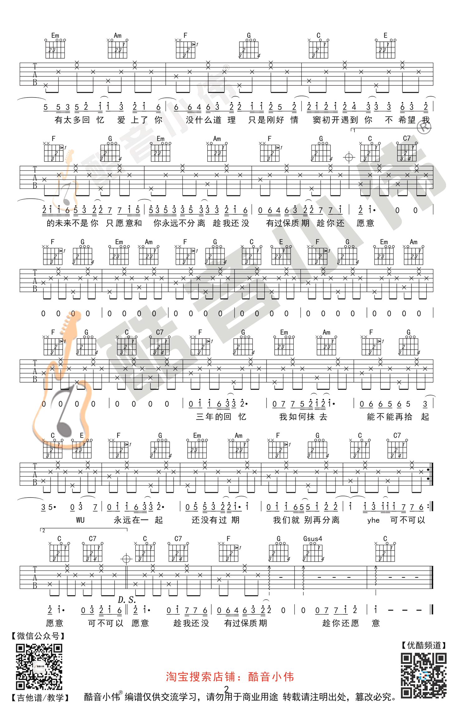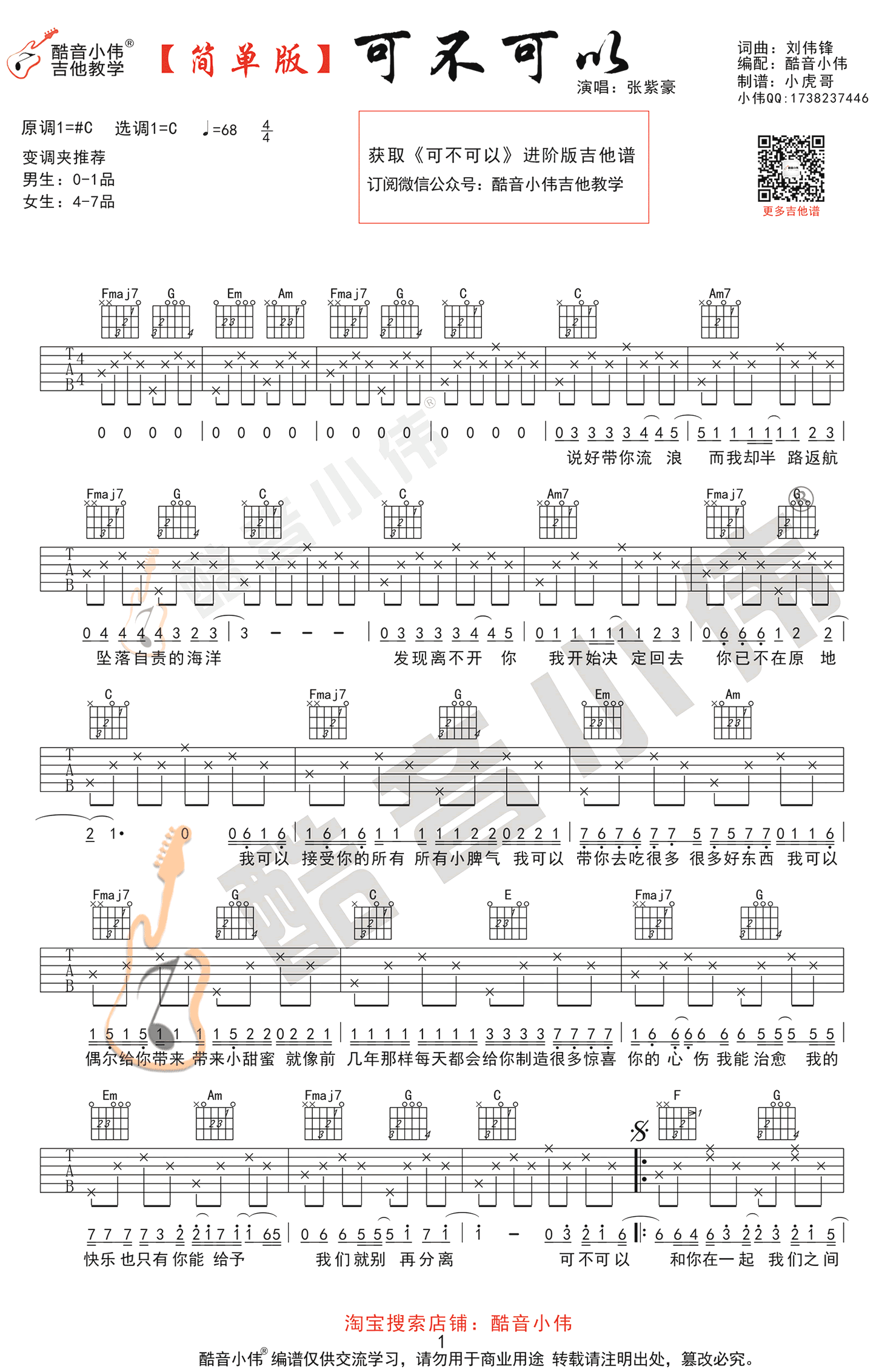 曲谱介绍: 可不可以吉他谱,C调简单版,张紫豪演唱的热门网络歌曲,可不可以六线谱,原调#C,选调C调,变调夹推荐,男生0-1品,女生4-7品。酷音小伟编配出品,91吉他谱网站上传分享。