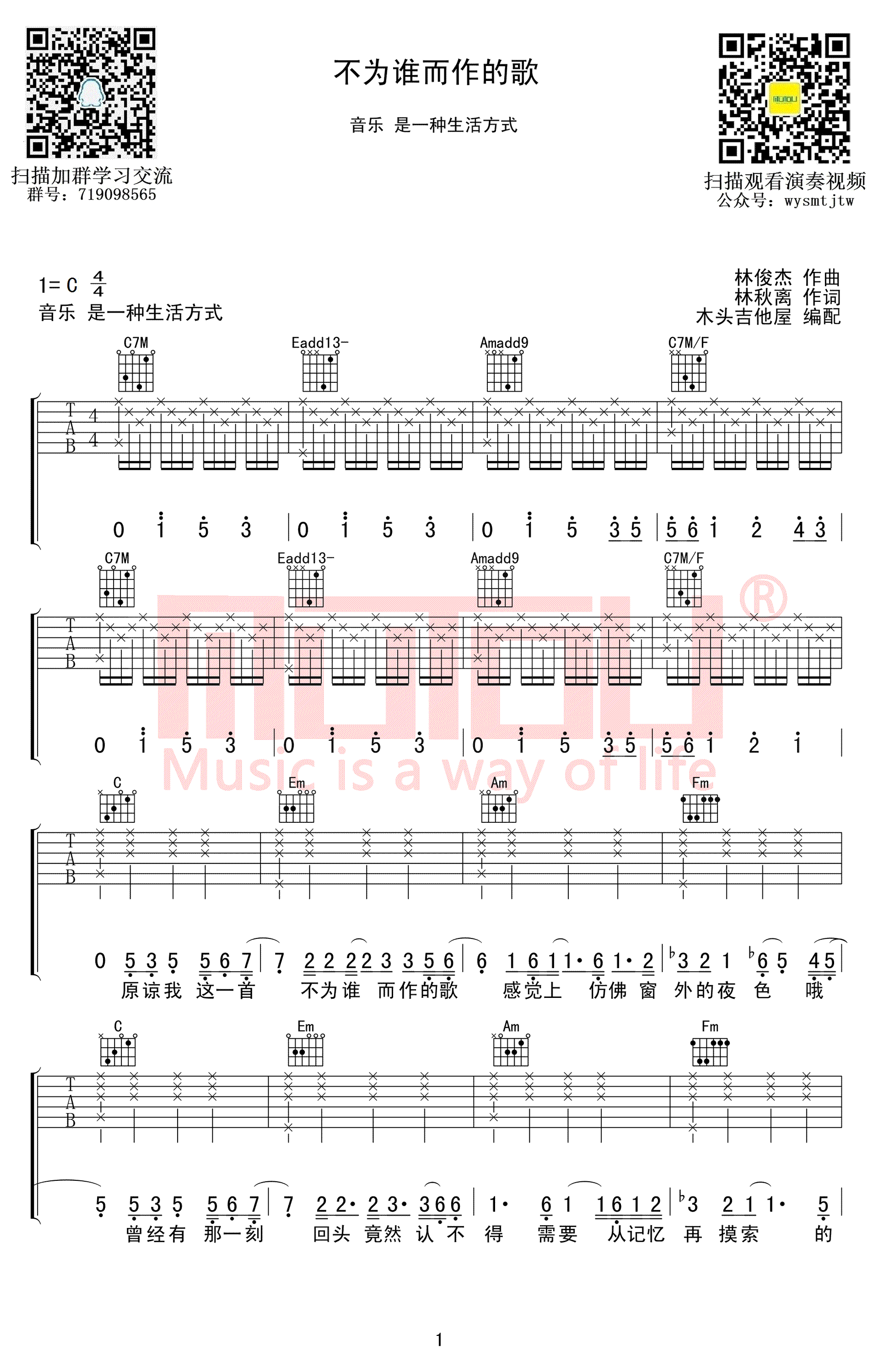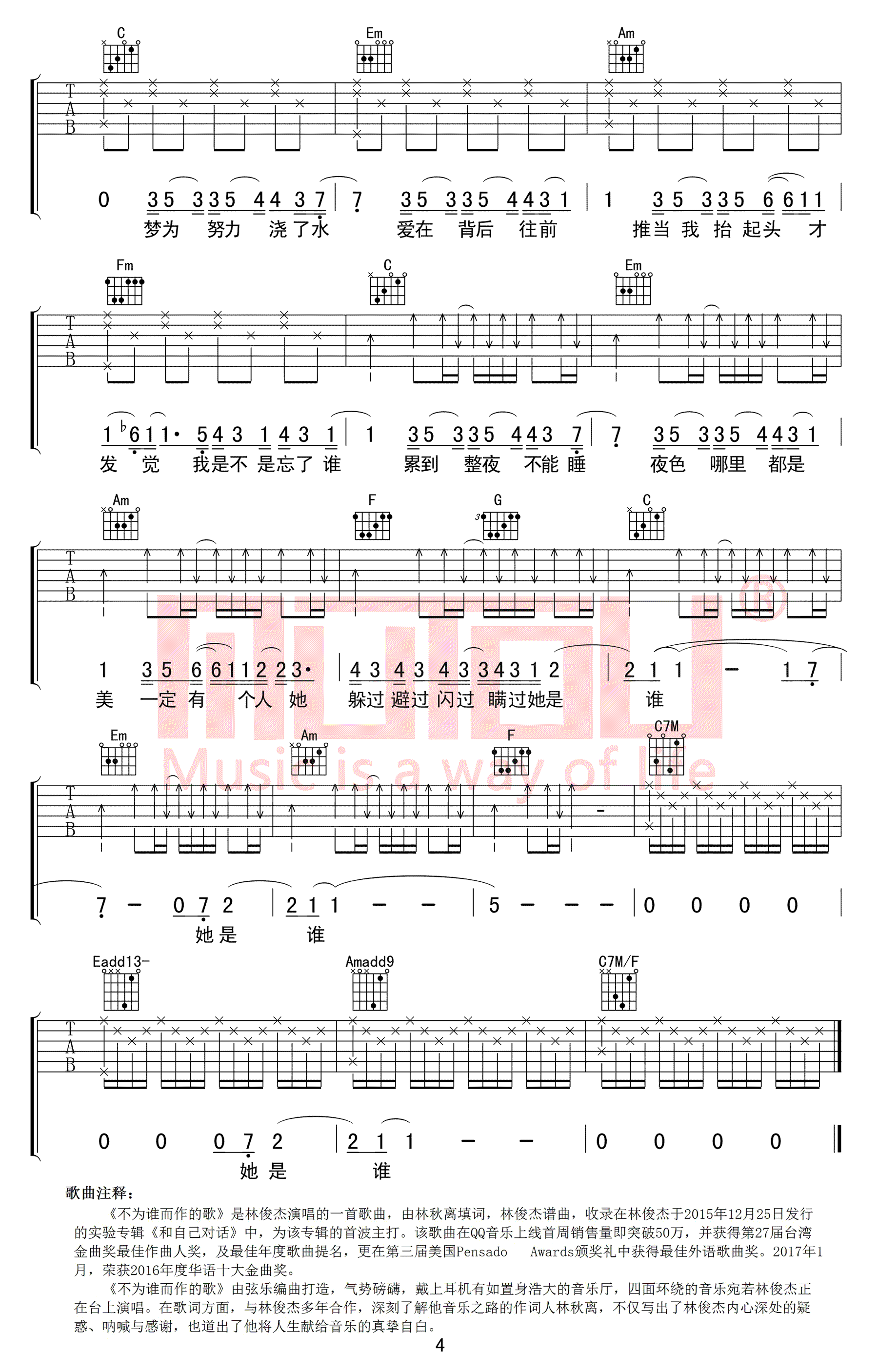 曲谱介绍: 不为谁而作的歌吉他谱,C调弹唱谱,林俊杰演唱,不为谁而作的歌六线谱,完整版本共四张图片谱,感谢木头吉他屋编配出品,91吉他谱上传分享。 这首歌就像是自己跟自己的对话,不断的反思,不断的感悟。不为谁而写的歌是写给我们每一个人的歌,里边有我们消沉低落的模样、有我们对梦想的坚持、有我们被身边人或陌生人感动到的泪光,这首歌里包含了太多太多的感情。