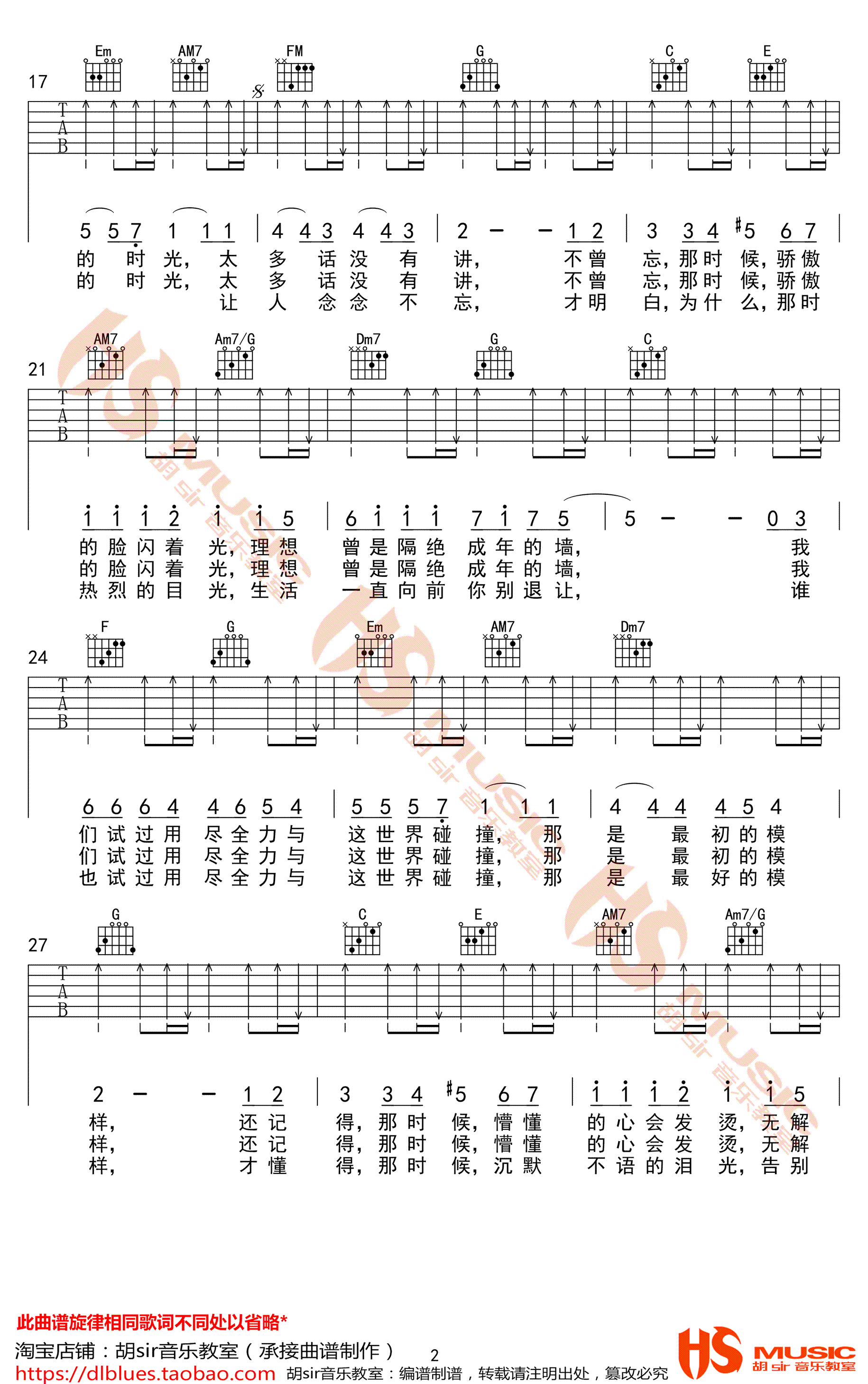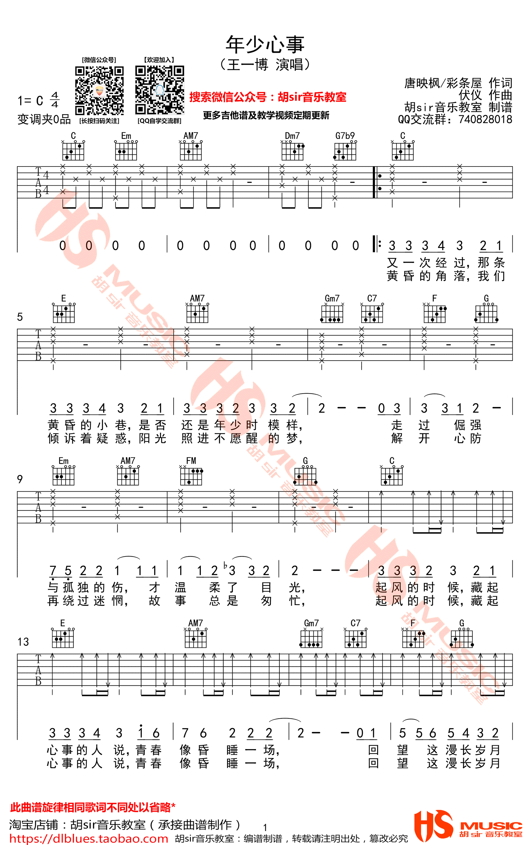 曲谱介绍: 年少心事吉他谱,王一博演唱,C调弹唱谱,青春动画电影《昨日青空》的一首青春成长曲,《年少心事》吉他六线谱,三张高清图片谱,感谢胡sir音乐教室出品,91吉他谱网站推荐收藏。 干净轻快的旋律,细致温暖的歌词,唱出我们青春时光懵懂却闪光的生活,那些少年的心事,那些为爱追逐的热血和勇气, 带引我们共同回忆美好难忘的青春时代。