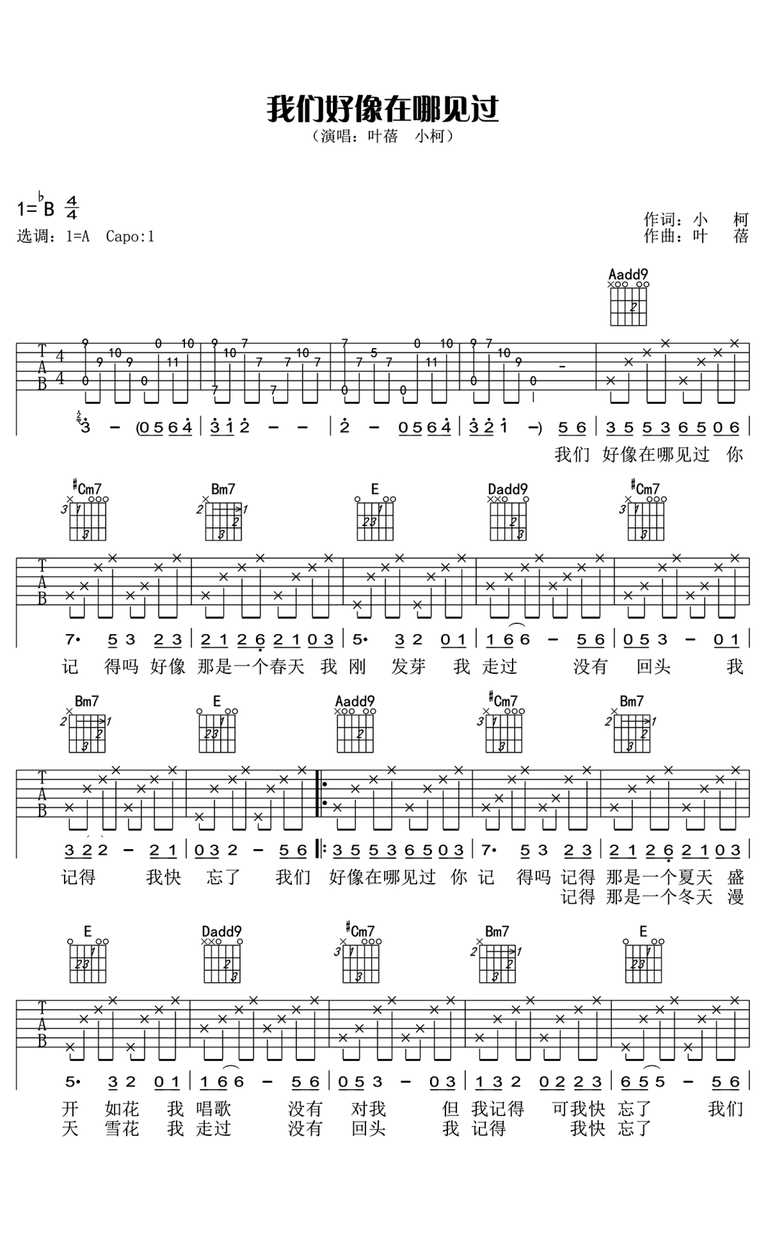 我们好像在哪见过吉他谱 - 小柯/叶蓓 - A调吉他弹唱谱