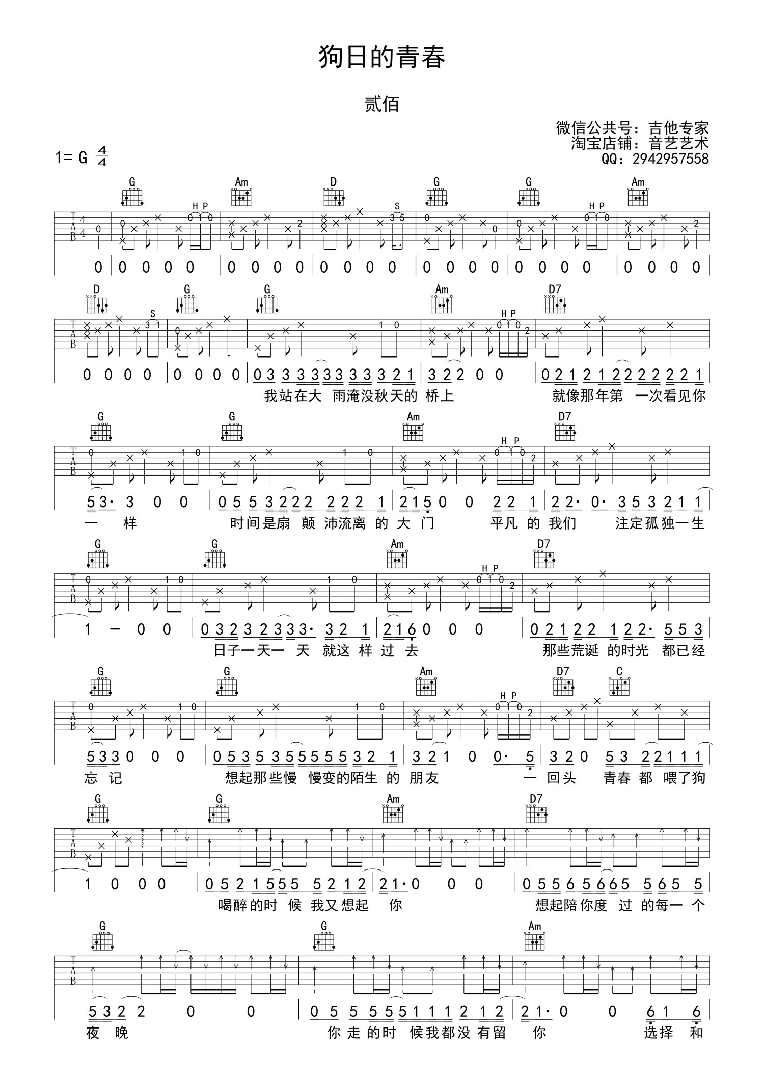 • 狗日的青春吉他谱 - 贰佰 - G调吉他弹唱谱第1张