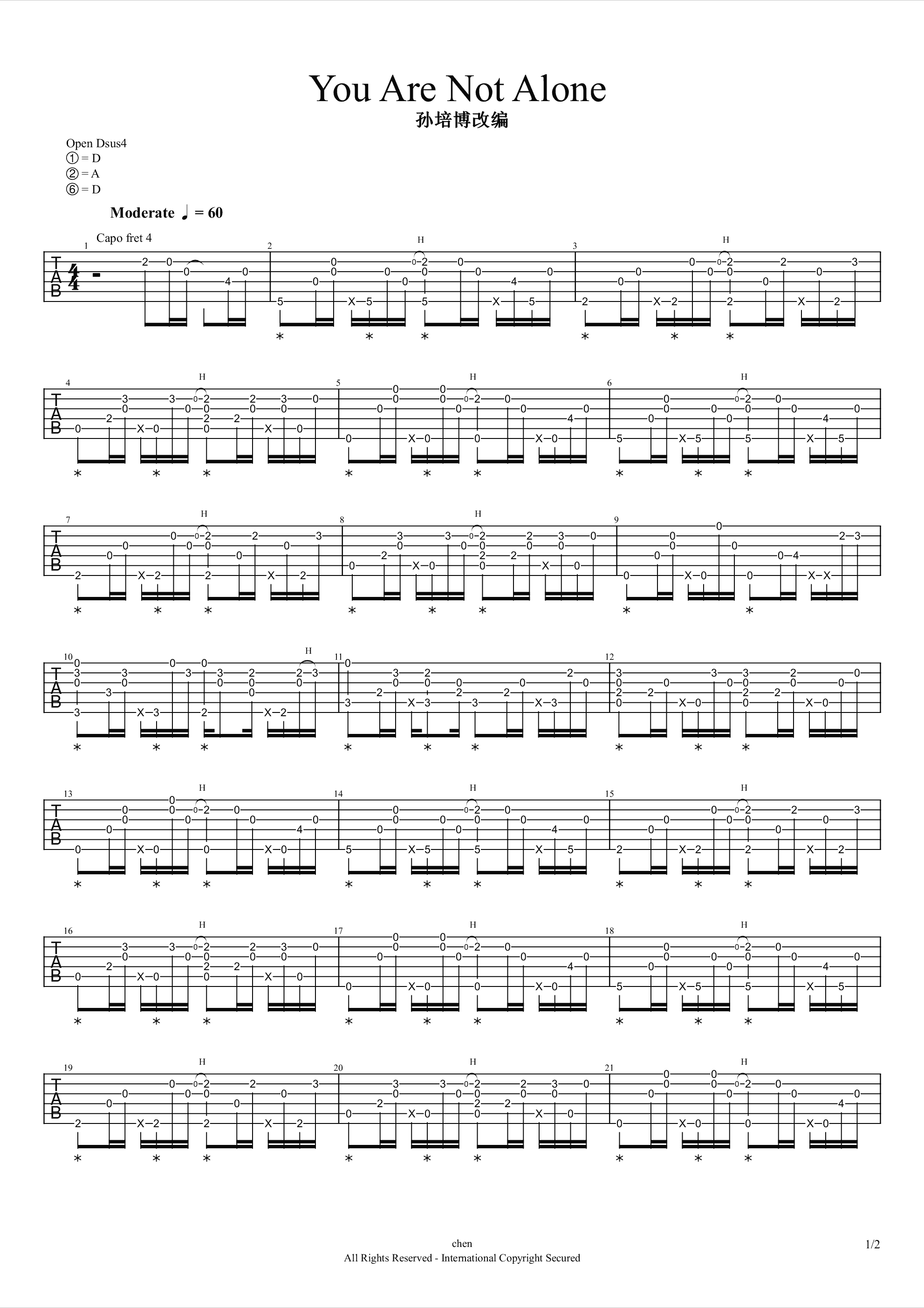 曲谱介绍: You Are Not Alone指弹谱,吉他谱,Michael Jackson的经典英文歌曲,You Are Not Alone吉他独奏谱,孙培博改编版本,随谱附上@chen_wz为大家带来的吉他翻弹视频,欢迎喜欢的琴友们点赞支持。流行音乐天王巨星迈克尔·杰克逊最杰出的作品之一,一首温暖的歌,送给孤单的你。