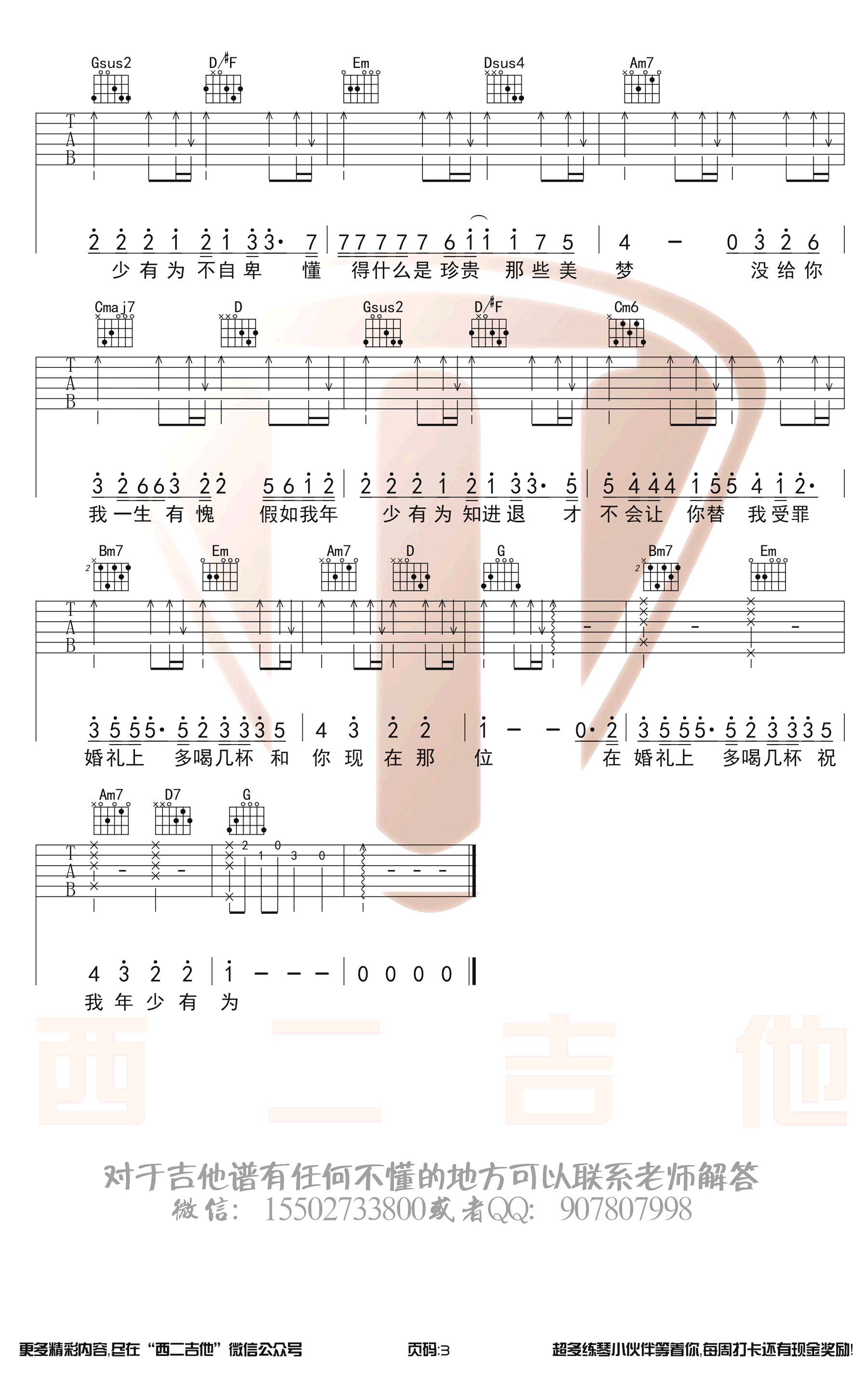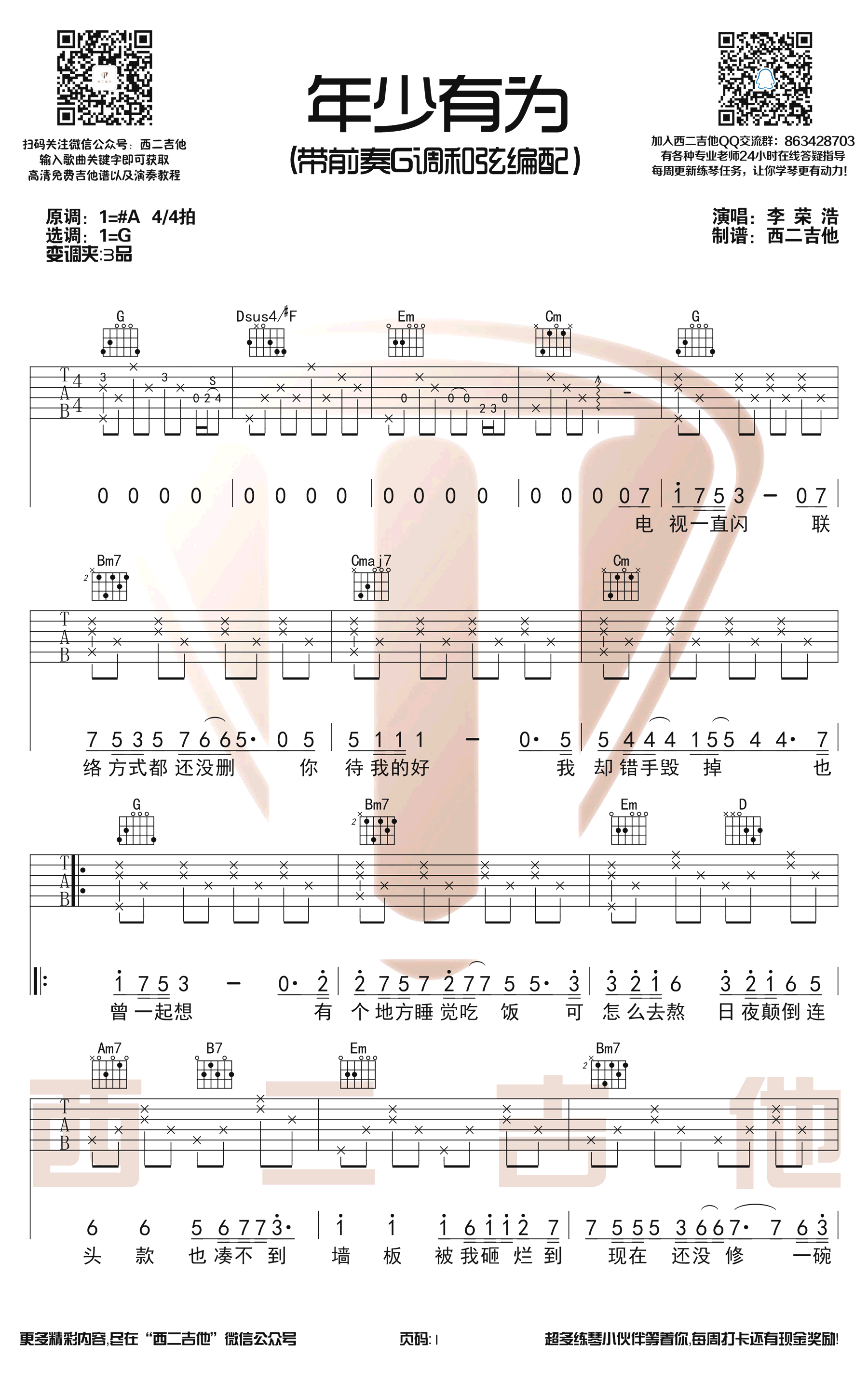 曲谱介绍: 年少有为吉他谱,李荣浩的一首热门歌曲,曲谱带简单前奏,G调和弦编配,变调夹夹三品,年少有为六线谱,三张弹唱图片谱,西二吉他出品,91吉他谱网站上传。