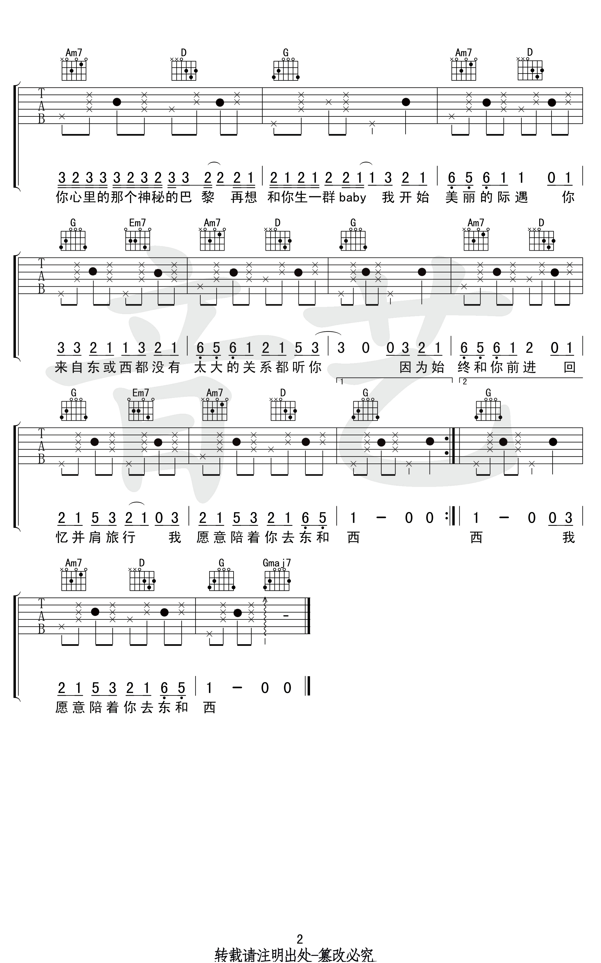 曲谱介绍: 林俊呈《东西》吉他谱,原调降A,选用G调指法编配,变调夹夹一品,少年温暖的歌声演绎动人甜蜜的爱情。东西吉他弹唱谱,高清图片六线谱,感谢音艺吉他编配,91吉他谱网站上传分享 一首撩妹必练曲目,清新欢快的曲调,唱出恋爱最单纯和美好的点点滴滴,将两人世界的浪漫都融入到歌曲的旋律里。