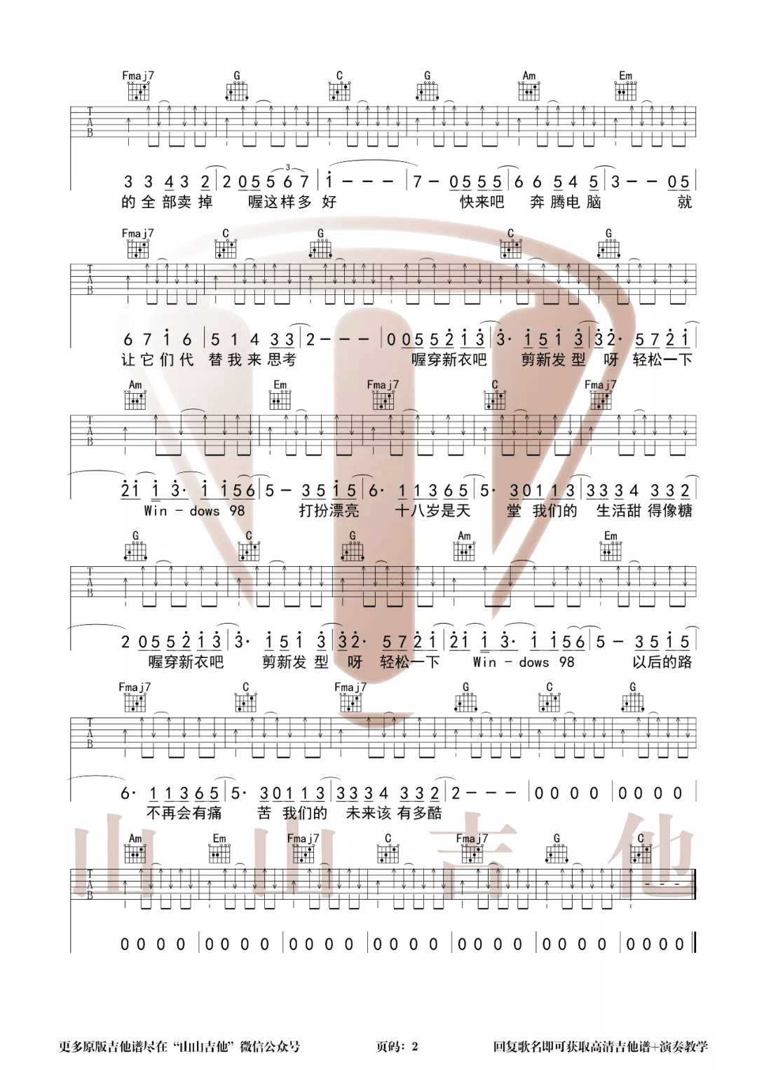 曲谱介绍: 吉他谱介绍:New-Boy吉他谱,朴树演唱的一首歌曲,4/4拍的节奏,这首歌曲的原调为D调,这里曲谱采用了C调指法进行编配,演唱时夹变调夹2品可回到原调,也可根据个人实际嗓音情况选择。曲谱由琴谱网更新上传,共2张高清图片弹唱吉他谱例,来源于@山山吉他编配出品。这首歌曲风明快,表现出一种一根筋式的快乐和简单,确实跟专辑其他曲目不太和谐。里面一句“就让它们代替我来思考”,隐隐也给人一种反讽的感觉。