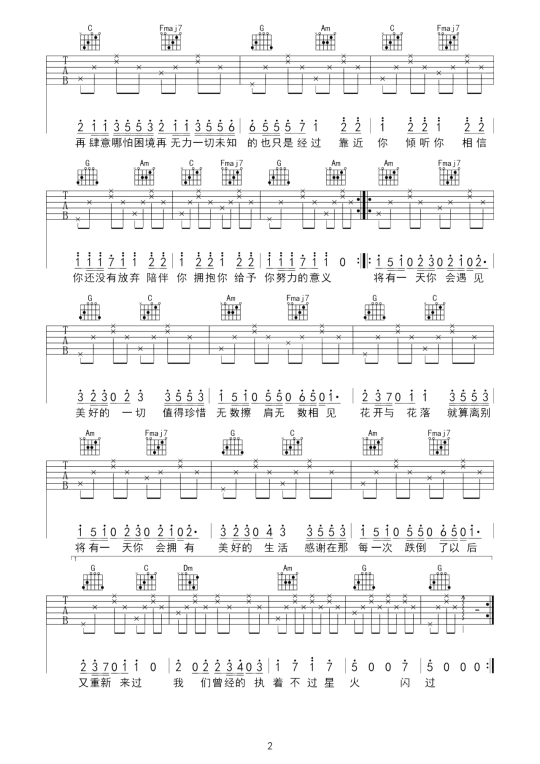 曲谱介绍: 吉他谱介绍:花落时相遇吉他谱,华晨宇演唱的一首歌曲,4/4拍的节奏,这首歌曲的原调为C调,这里曲谱采用了C调指法进行编配,演唱时可不夹变调夹,曲谱由琴谱网更新上传,共3张高清图片弹唱吉他谱例,曲谱来源于网络转载,编配制谱者暂不详。时光列车不会停泊,沿途的风景会出现新的美丽。温柔的钢琴声中,有人轻轻呼唤你的名字。靠近你、倾听你、相信你、还没有放弃;陪伴你、拥抱你、给予你、努力的意义。