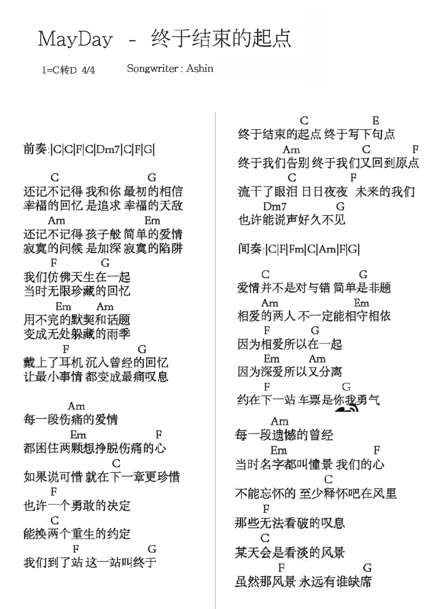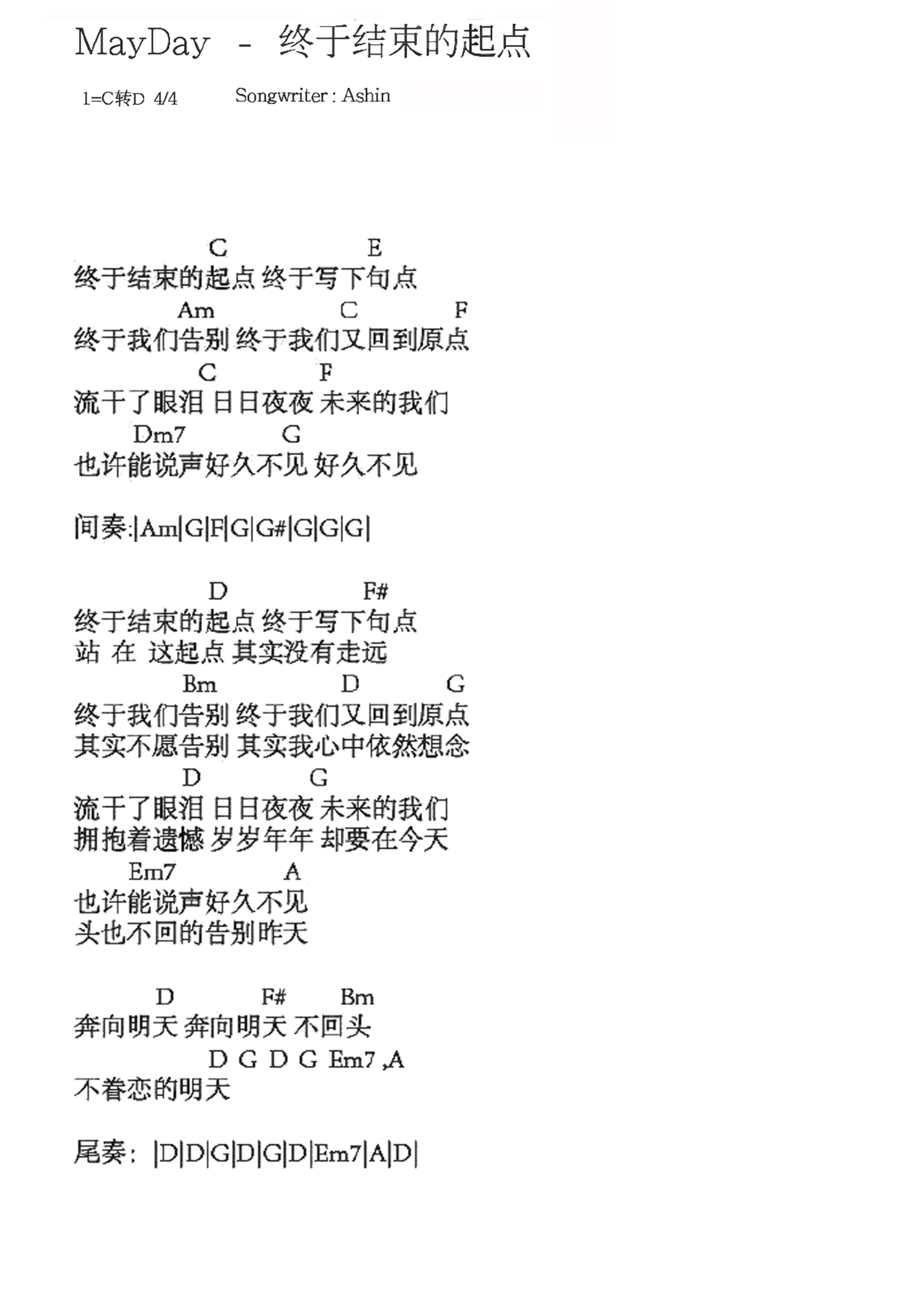 终于结束的起点吉他谱 - 五月天 - C调吉他弹唱谱 - 和弦谱