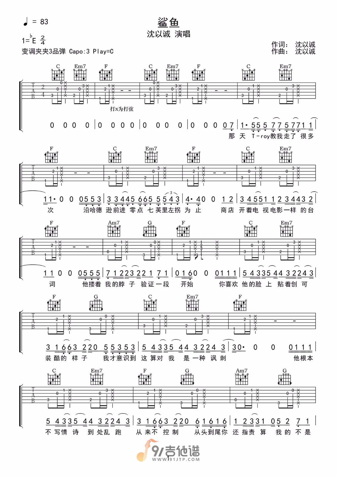 曲谱介绍: 曲谱简介:鲨鱼吉他谱,沈以诚演唱的一首歌曲,2/4拍的节奏,这首歌曲的原调为降E调,这里曲谱采用了C调指法进行编配,演唱时夹变调夹3品可回到原调,也可根据个人实际嗓音情况选择。曲谱由琴谱网更新上传,共4张高清图片弹唱吉他谱例,曲谱来源于网络转载,编配制谱者暂不详。听完这首歌之后,感觉这首歌的歌词内容和歌名有点无关,可能有什么另外的含义,不知道有没有琴友听懂呢?
