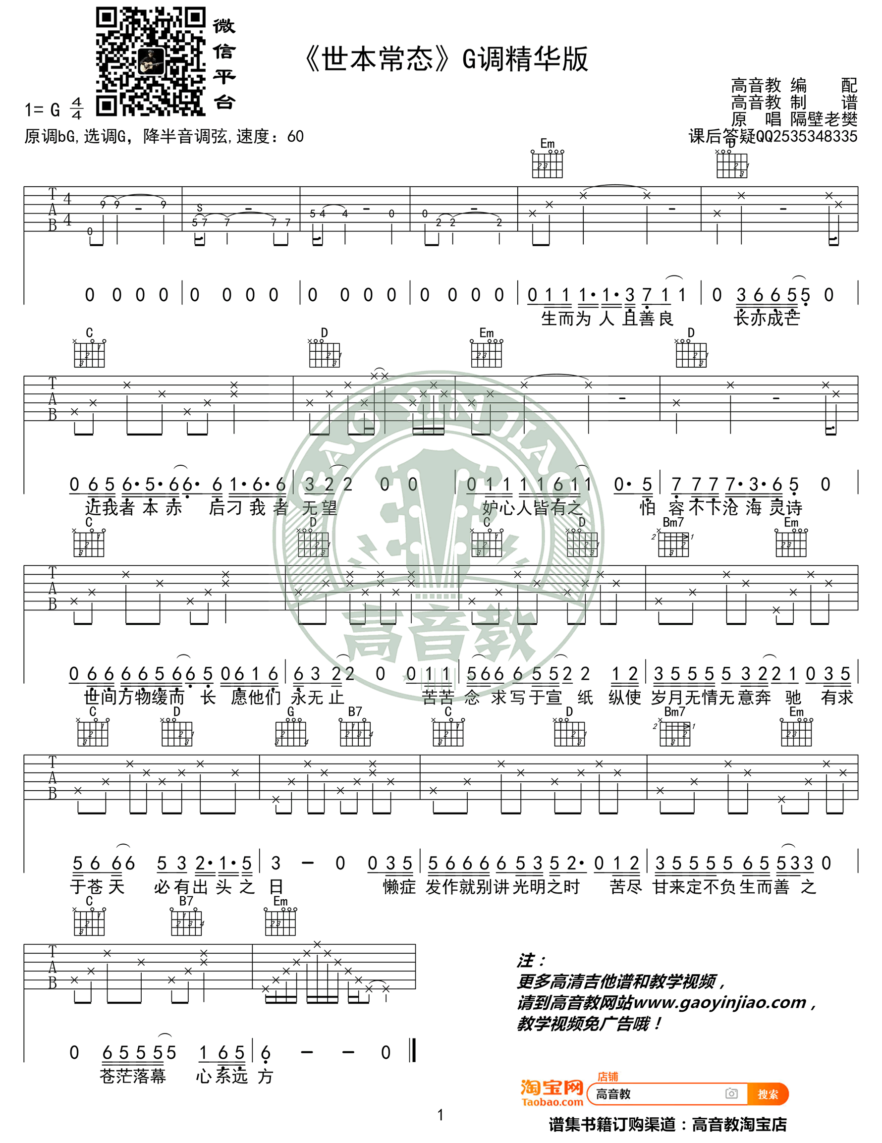曲谱介绍: 《世本常态》吉他谱,隔壁老樊演唱,原调bG,选调G,降半音调弦,世本常态六线谱,精华版编配,感谢高音教出品,91吉他谱上传更新。 樊凯杰词曲创作的单曲,寥寥数句,将人生道理尽数藏于歌中,一字一词轻轻触动听者内心,沧桑的嗓音,让人细细品味,在平庸的生活中给大家一个温暖的拥抱。