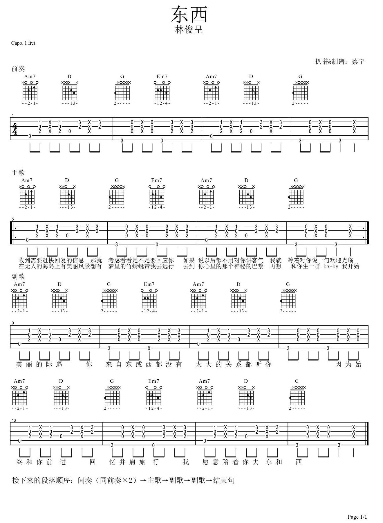 曲谱介绍: 东西吉他谱,林俊呈演唱,一首抖音热门歌曲,G调指法,Capo夹一品。东西六线谱,感谢蔡宁老师编配,这个版本是比较容易上手的,整首歌曲只用到了四个和弦,喜欢的朋友一起来学吧,弹唱教学视频中讲到了一些注意的细节,供朋友们参考~